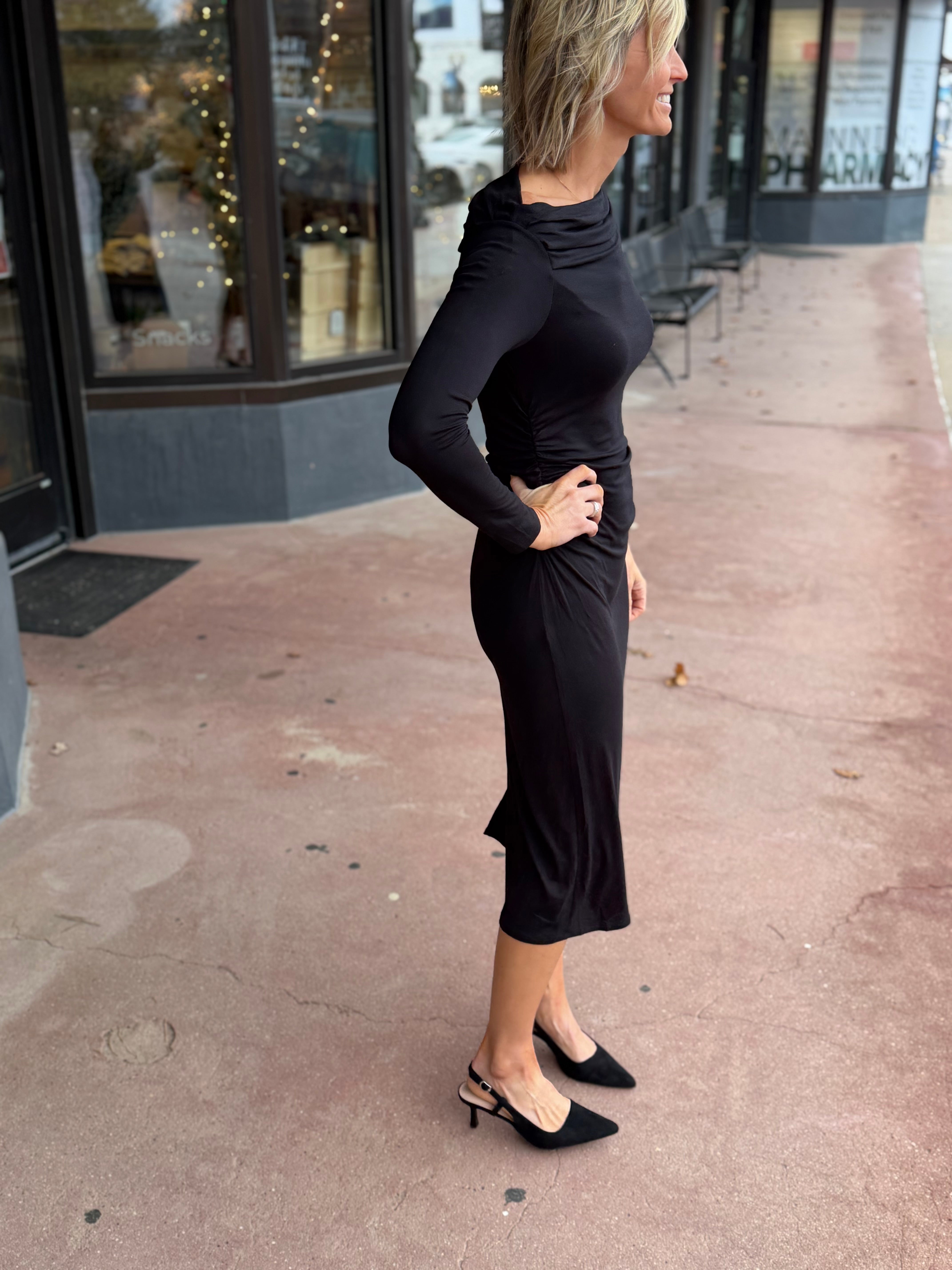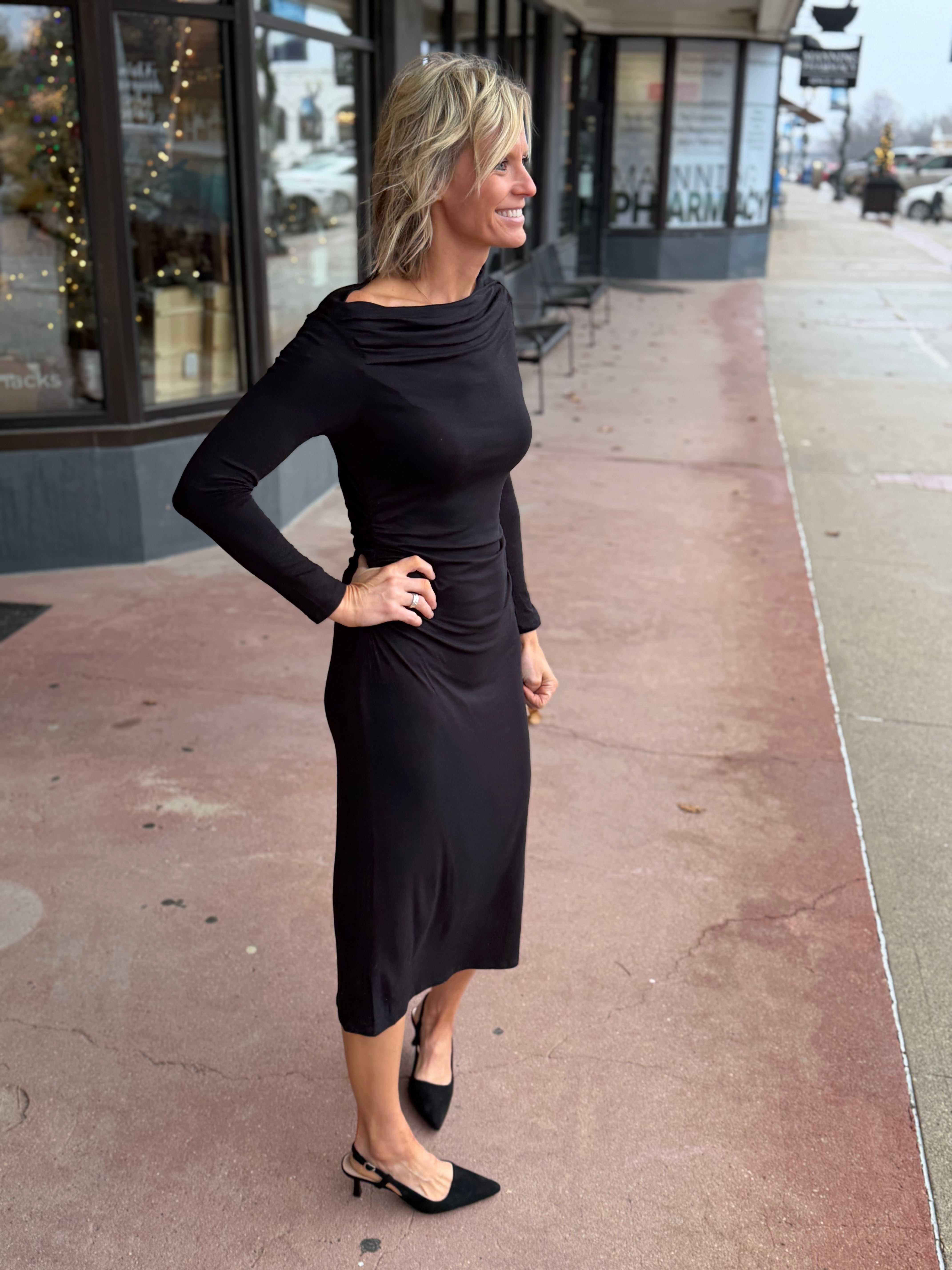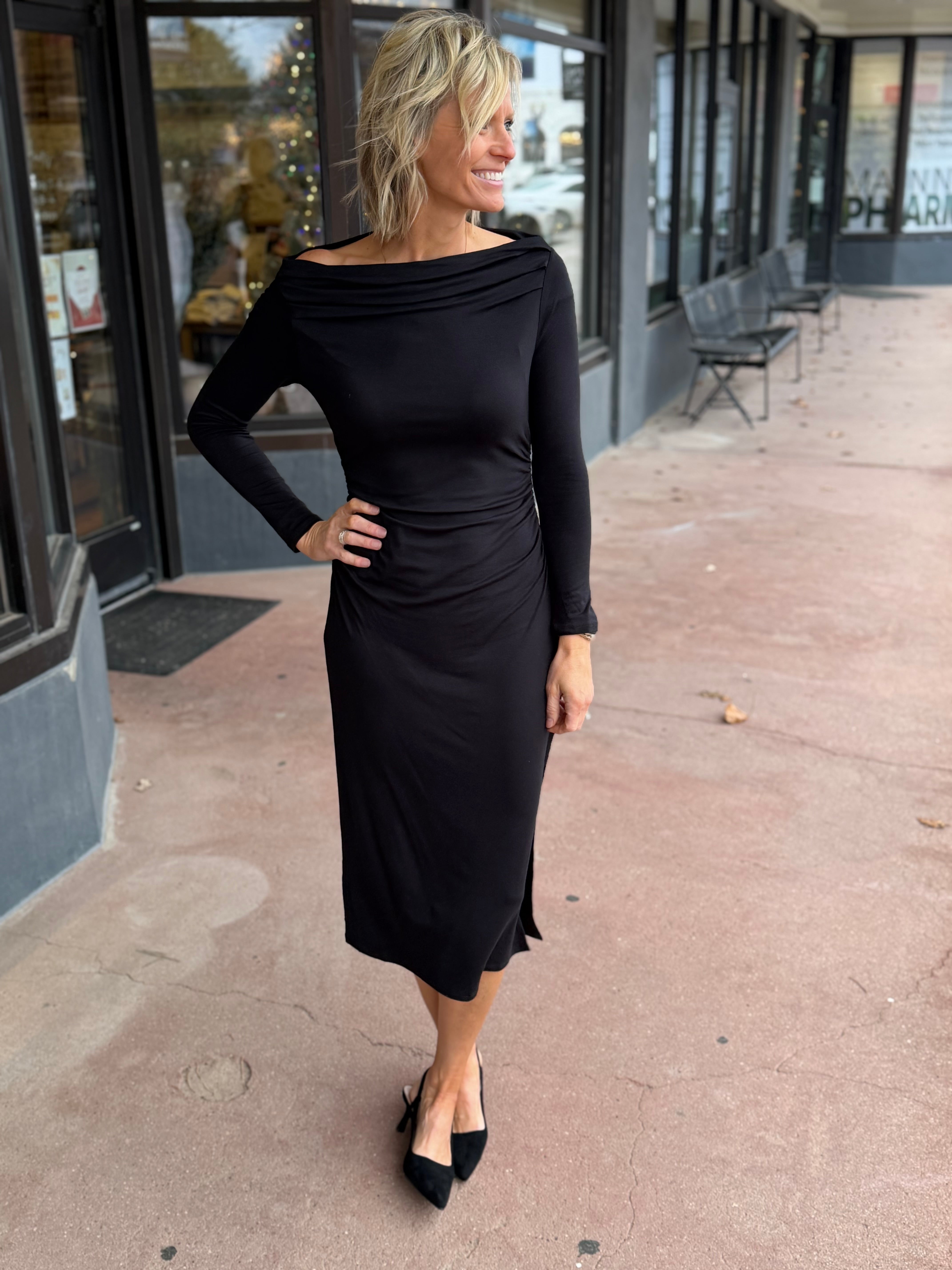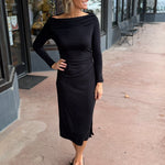 Turn heads in this stunning black off-shoulder maxi dress that screams elegance with a cheeky twist. Long sleeves keep things sophisticated while the off-shoulder neckline flaunts your collarbones in the most glamorous way possible. The flowing maxi silhouette skims your curves beautifully, making it your go-to for date nights, parties, or whenever you want to feel absolutely fabulous. Timeless black never looked so good.