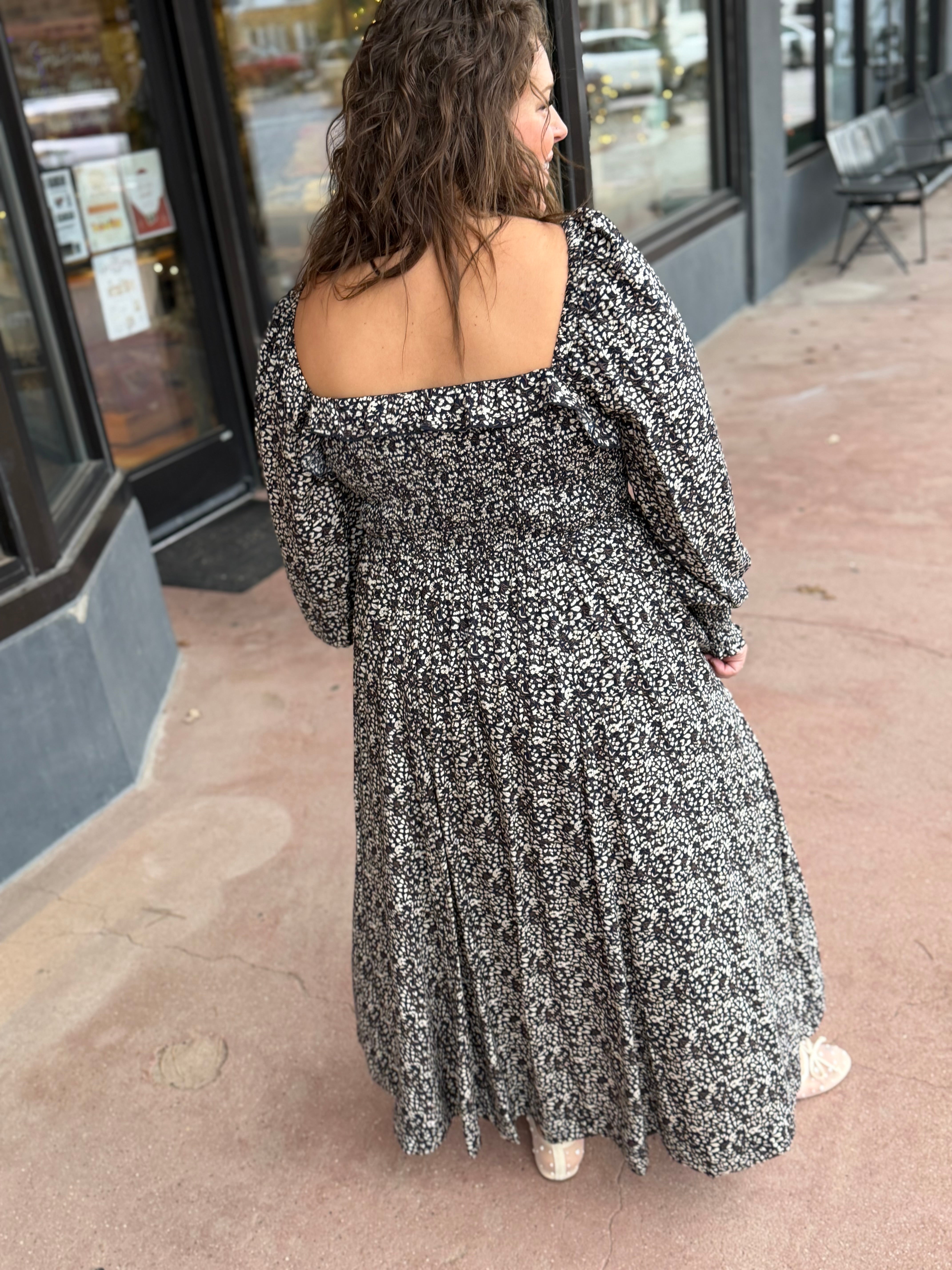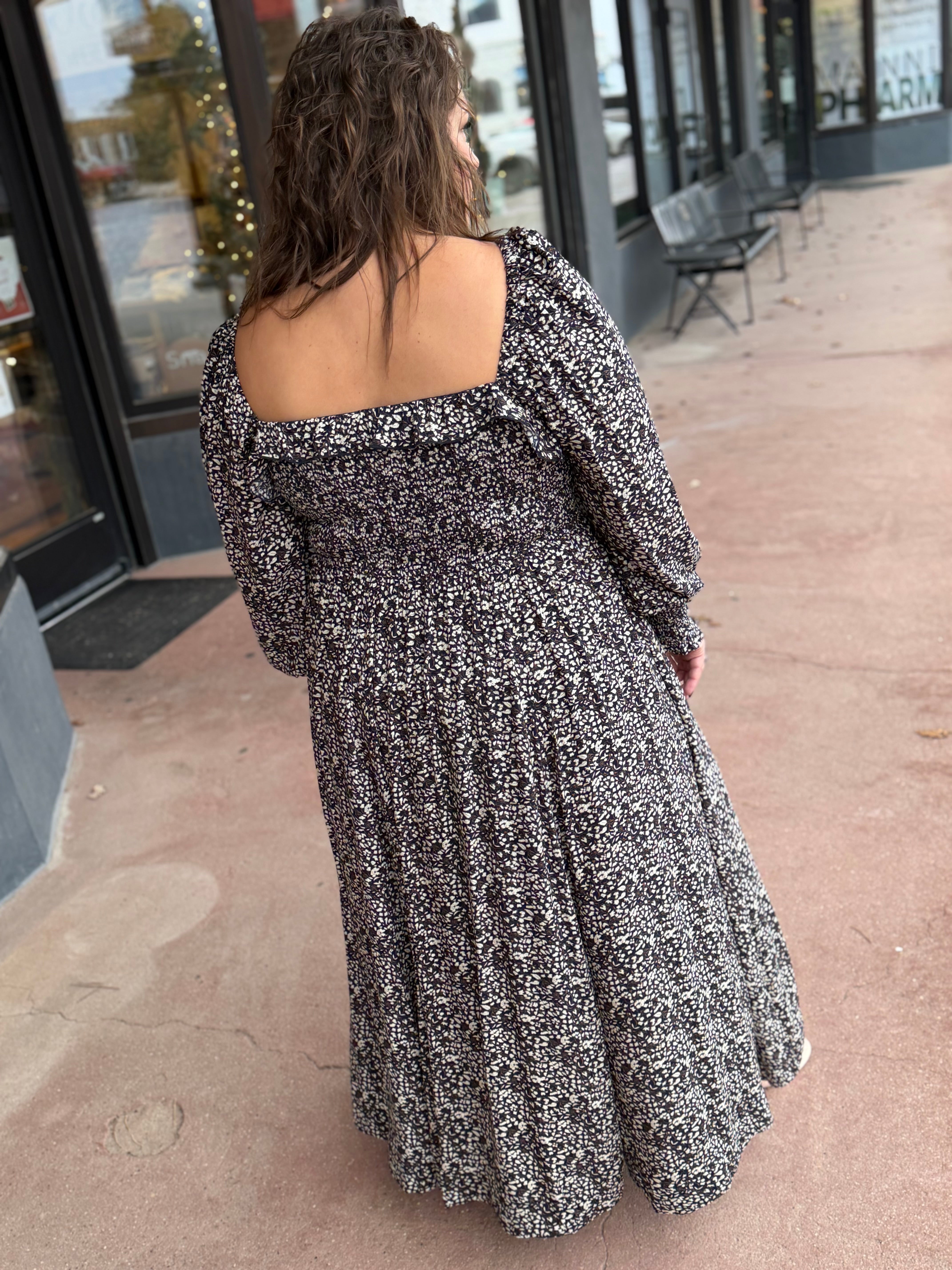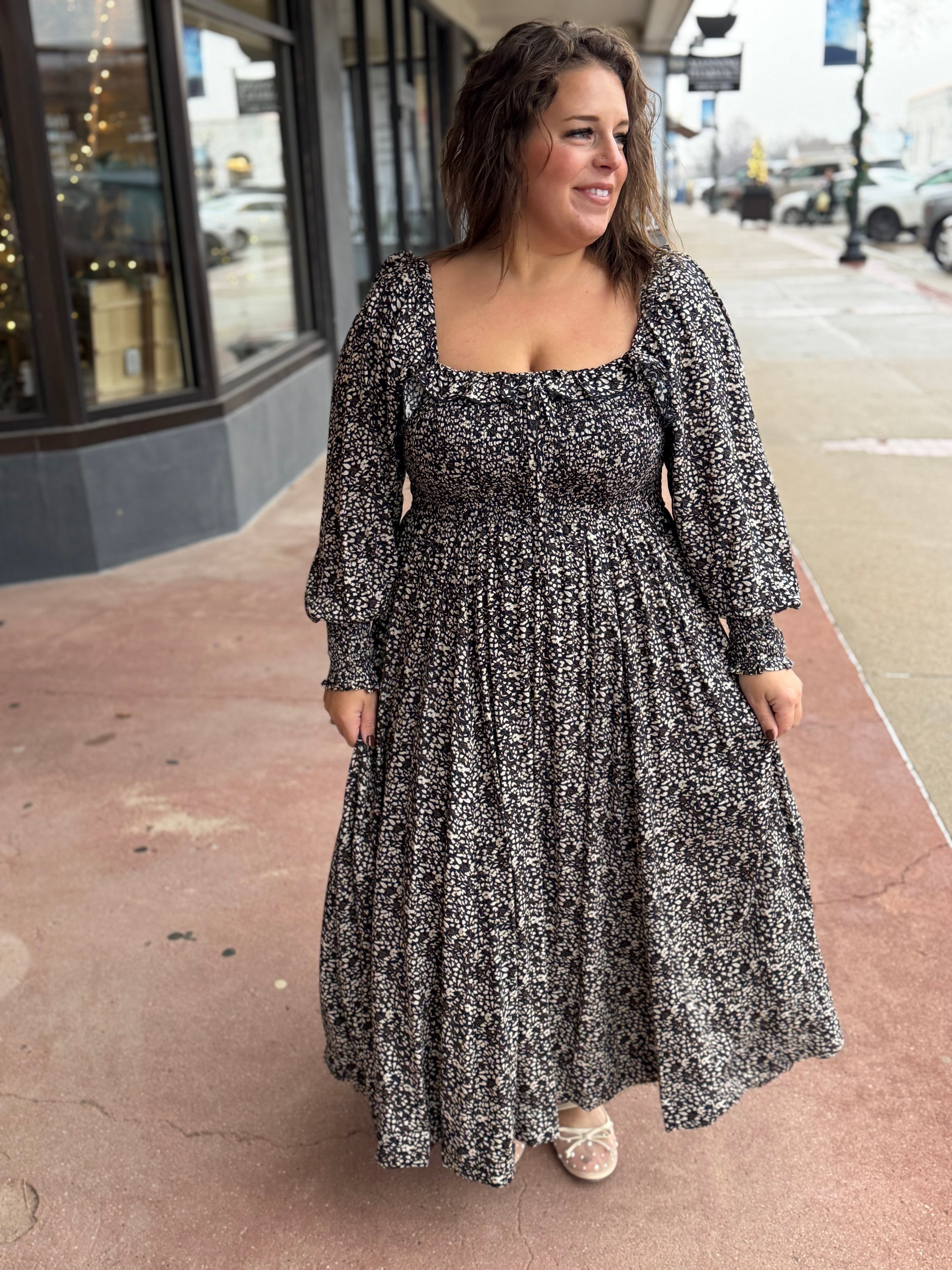 Twirl into the night in this stunning smocked maxi dress that's equal parts romantic and effortlessly chic. The midnight hue creates a dramatic canvas for delicate floral details, while the smocked bodice hugs you in all the right ways. Ruffled layers add movement and dimension, making every step feel like a dance. Perfect for date nights, garden parties, or whenever you want to feel absolutely fabulous. This dress is your new go-to for looking polished without trying too hard.