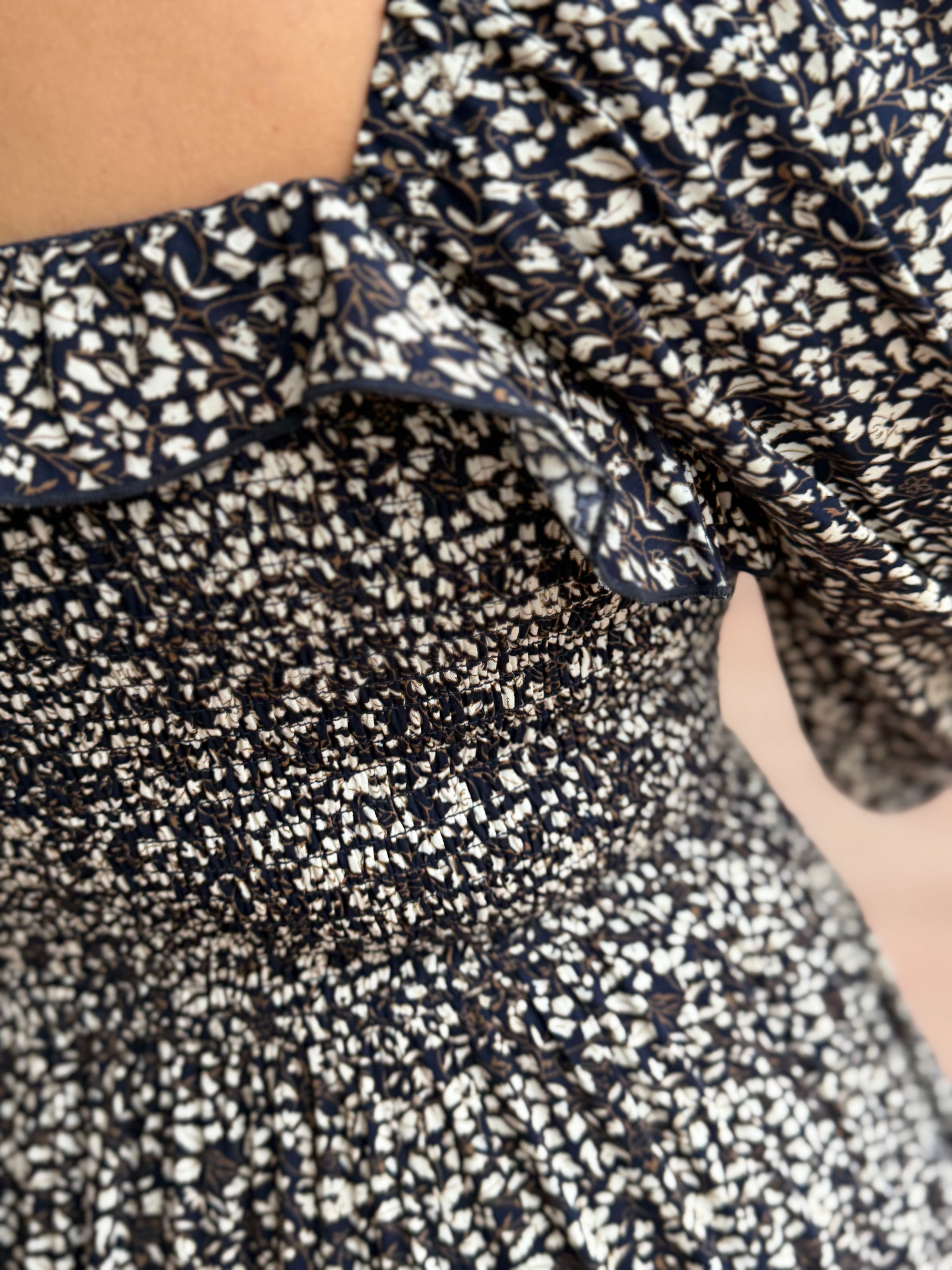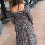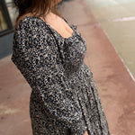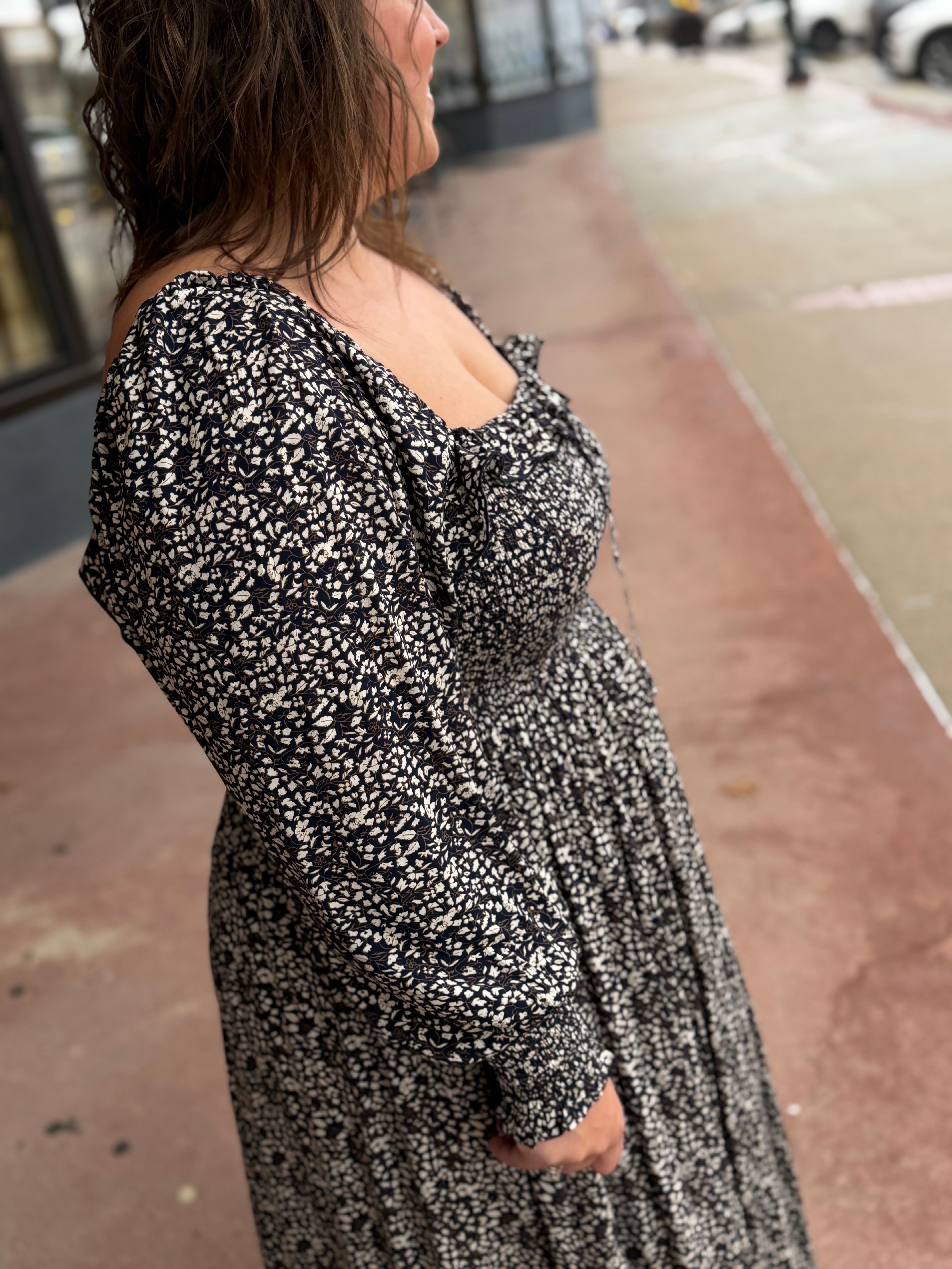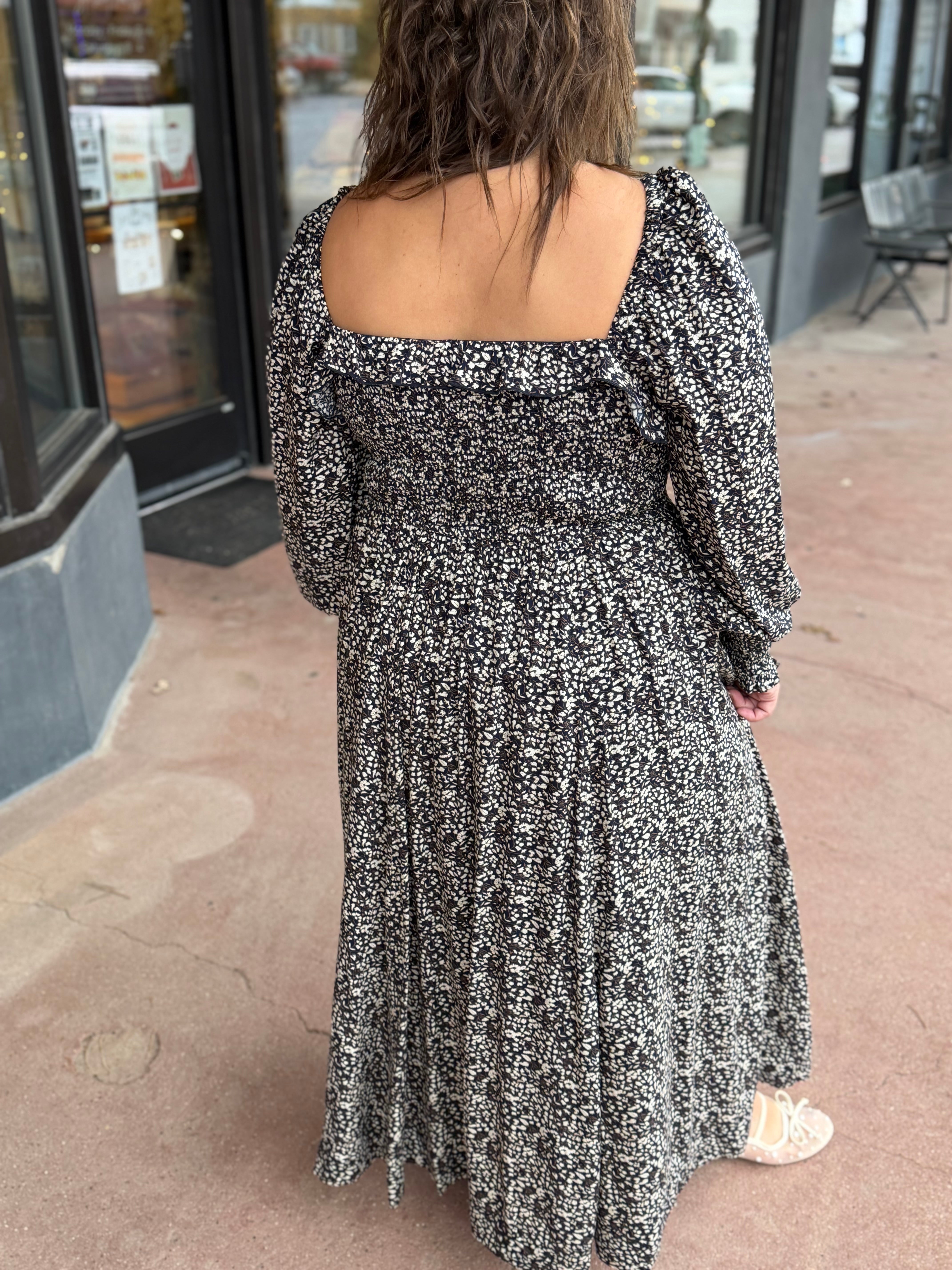 Twirl into the night in this stunning smocked maxi dress that's equal parts romantic and effortlessly chic. The midnight hue creates a dramatic canvas for delicate floral details, while the smocked bodice hugs you in all the right ways. Ruffled layers add movement and dimension, making every step feel like a dance. Perfect for date nights, garden parties, or whenever you want to feel absolutely fabulous. This dress is your new go-to for looking polished without trying too hard.