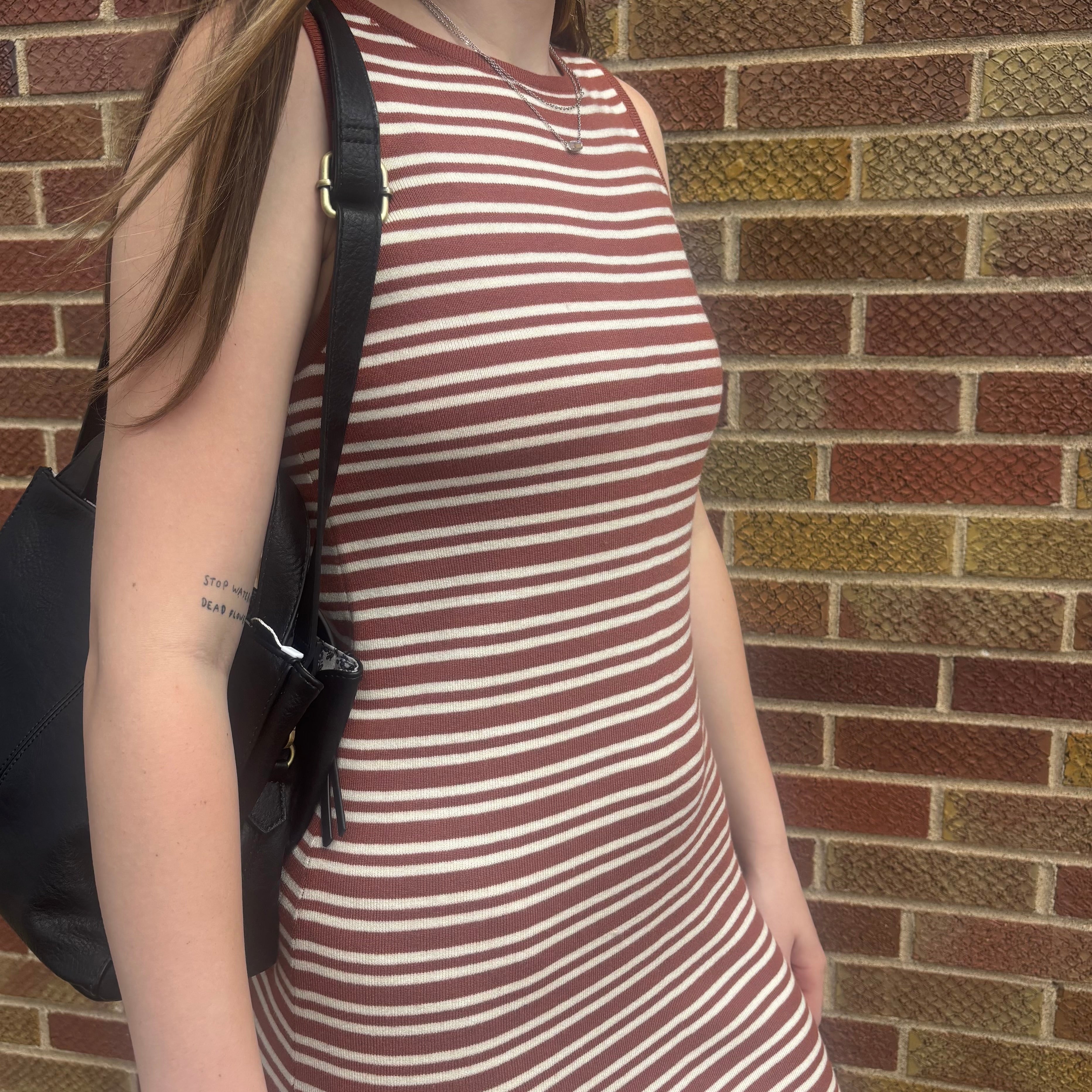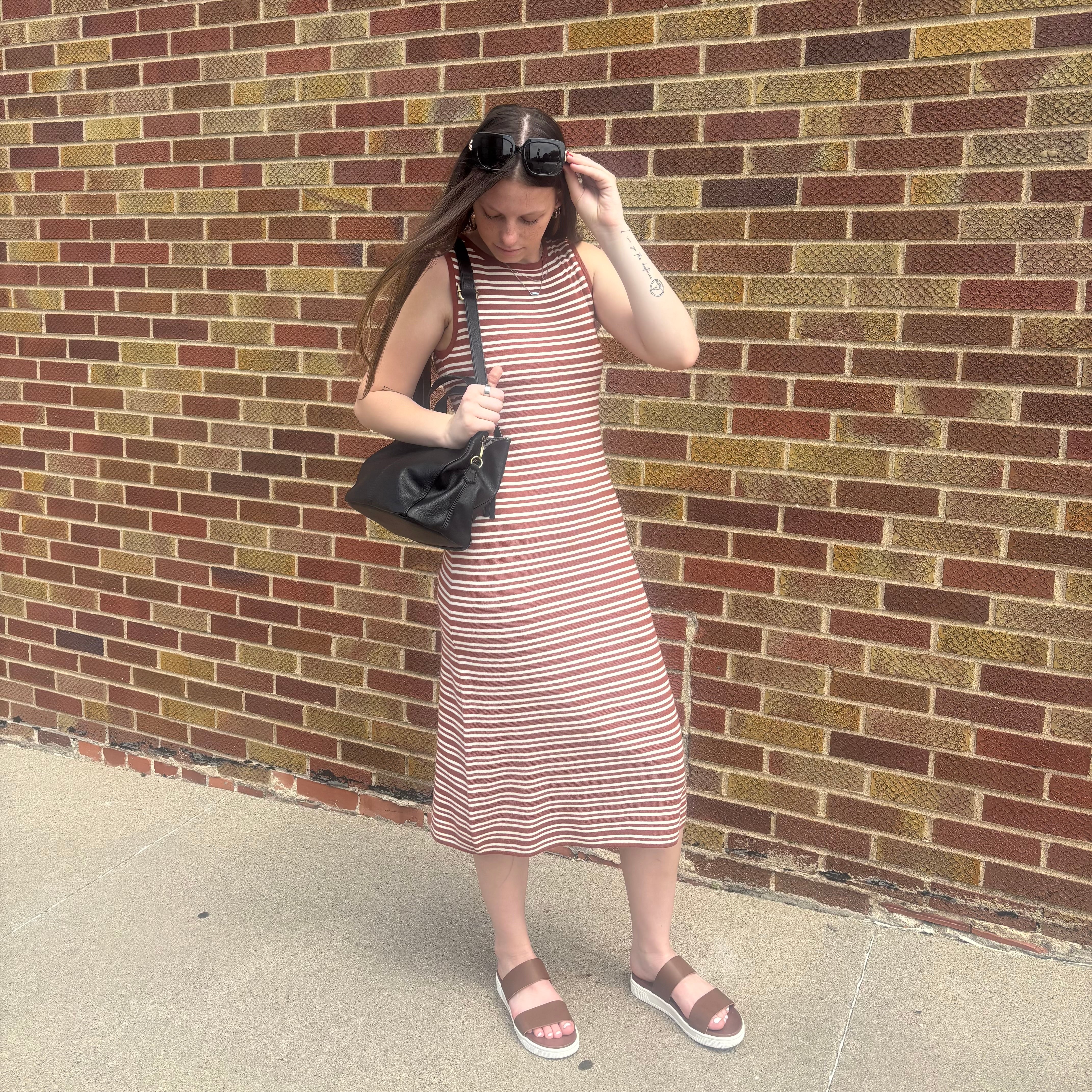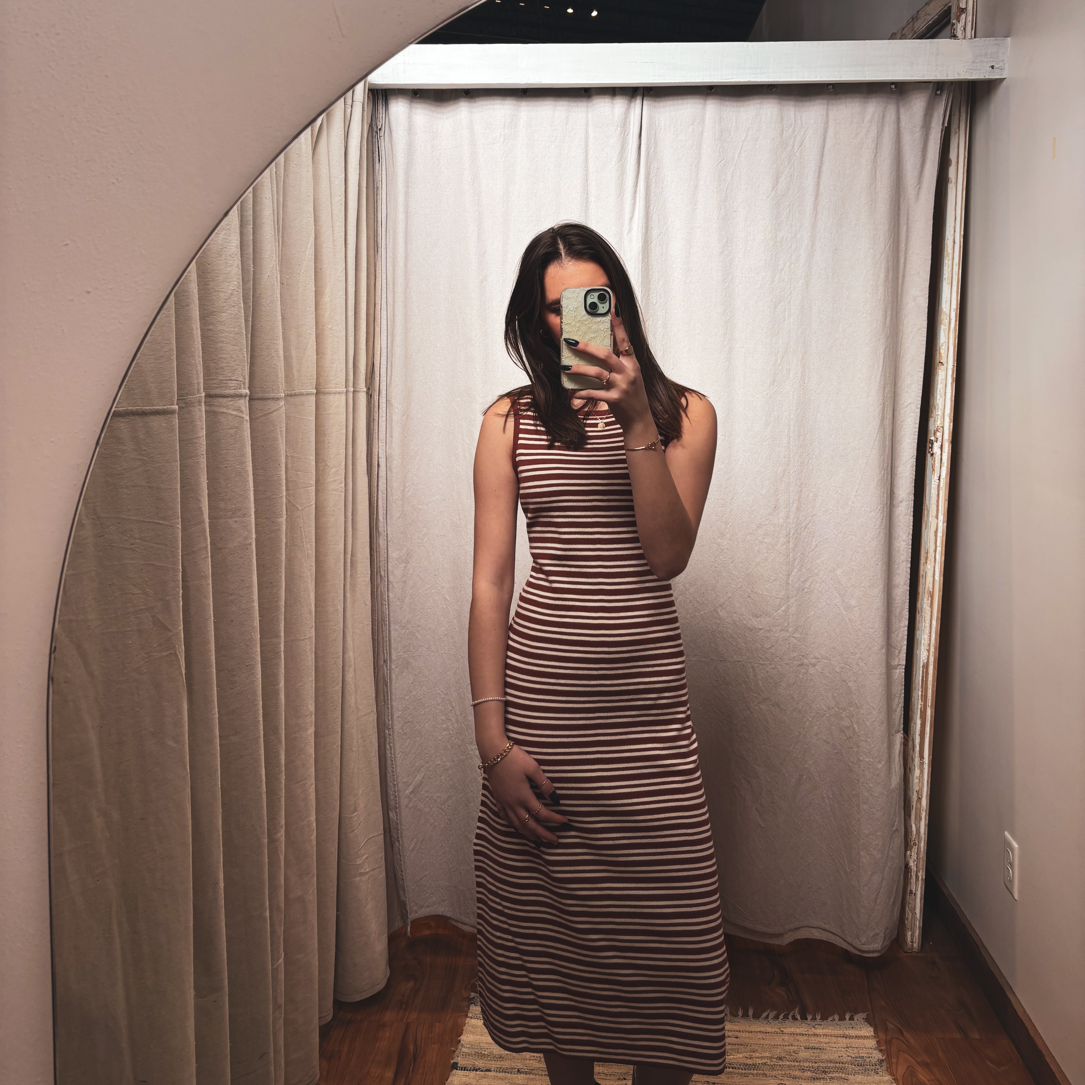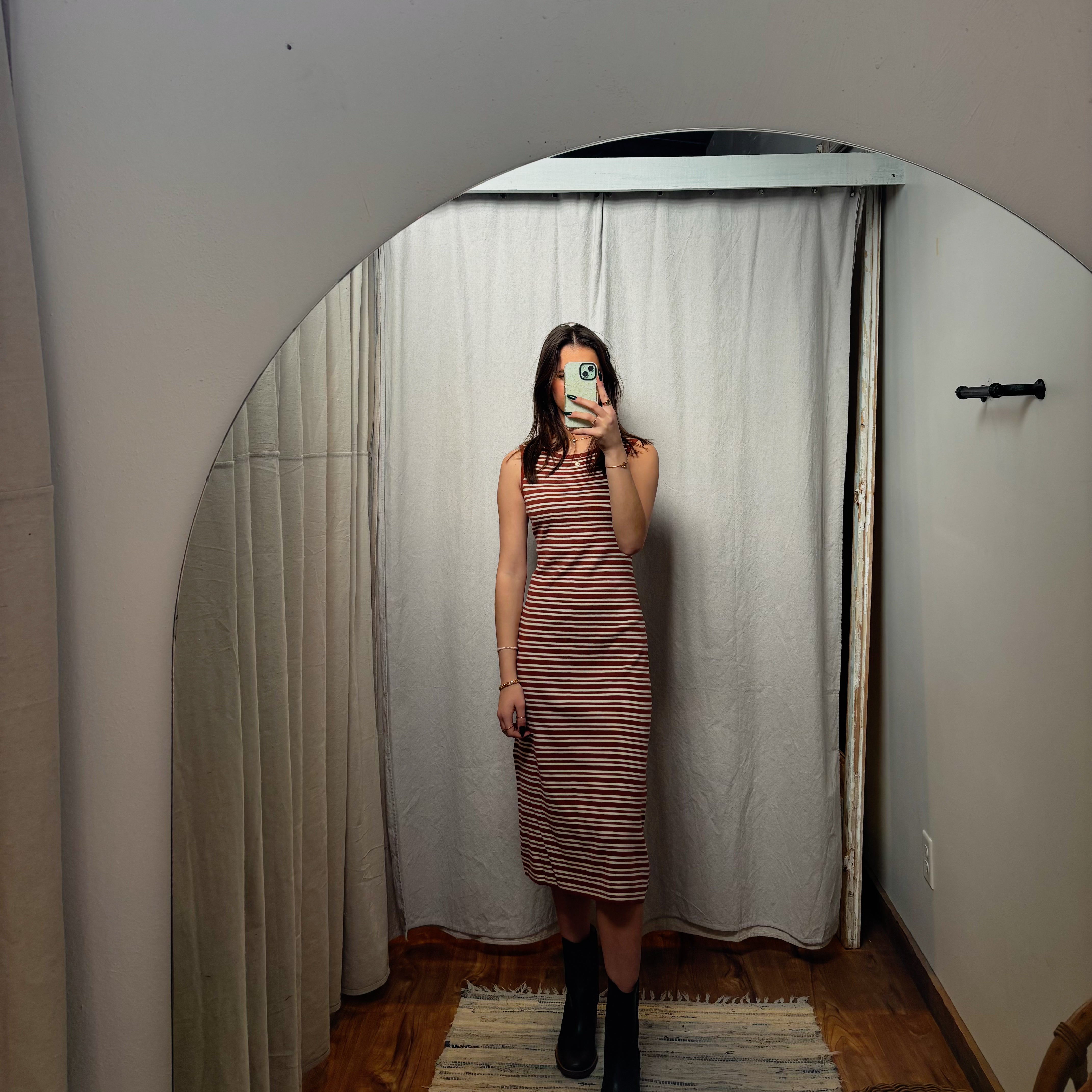 Expertly crafted with comfort and style in mind, our Striped Tank Midi Dress is a must-have for any wardrobe. Made with soft and lightweight fabric, this dress is perfect for any occasion. The classic striped pattern and flattering mid length make it a versatile and timeless piece.