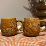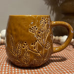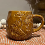 This food-safe 12-ounce brown mug features detailed embossed foliage designs available in either Maple or Ruscus patterns.The rich brown finish provides excellent heat retention and complements the natural motifs, making it suitable for both casual use and refined table settings.