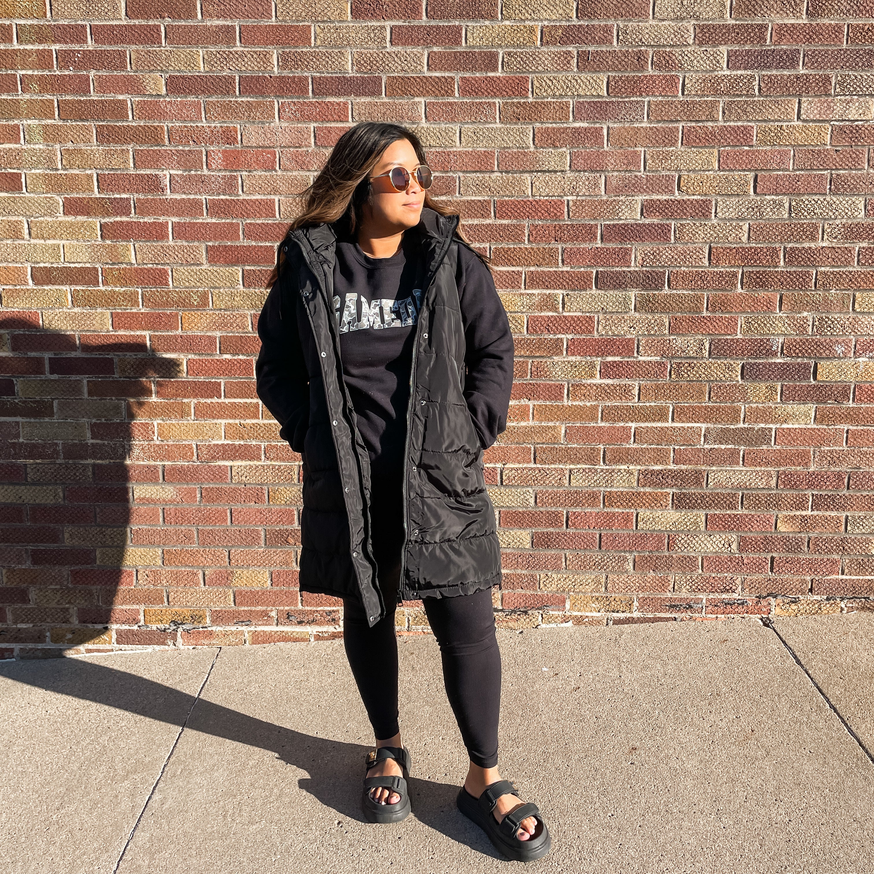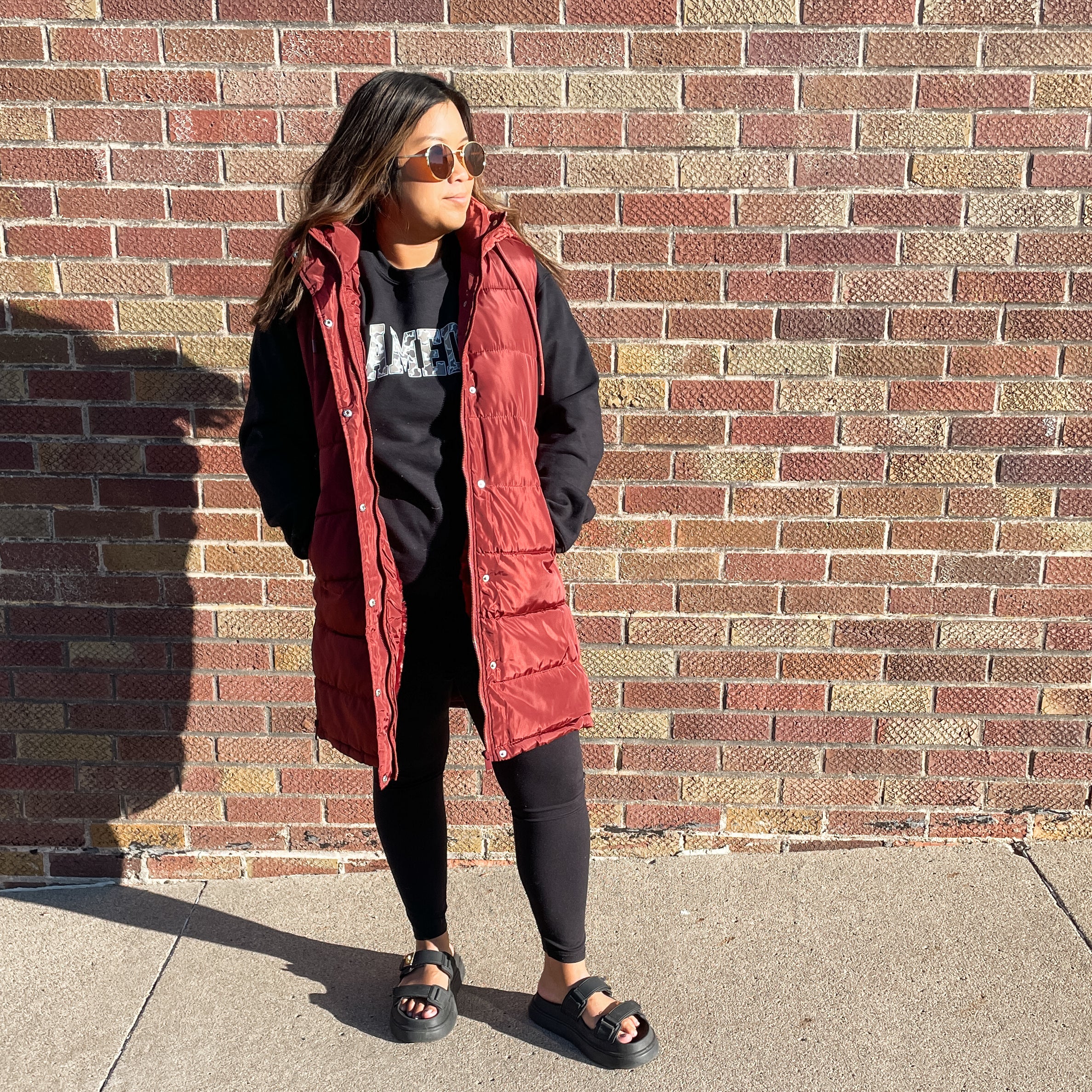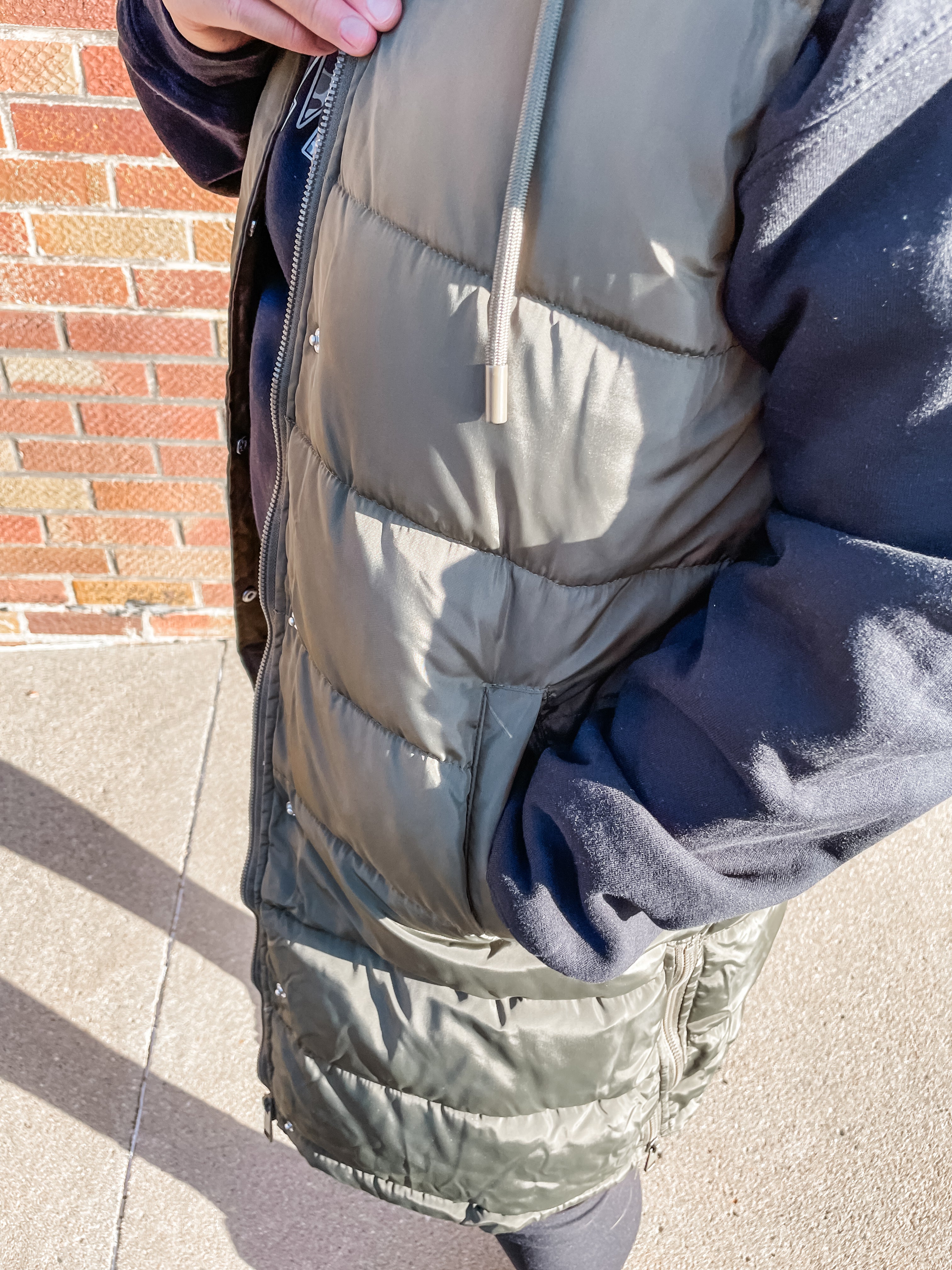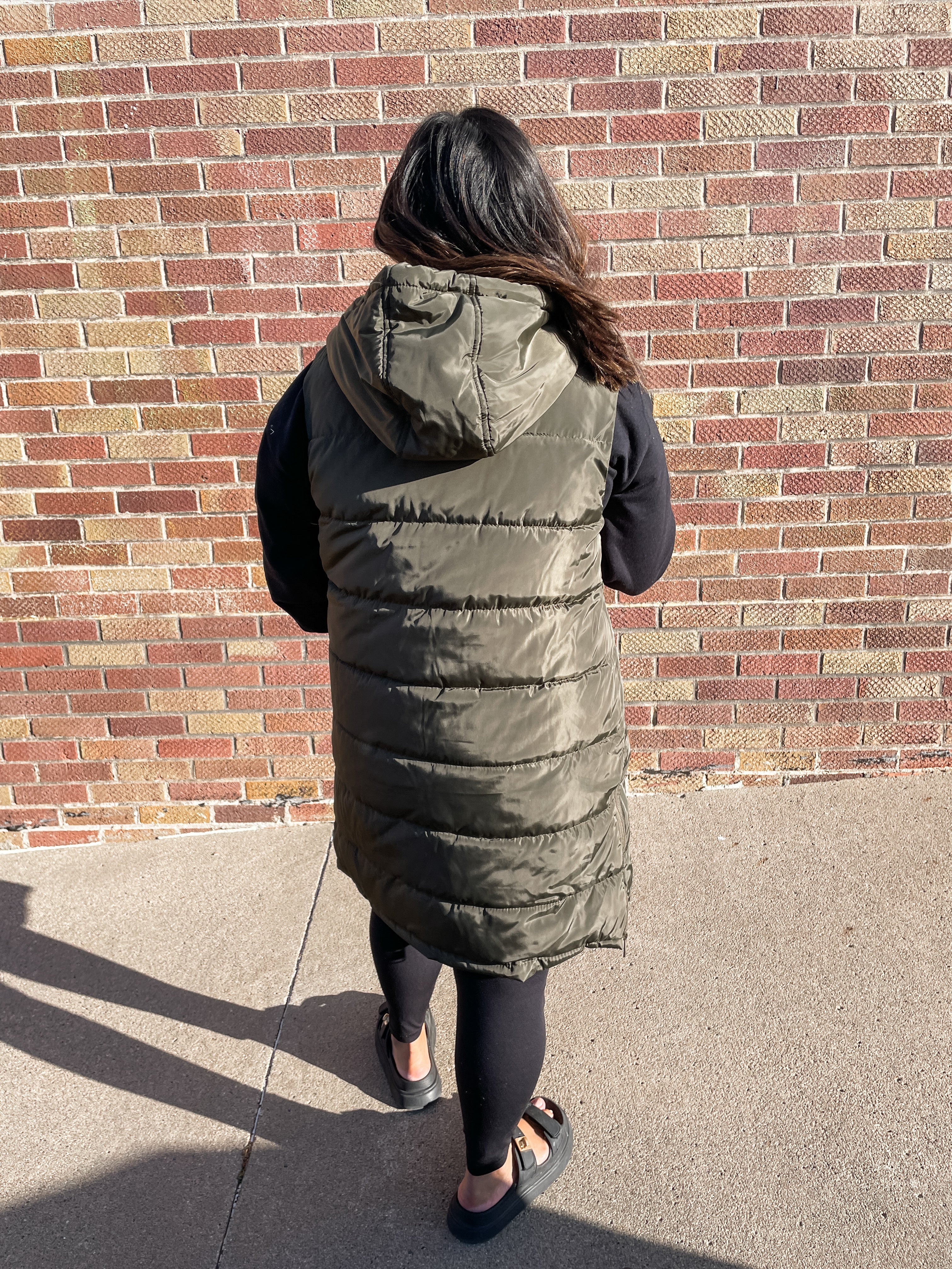 Wrap yourself in warmth and style with this long puffer vest! The fuzzy lining keeps you snug, while the slick outside adds a sleek, modern vibe. Zip it up and button it down for double protection against chilly winds. With cozy hoodie strings and pockets for your essentials, this puffy vest is perfect for layering up and standing out with a playful edge.
