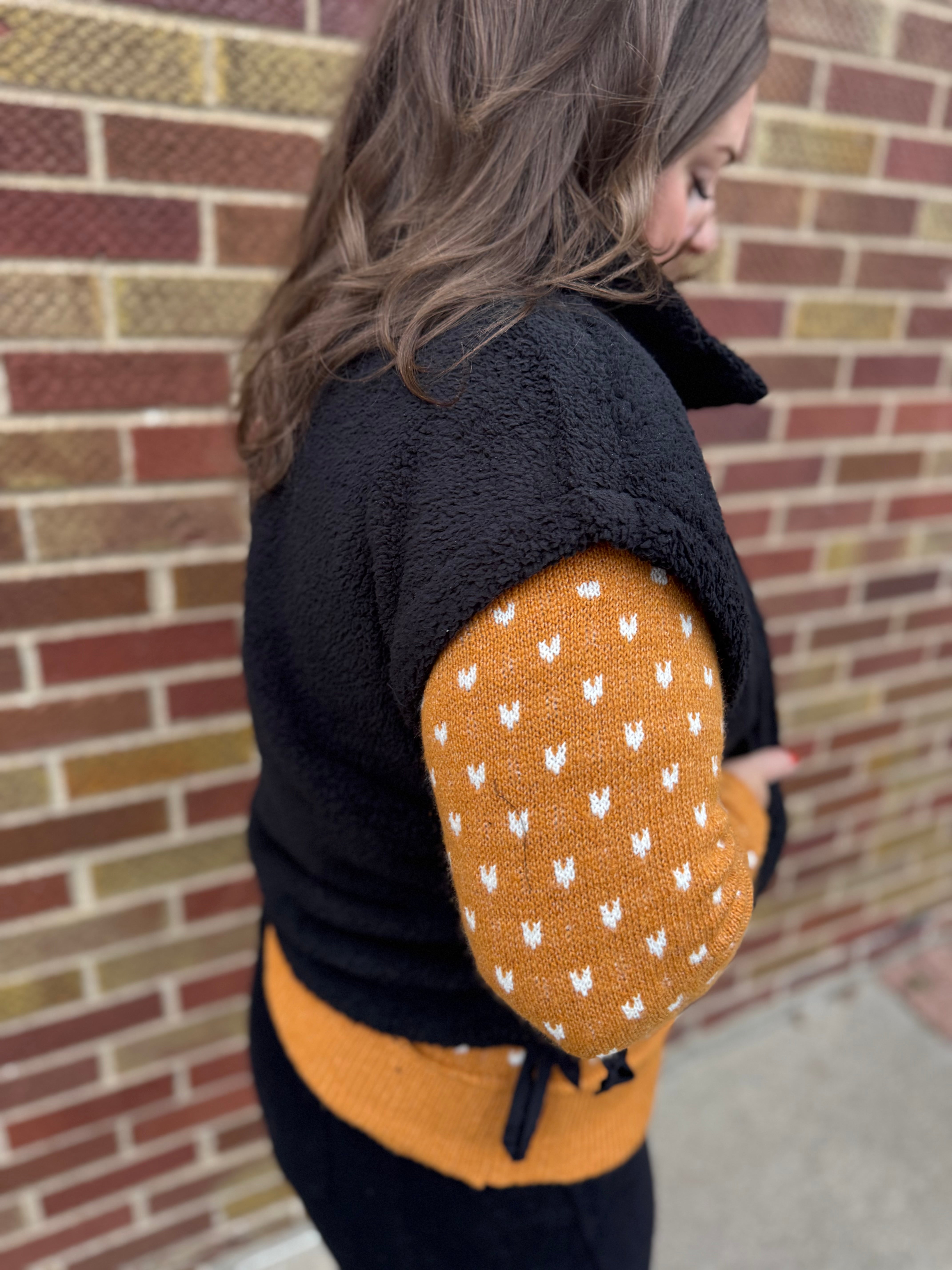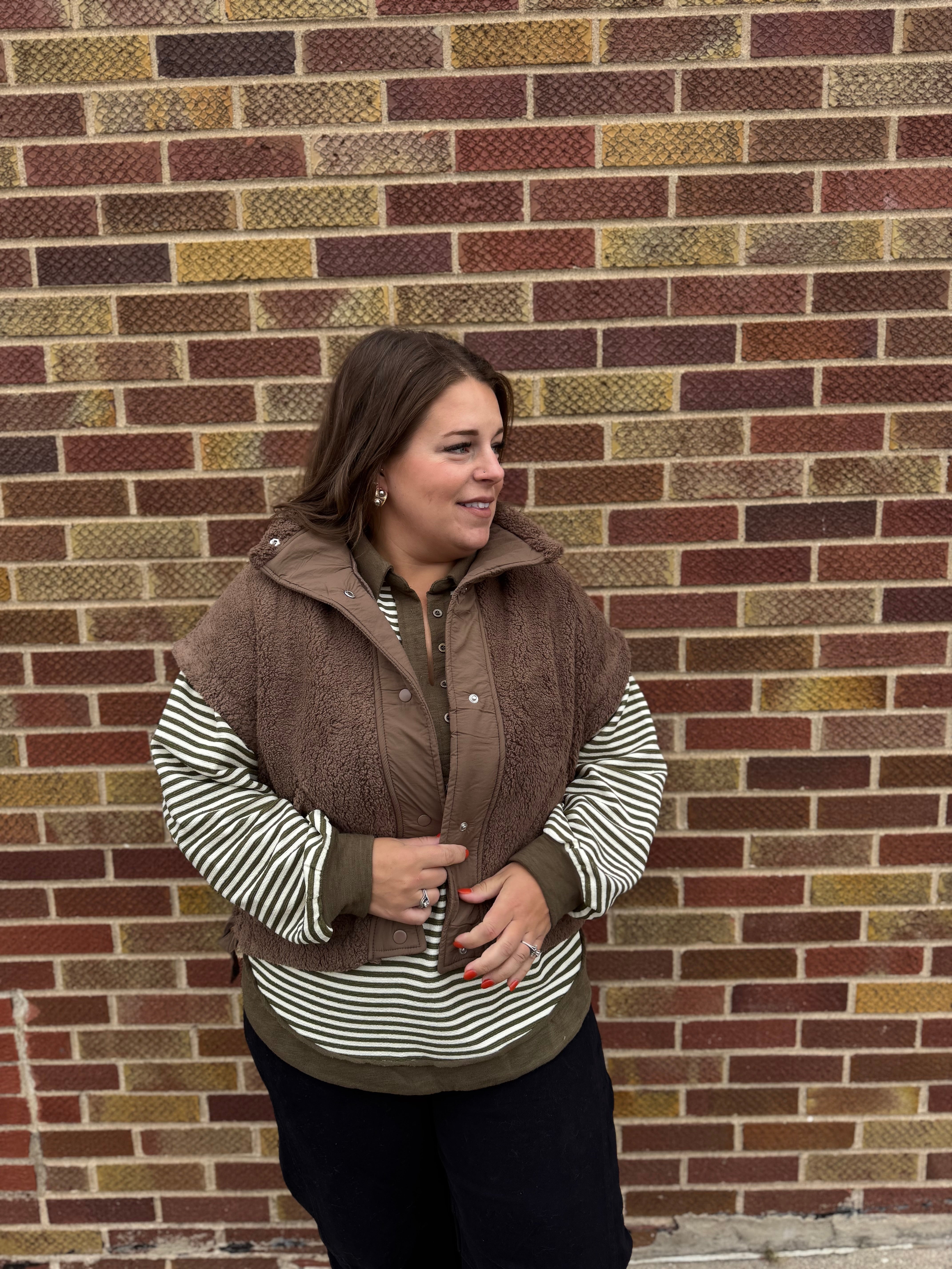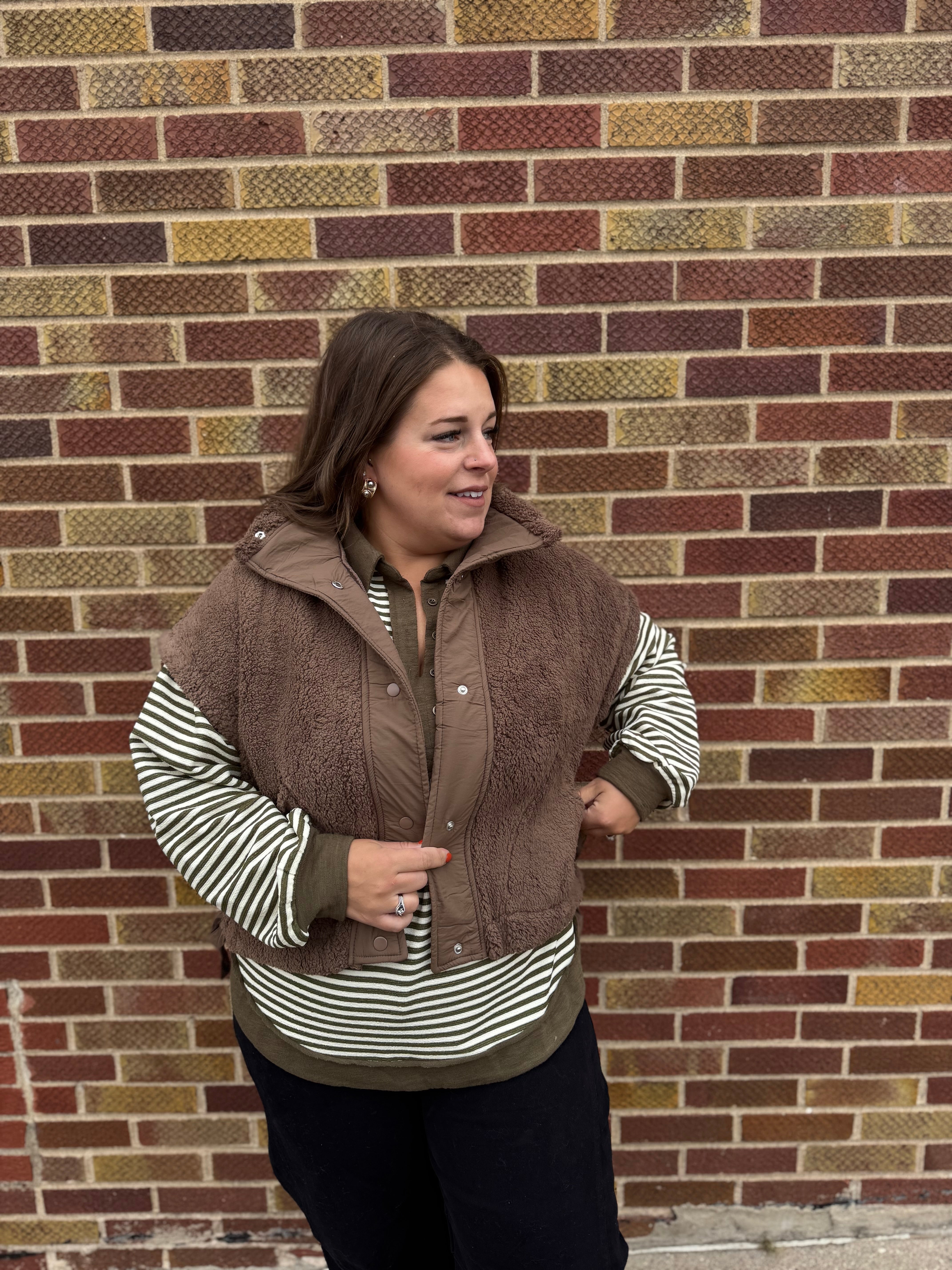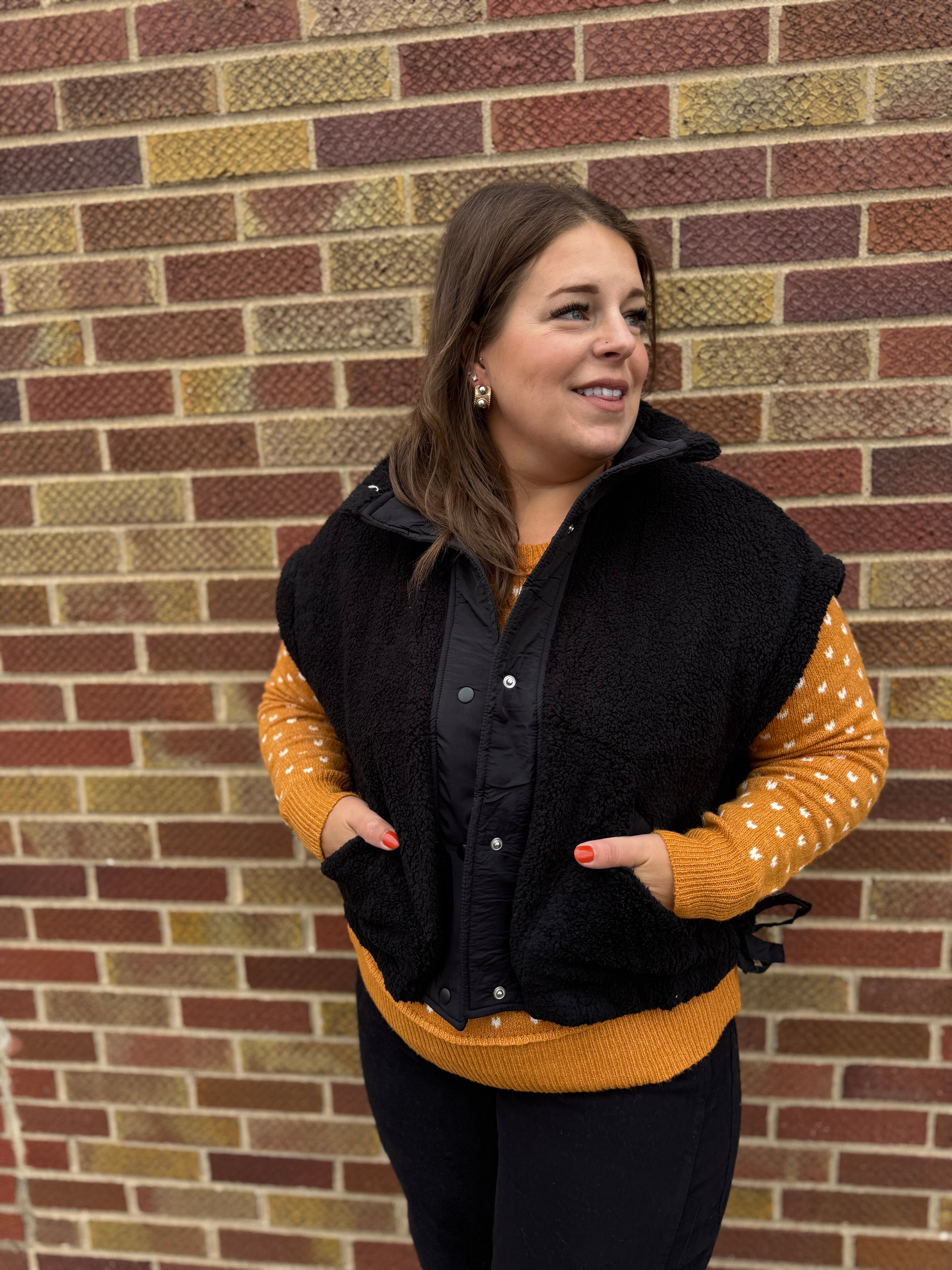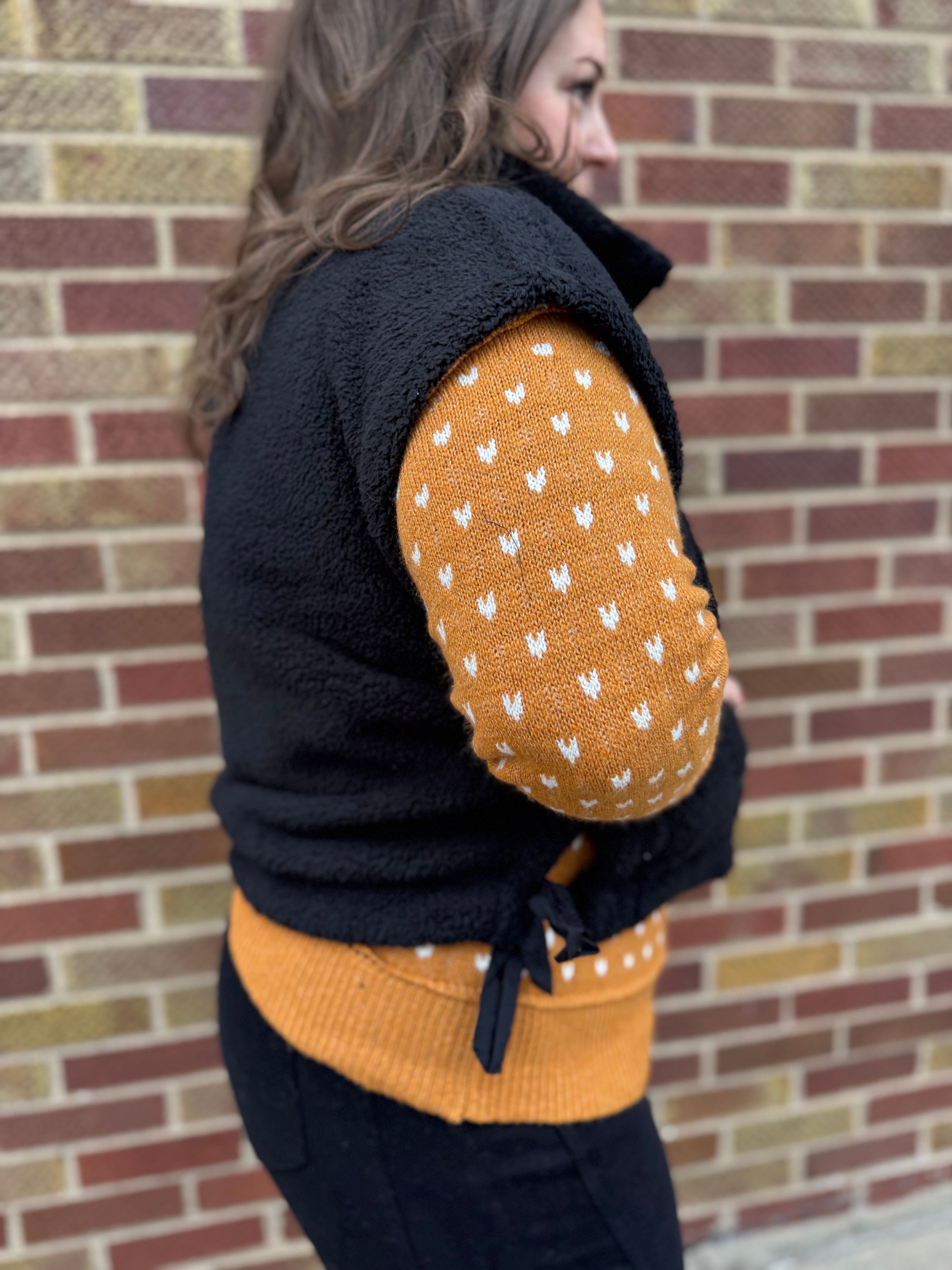 Stay warm and stylish in this cozy sherpa vest featuring a smooth quilted collar and adjustable side ties. Its plush texture and roomy fit make it perfect for layering with dresses or casual tops during cool-weather months.
