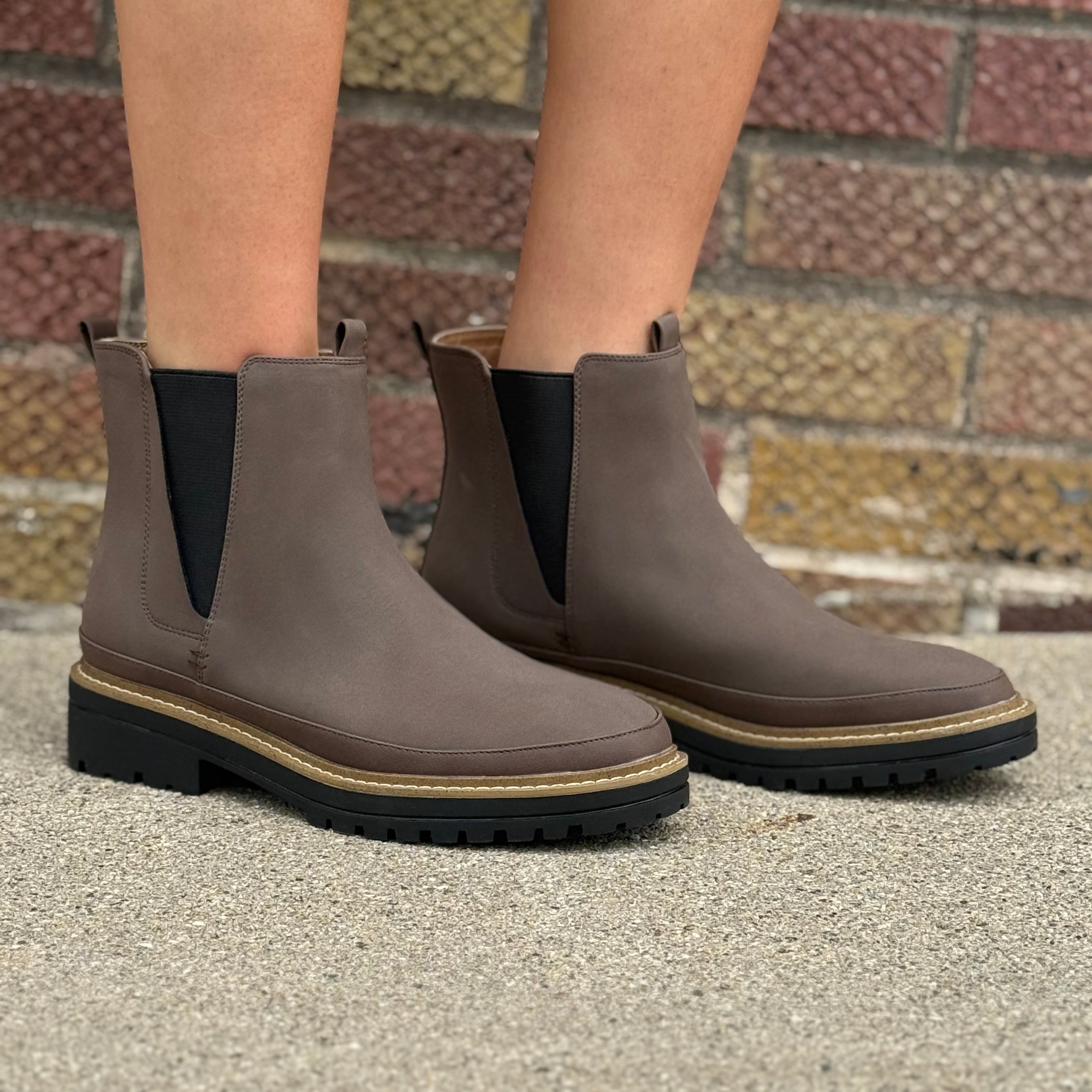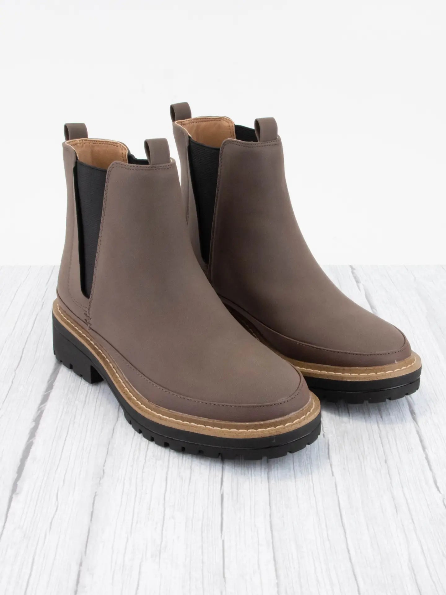 Slip-on entry bootie with elastic-stretch panel and low heel