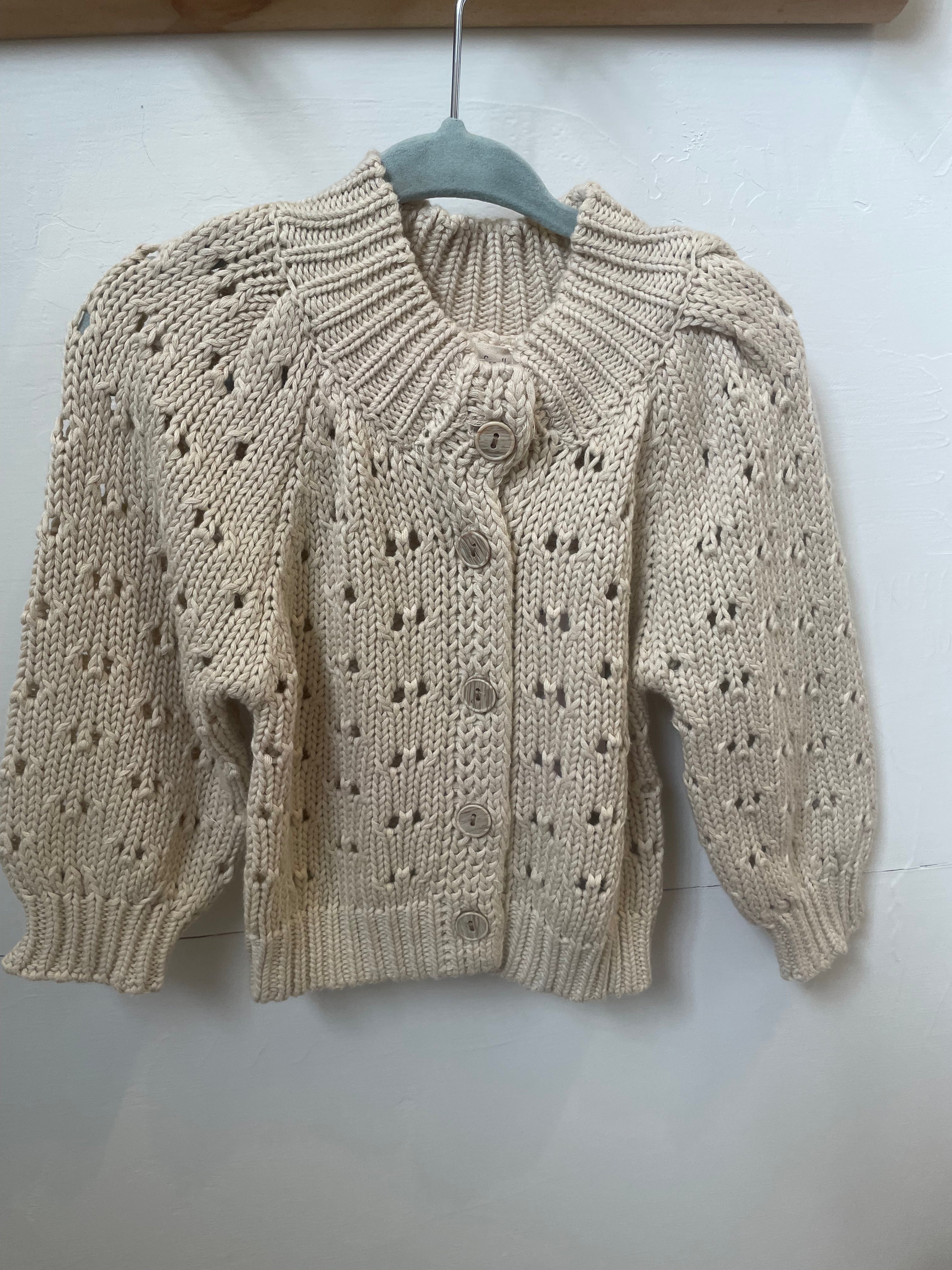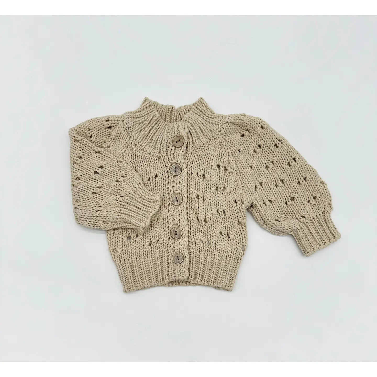 Cozy, timeless, and beautifully detailed — our Teddy Pointelle Baby Cardigan is crafted from ultra-soft 100% cotton yarn, perfect for layering in every season. Featuring a classic pointelle knit pattern, wooden buttons, and a ribbed collar and cuffs, this sweater blends vintage charm with everyday practicality.