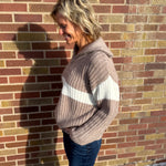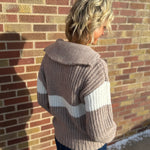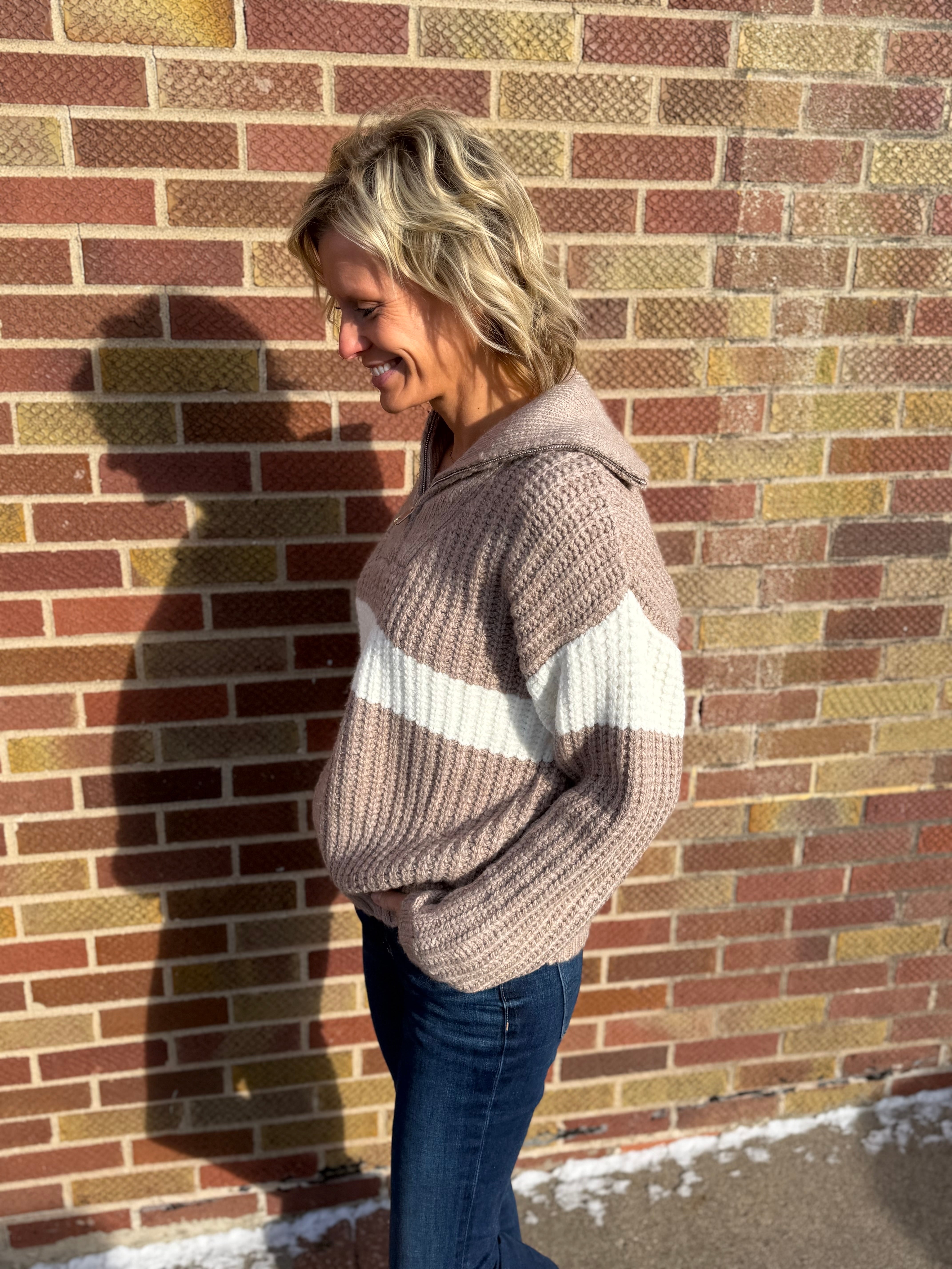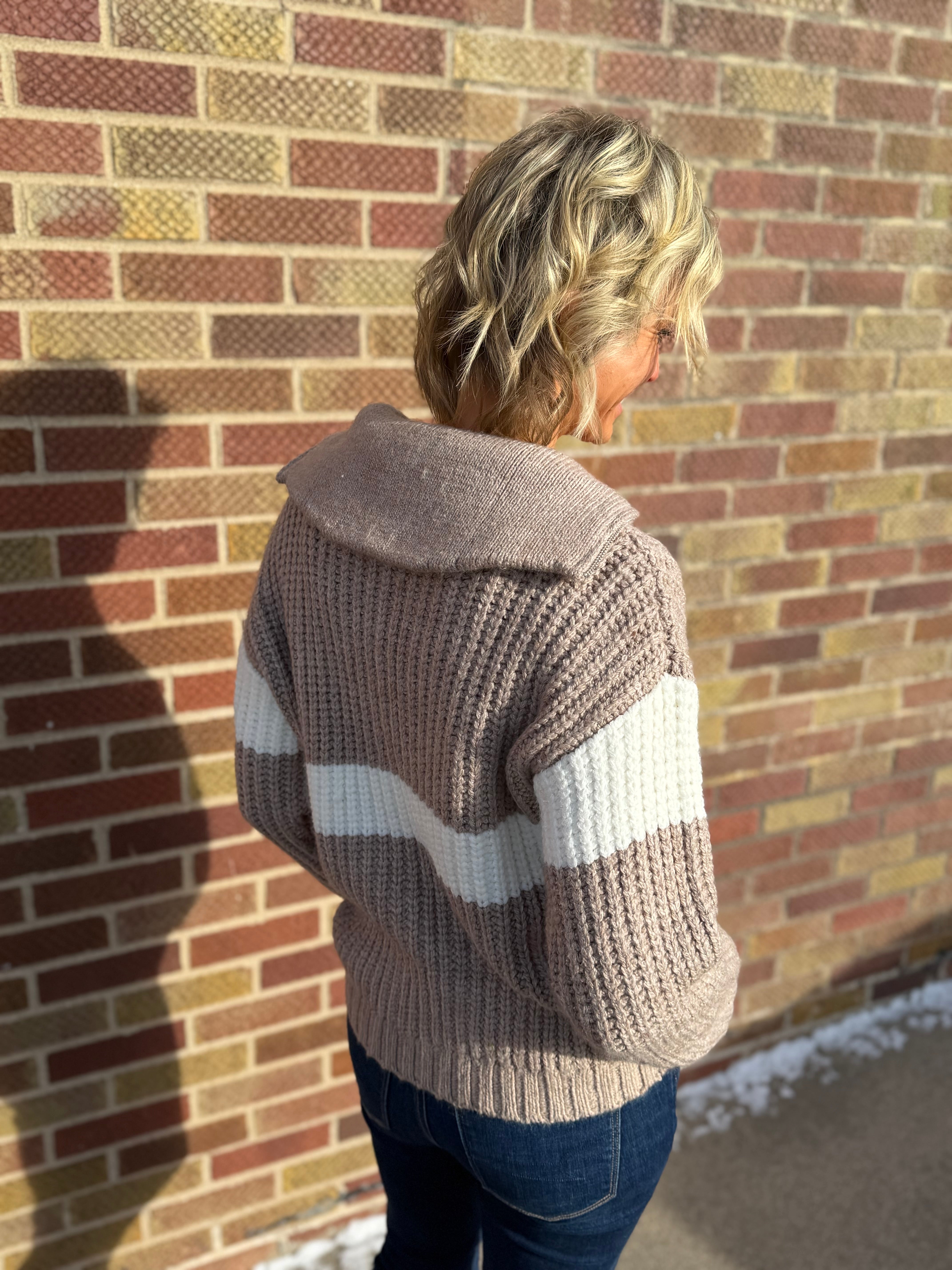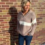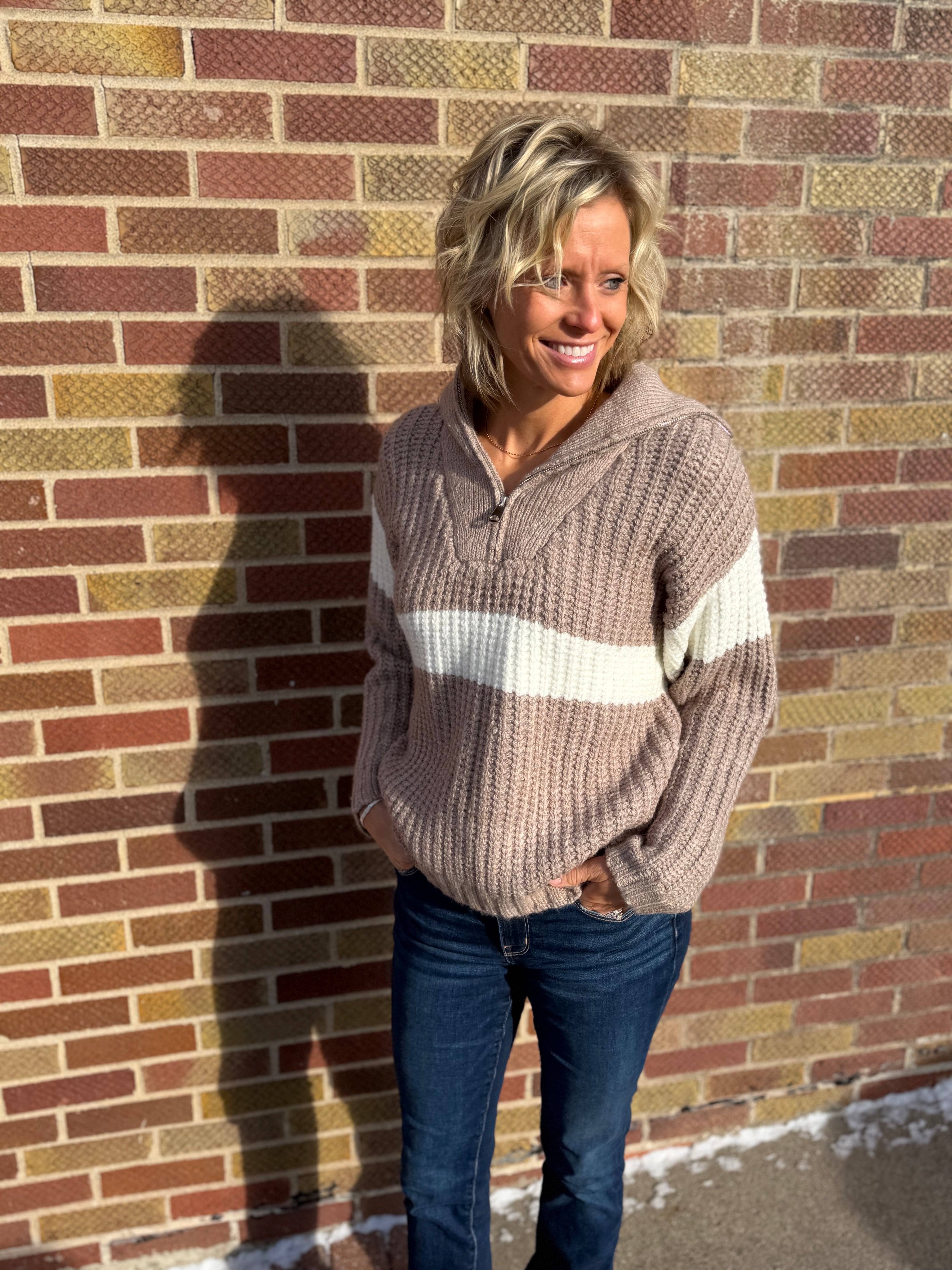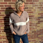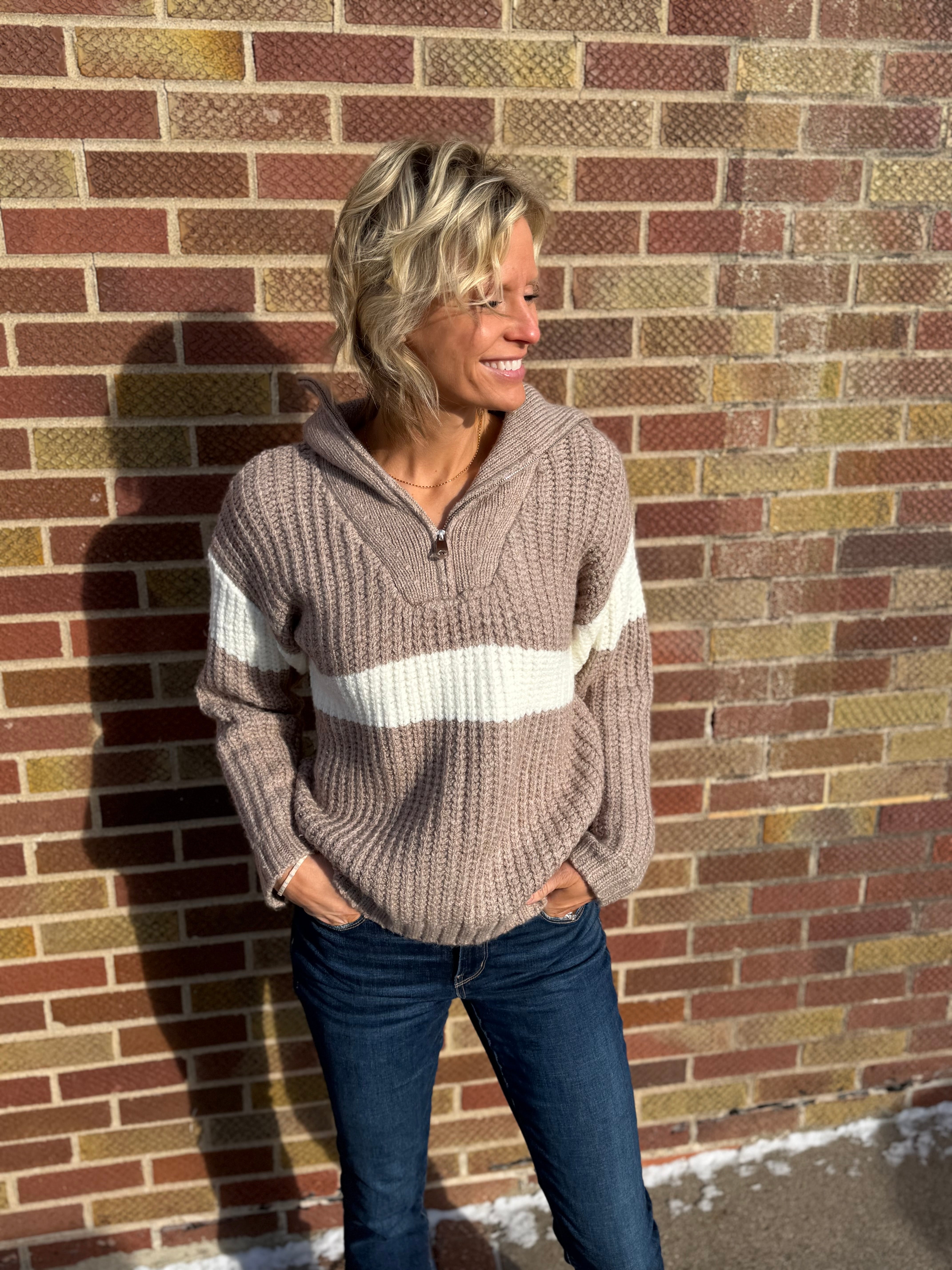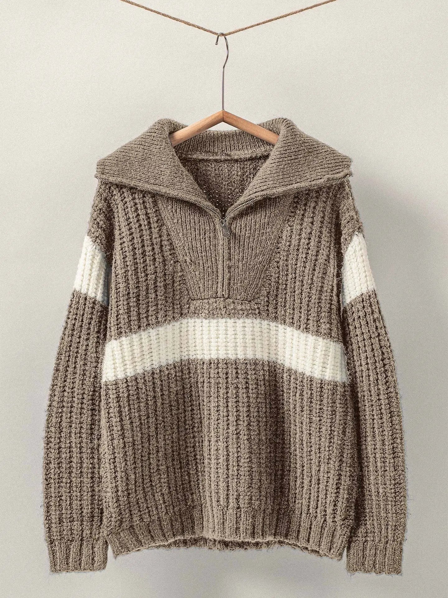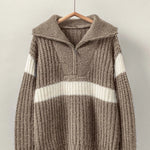 Stay cozy and stylish in this chunky knit sweater featuring a bold contrast stripe and sporty half-zip collar. Designed for comfort and layering, it's the perfect go-to for everyday wear or chilly outings.