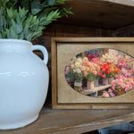This framed art piece measures 12x8 inches. The 1" deep solid wood frame allows it to stand on it's own on a shelf or tabletop. The laser cut wood mat has an oval opening that gives this piece a vintage look. The artwork is printed on to high quality textured canvas using vibrant Canon pigment inks that will last a lifetime. All wood pieces are stained in a beautiful Early American wood tone.