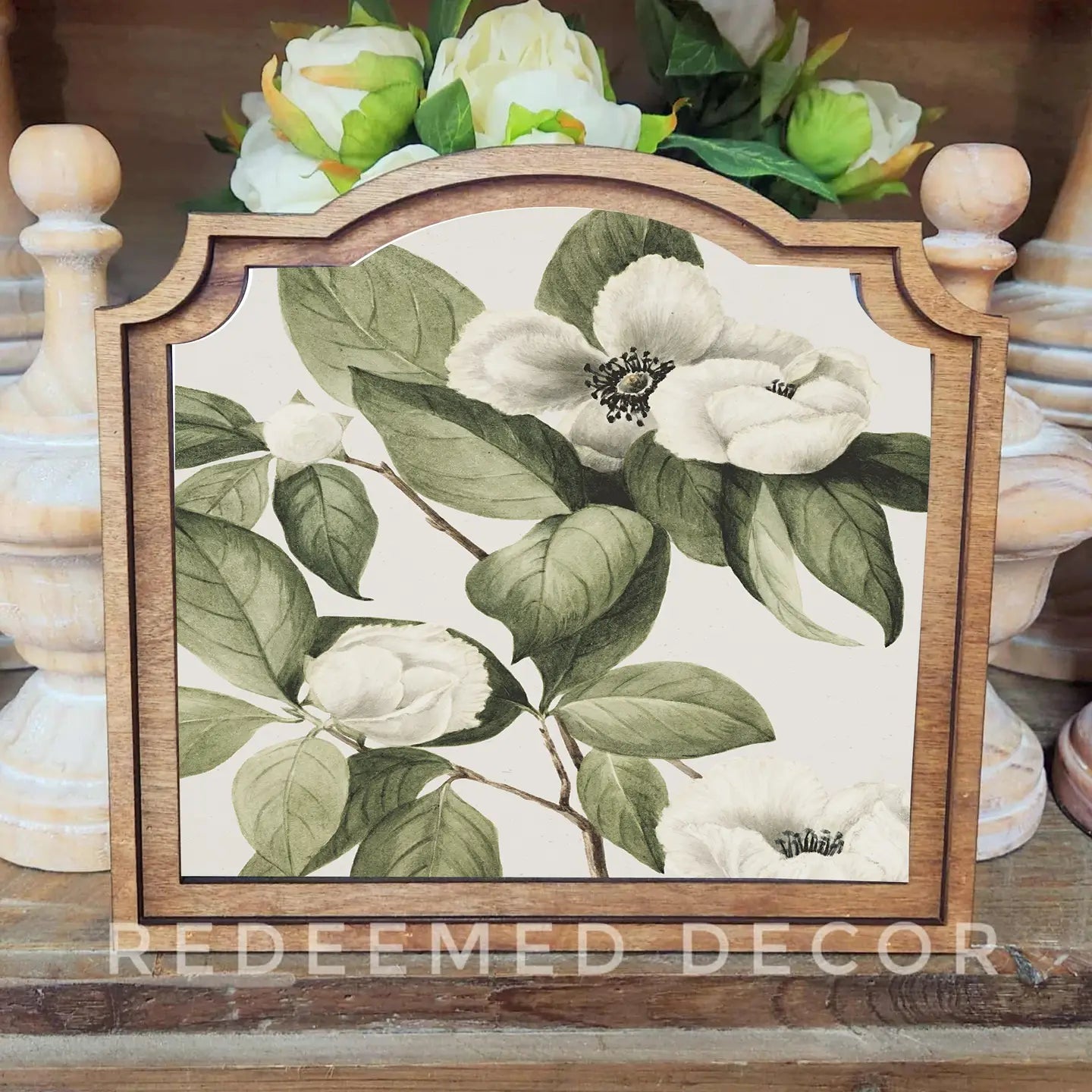 This unique framed art is hand made in Idaho. It measures 9 inches tall by 10 inches wide. The custom frame shape gives the piece a vintage look. The artwork is printed onto canvas using beautiful Canon pigment inks. The canvas is mounted onto a wood backer. The top frame is laser cut birch wood stained in a neutral Early American tone.