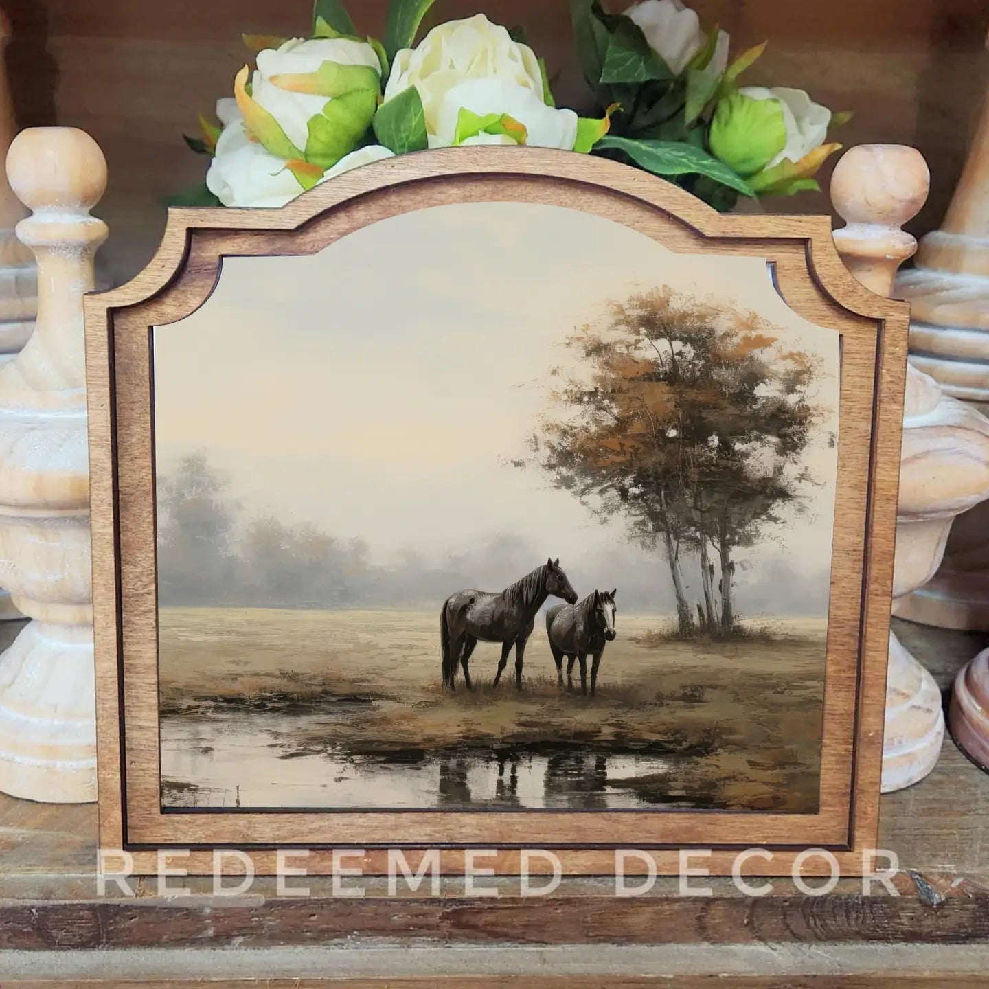 This unique framed art is hand made in Idaho. It measures 9 inches tall by 10 inches wide. The custom frame shape gives the piece a vintage look. The artwork is printed onto canvas using beautiful Canon pigment inks. The canvas is mounted onto a wood backer. The top frame is laser cut birch wood stained in a neutral Early American tone.