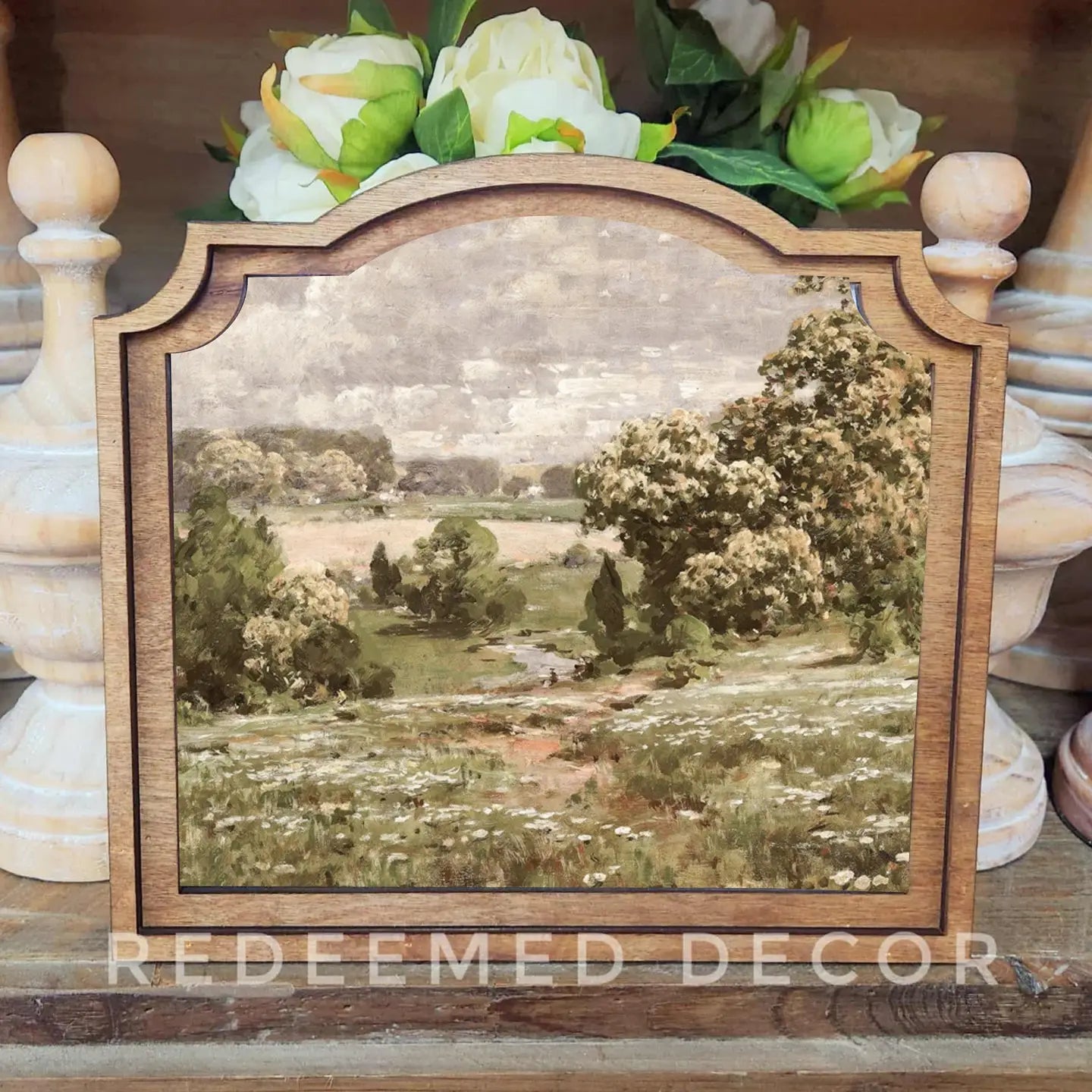 This unique framed art is hand made in Idaho. It measures 9 inches tall by 10 inches wide. The custom frame shape gives the piece a vintage look. The artwork is printed onto canvas using beautiful Canon pigment inks. The canvas is mounted onto a wood backer. The top frame is laser cut birch wood stained in a neutral Early American tone.