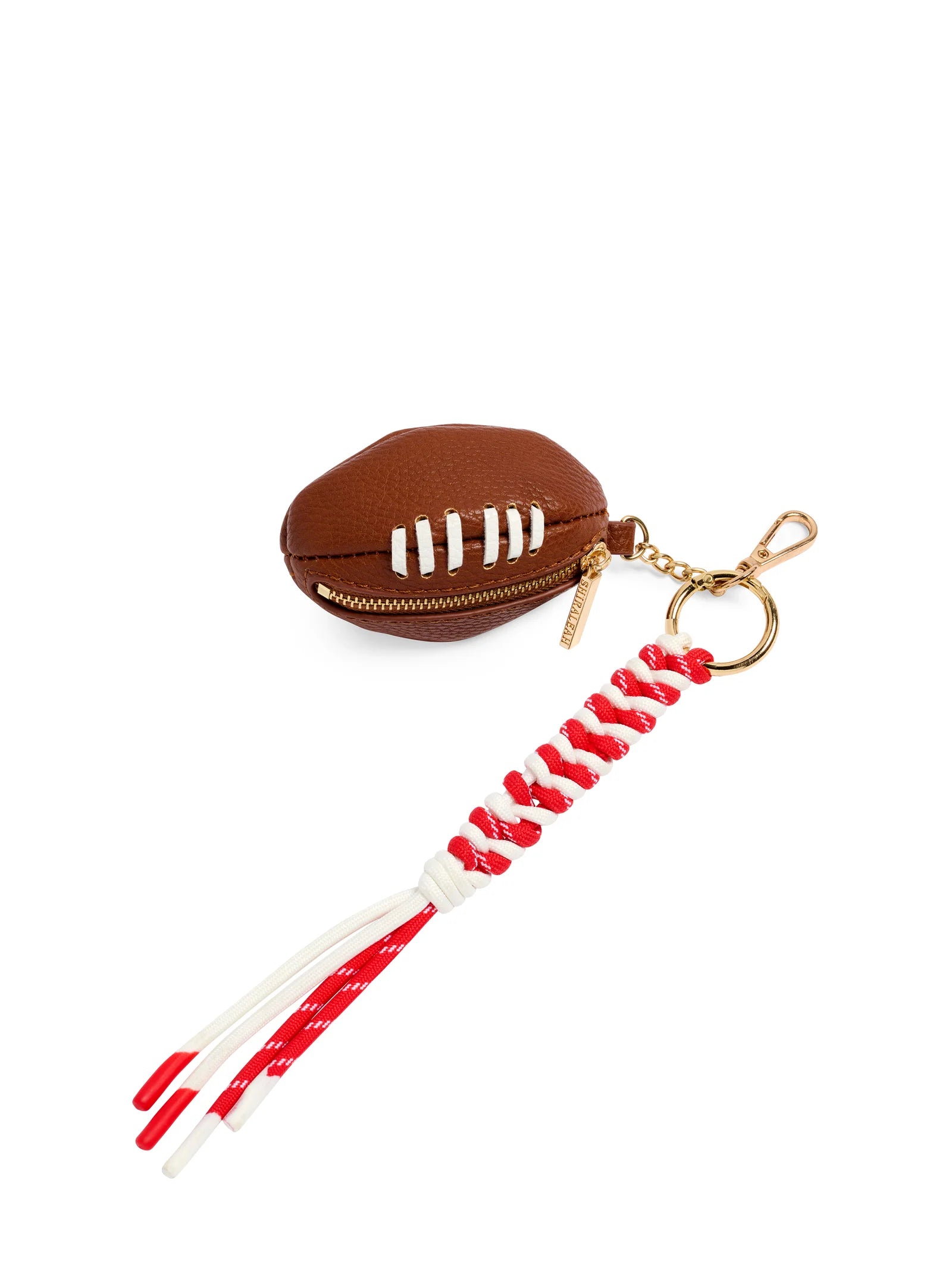 Show your team spirit with the Football Bag Charm/Key Ring – the ultimate sporty-chic accessory for game day and beyond. Shaped like a mini football, this faux-leather charm features a top zip closure to hold small essentials like coins or earbuds. It comes complete with a key ring and clasp hook, making it easy to attach to your favorite bag, belt loop, or keys. Finished with a braided tassel in your team’s colors, it's a playful nod to your football fandom.