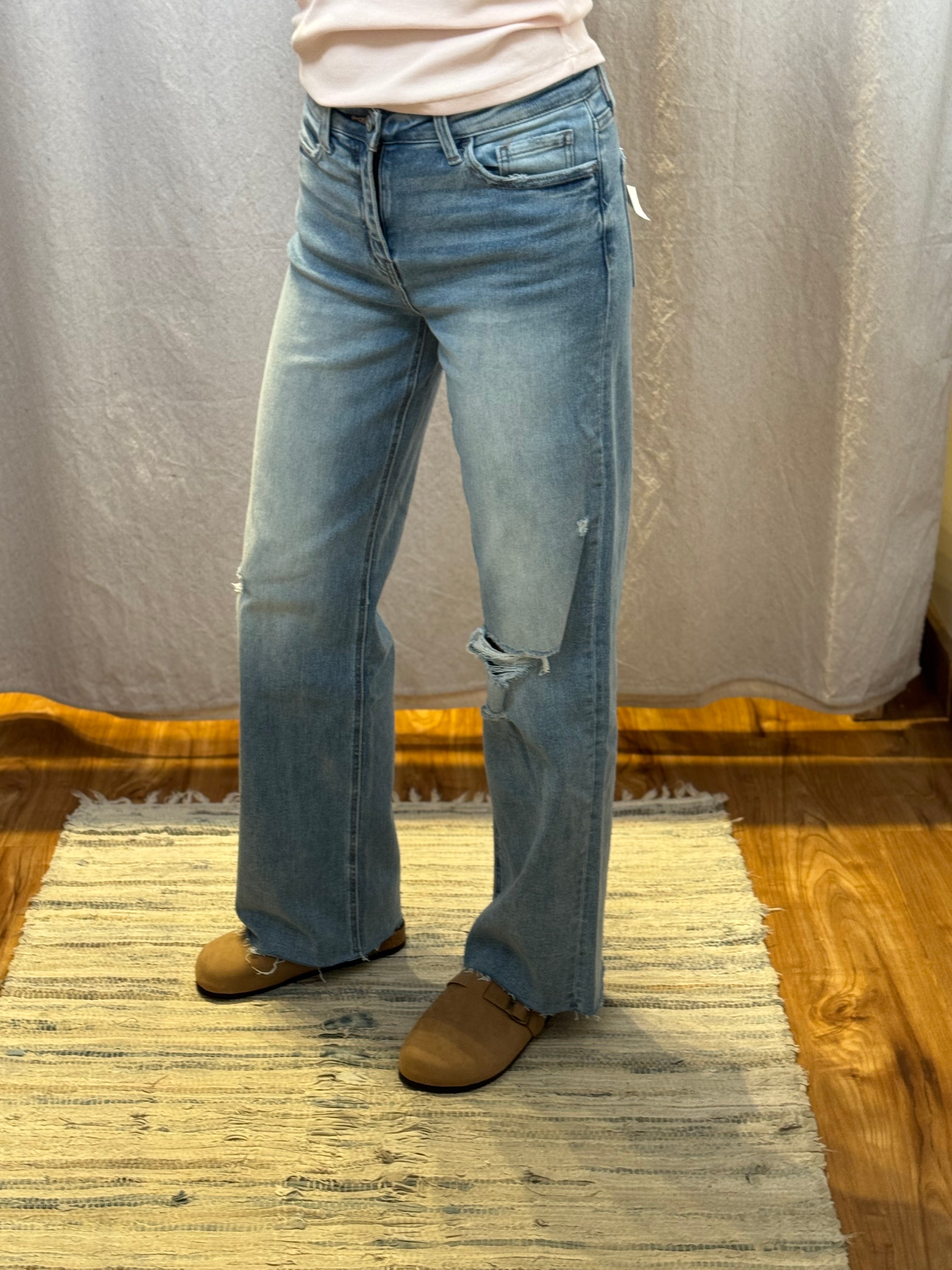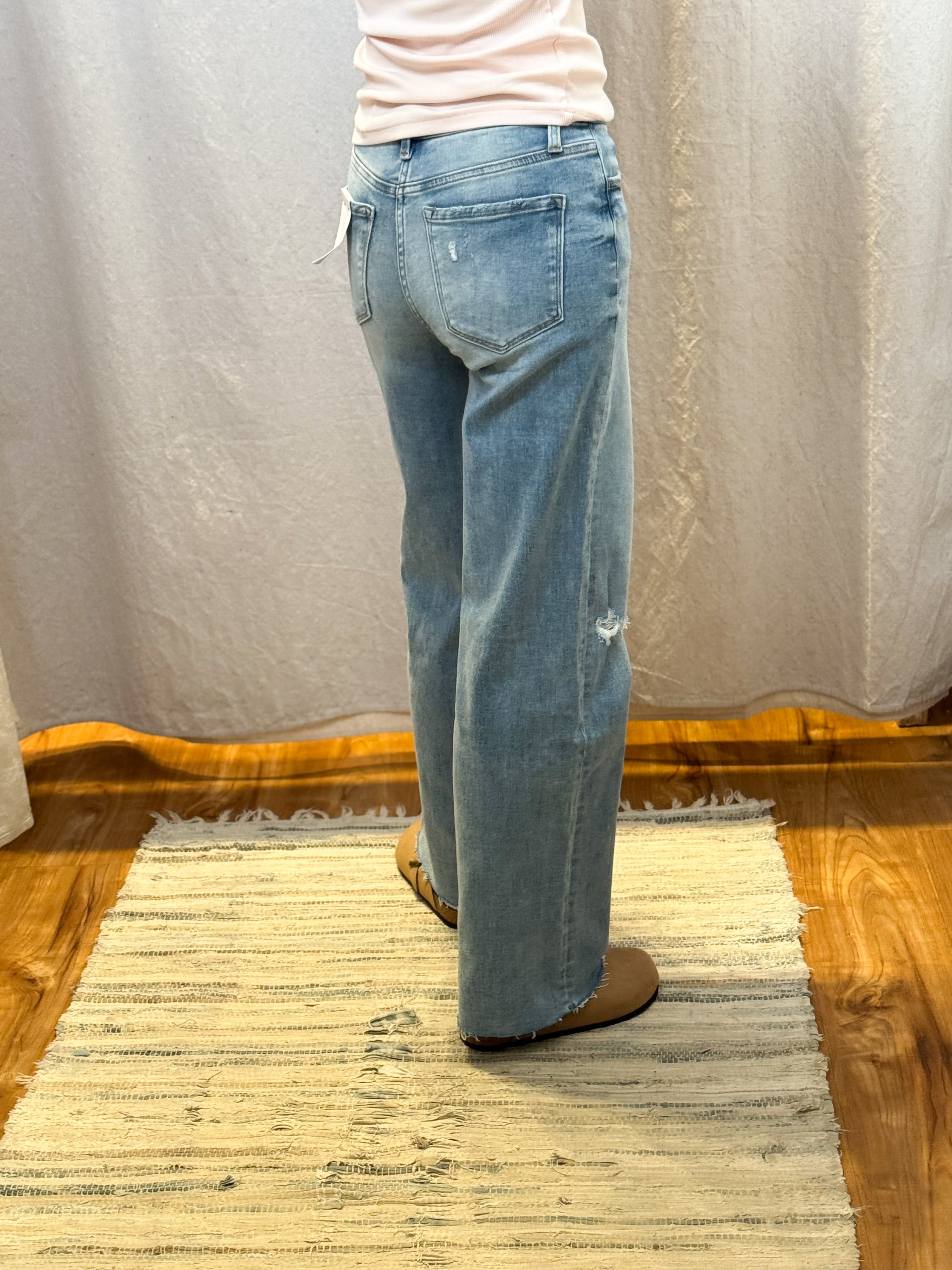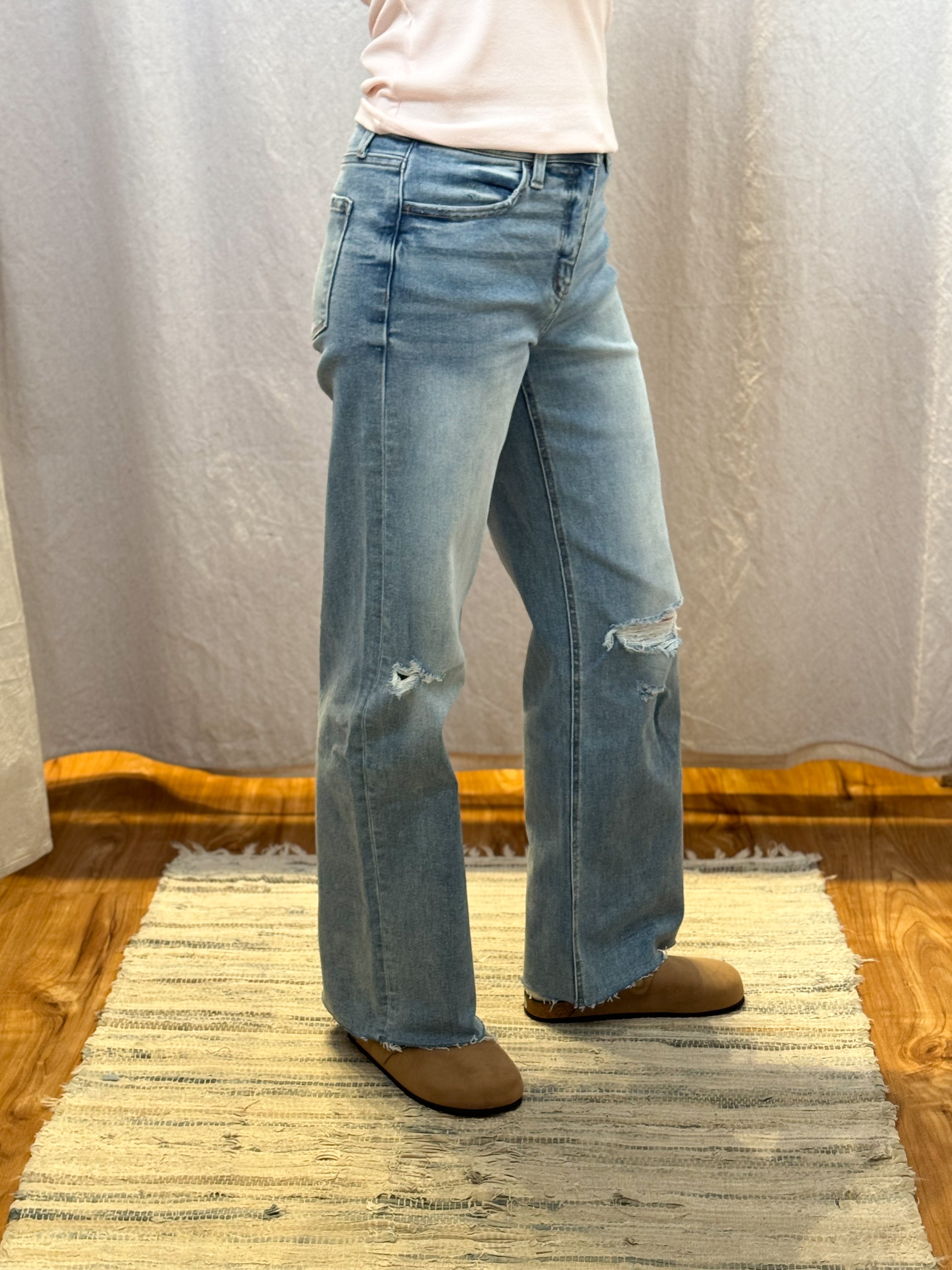 High rise clean cut raw hem wide leg jeans Comfort stretch denim, high rise waist, distressed detail, clean cut raw hem, full length, wide leg jeans.