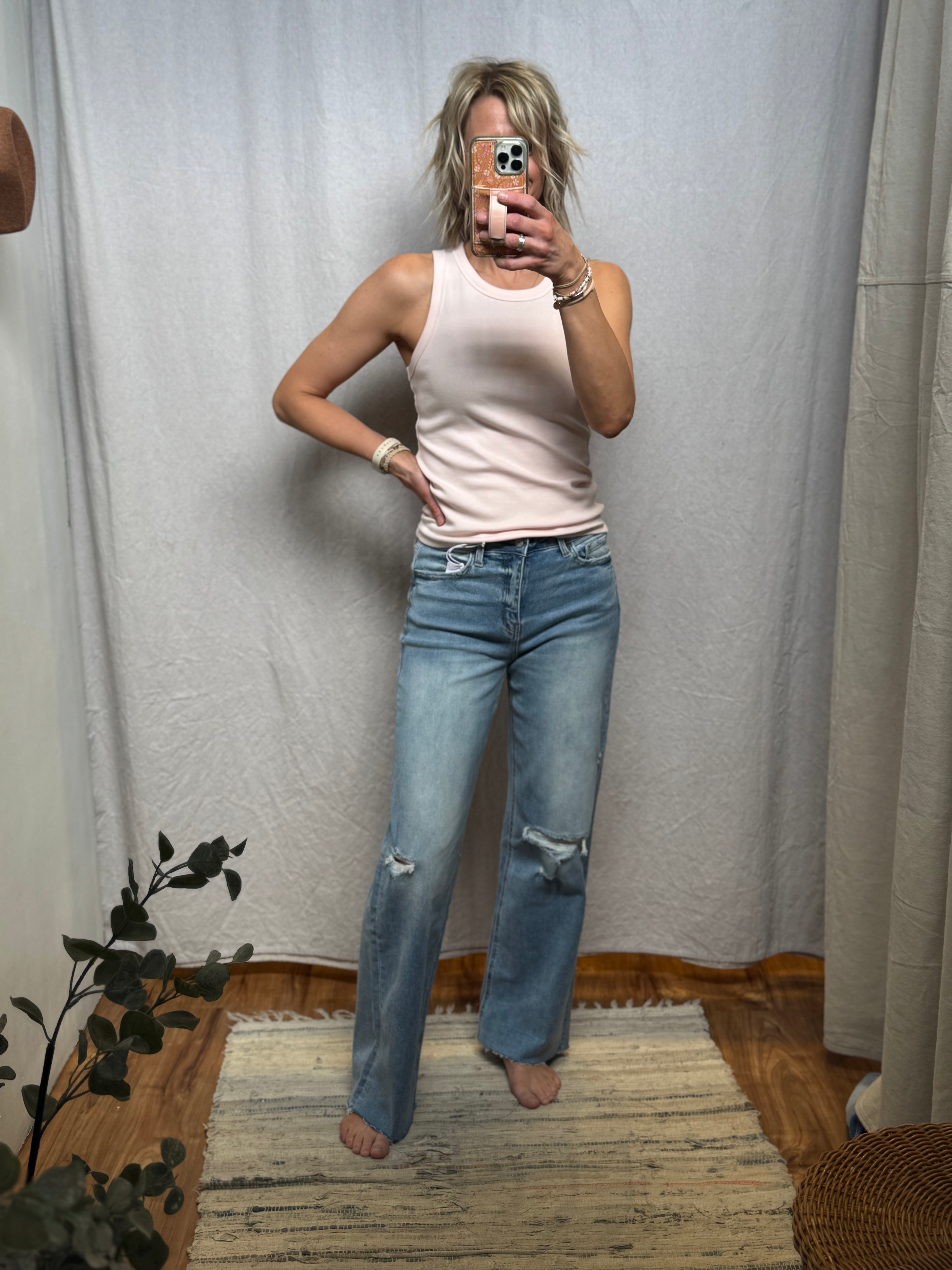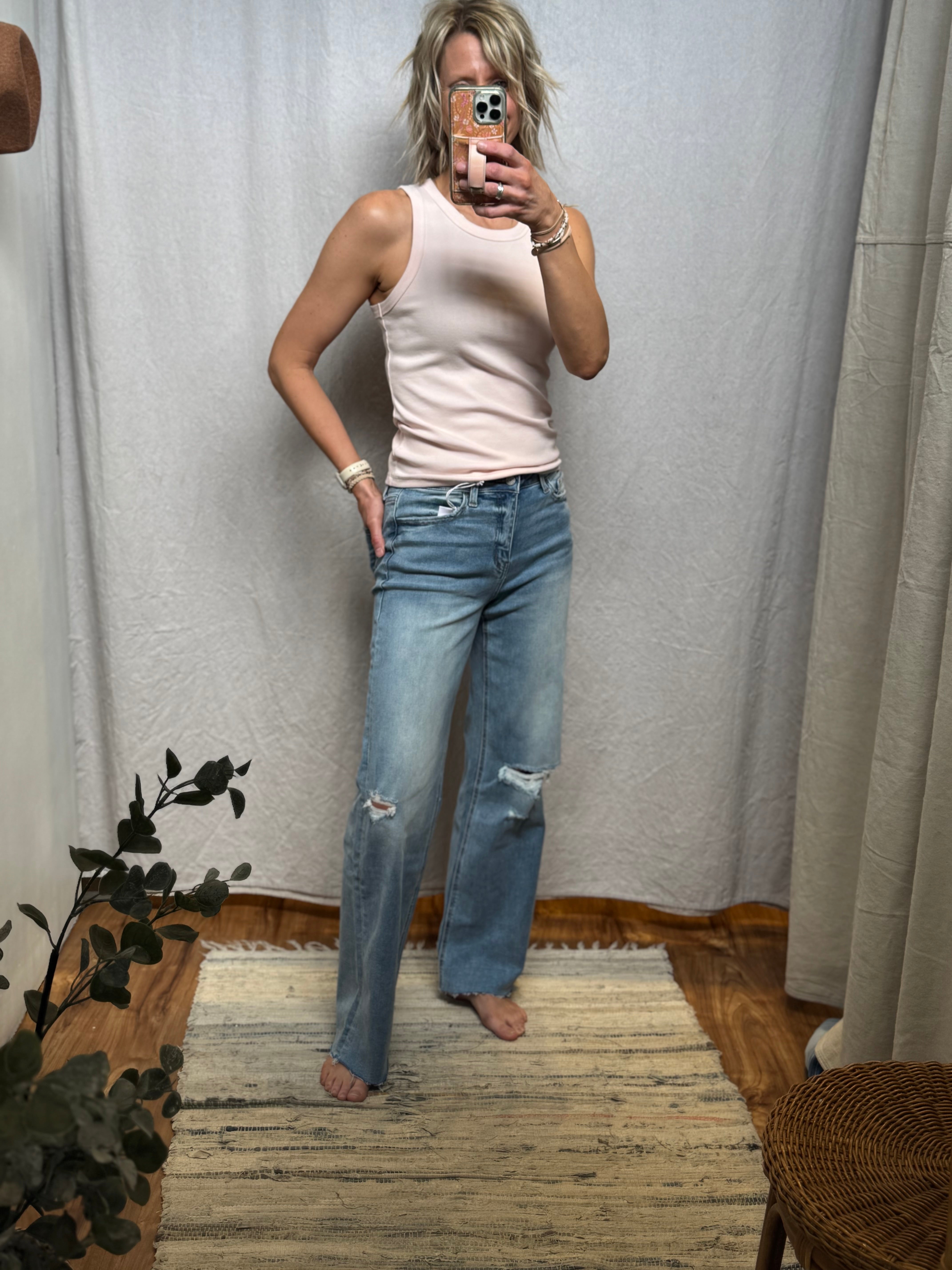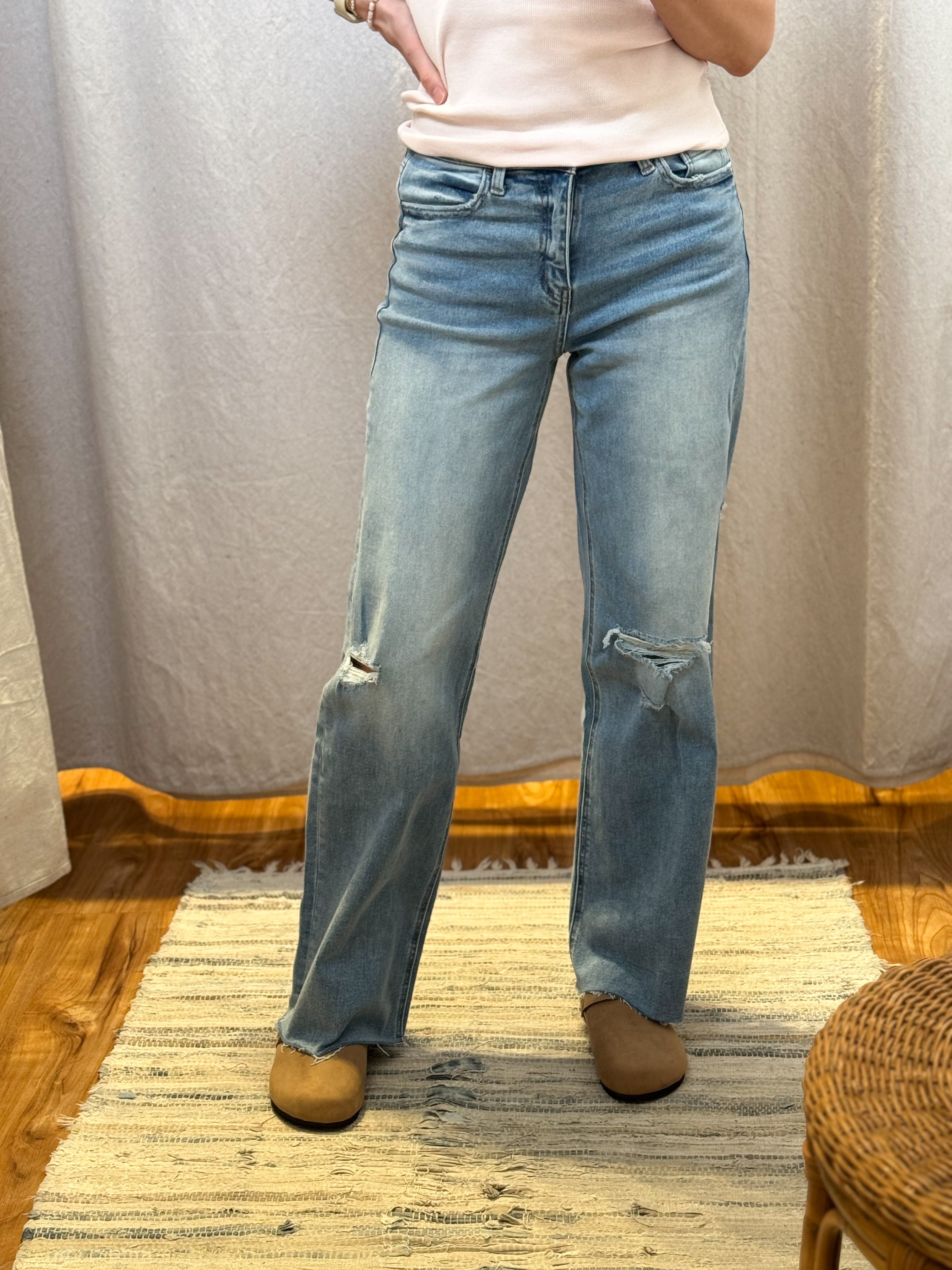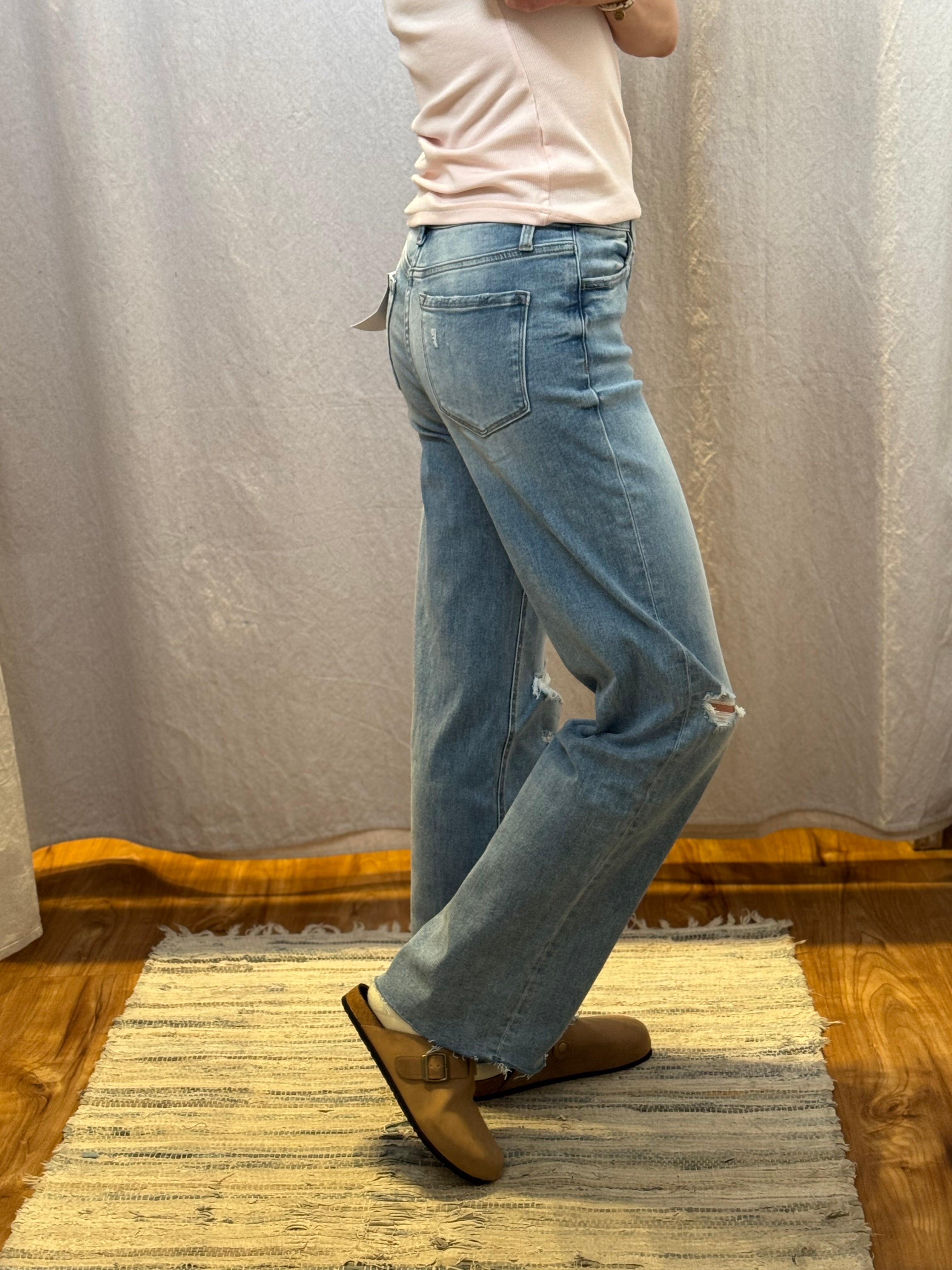 High rise clean cut raw hem wide leg jeans Comfort stretch denim, high rise waist, distressed detail, clean cut raw hem, full length, wide leg jeans.