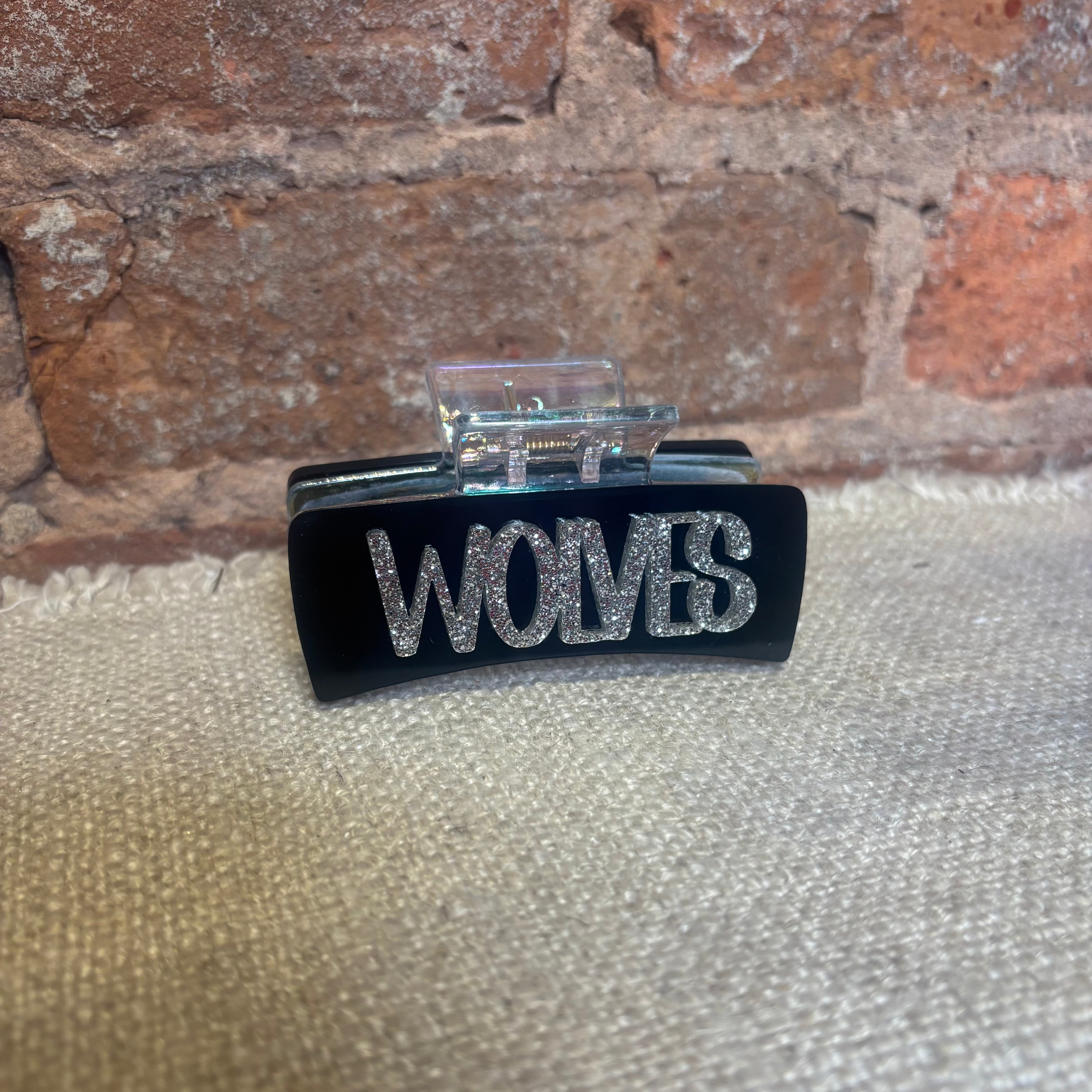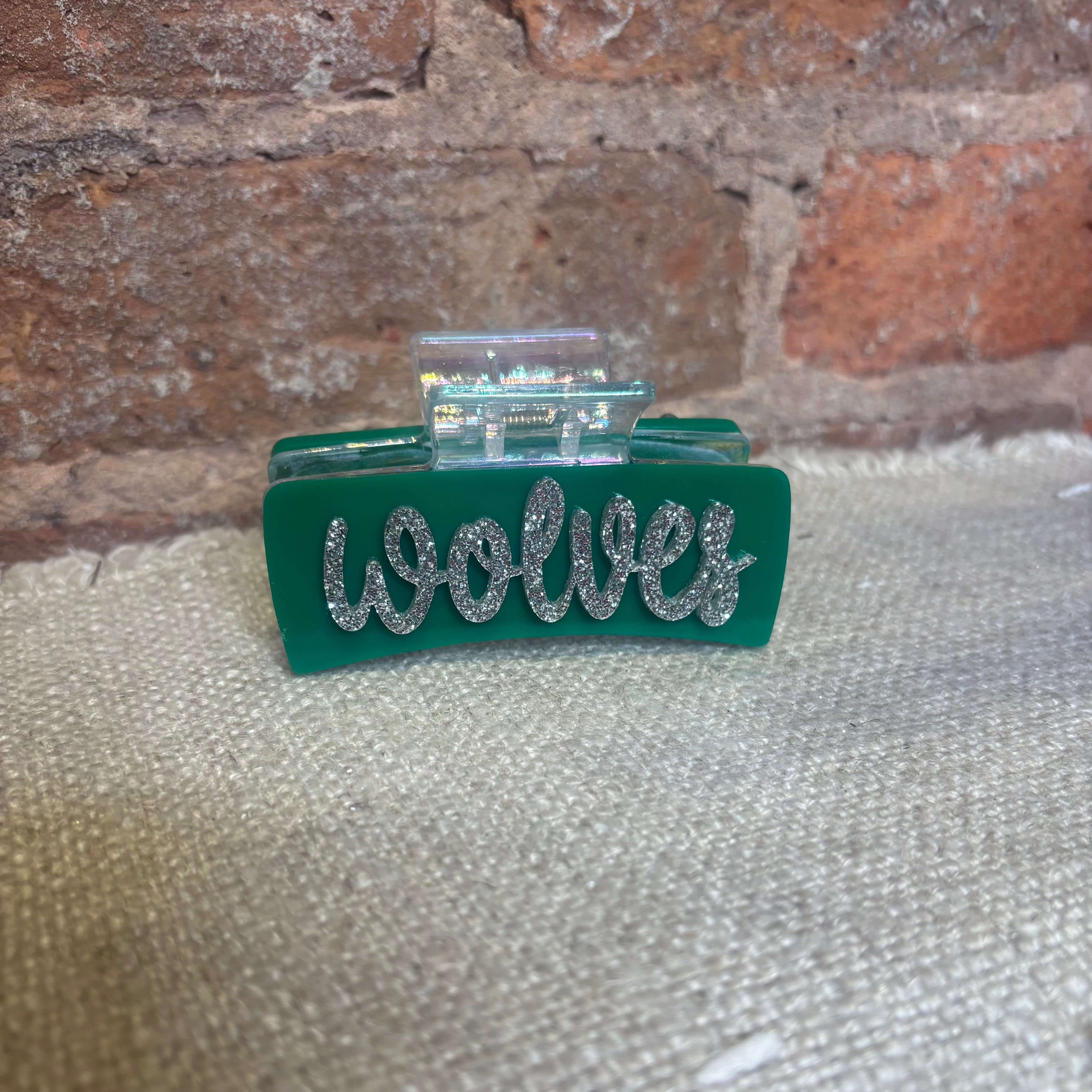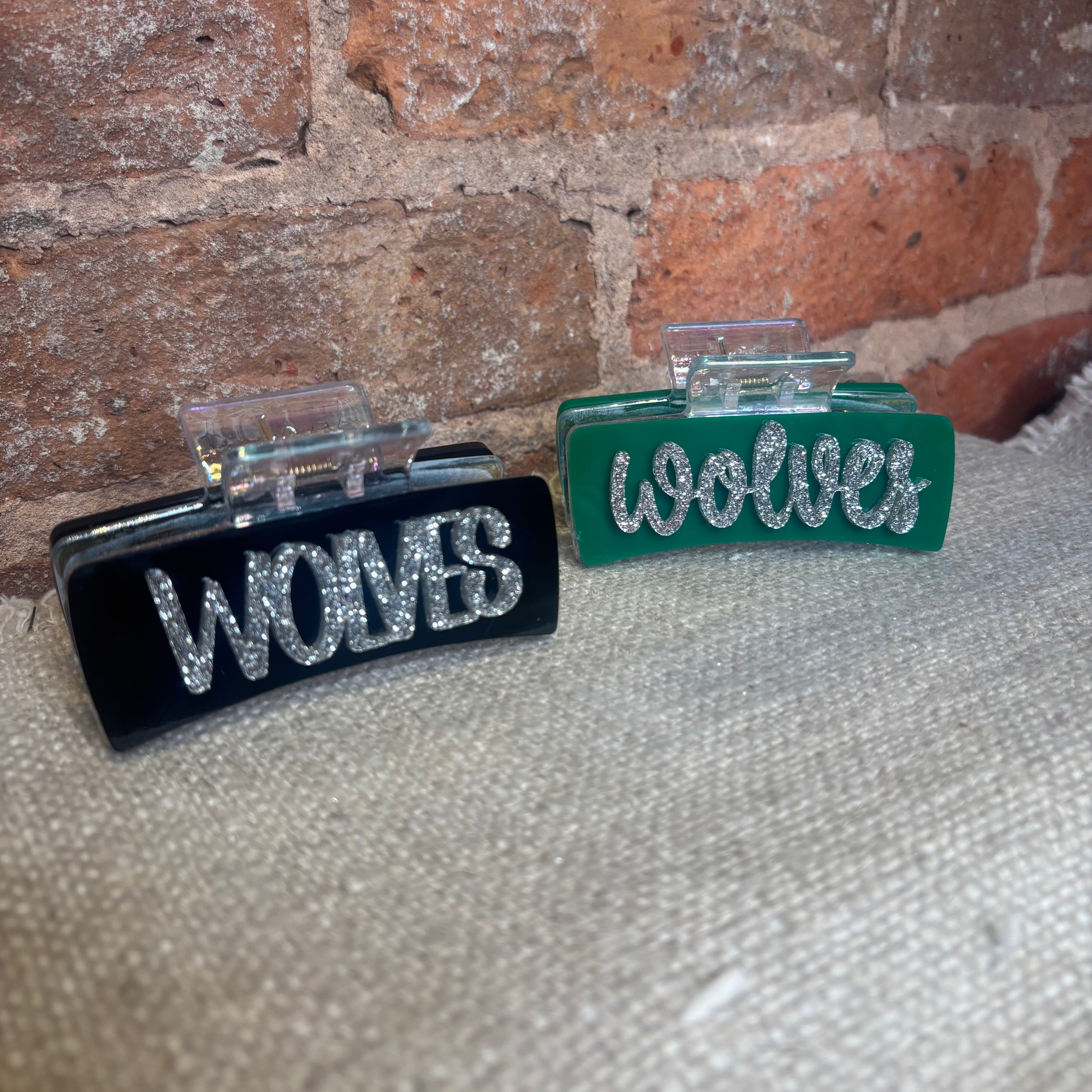 Add some wild sparkle with the Silver Glitter Wolves Hair Claw Clip! Featuring green and silver glitter with wolves in cursive and bold black and silver glitter lettering, this sturdy clip shines with an iridescent base. Perfect for taming your mane with playful, fierce style.