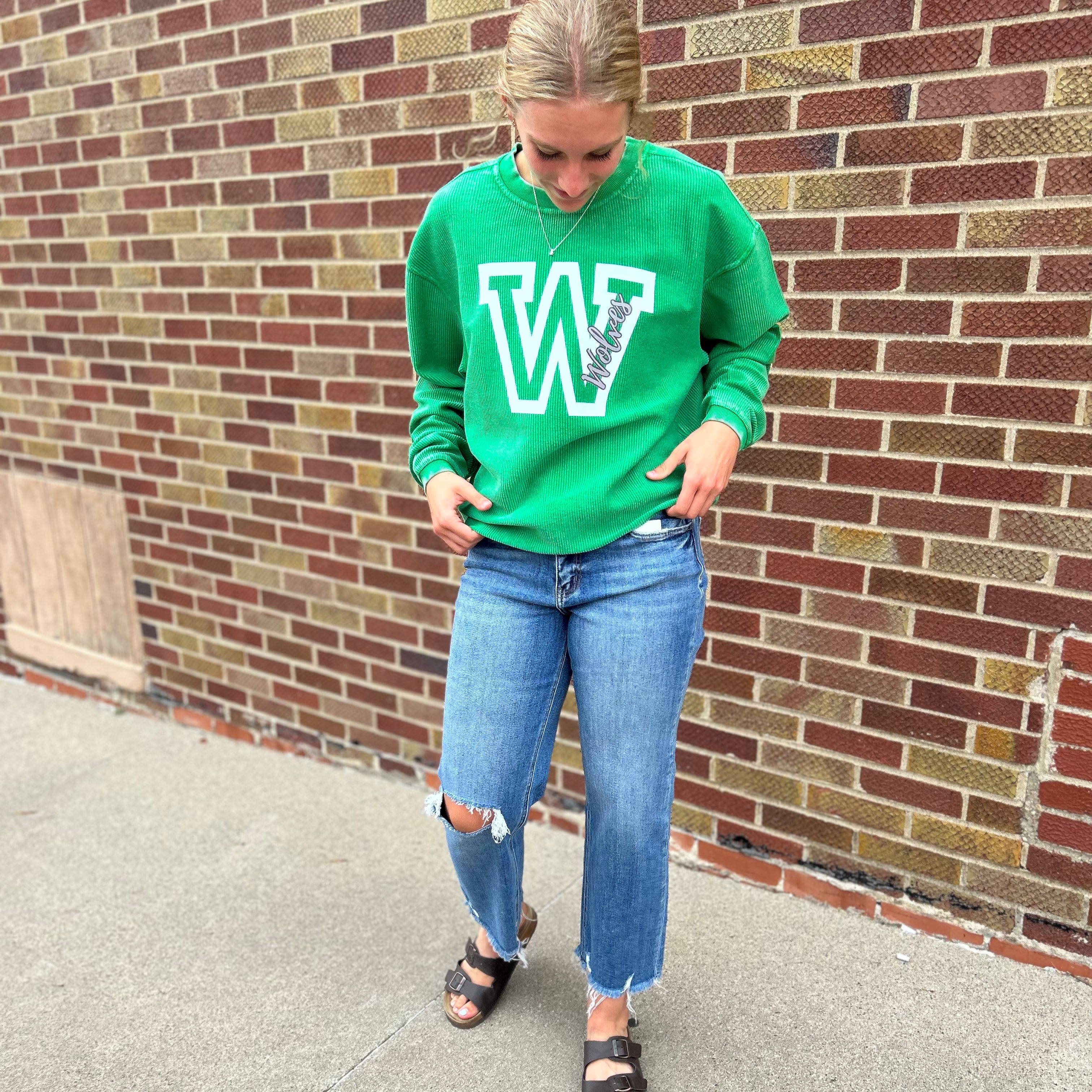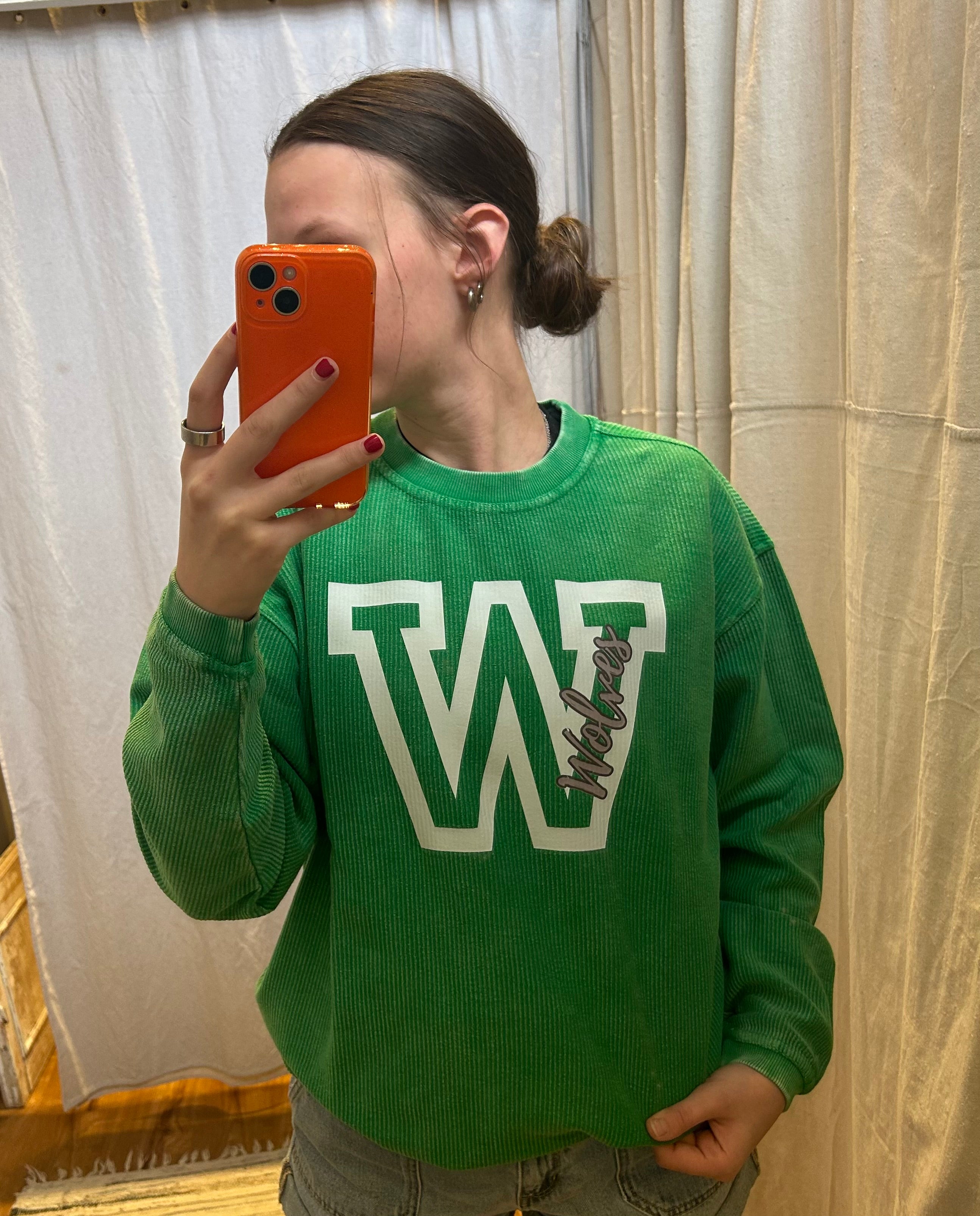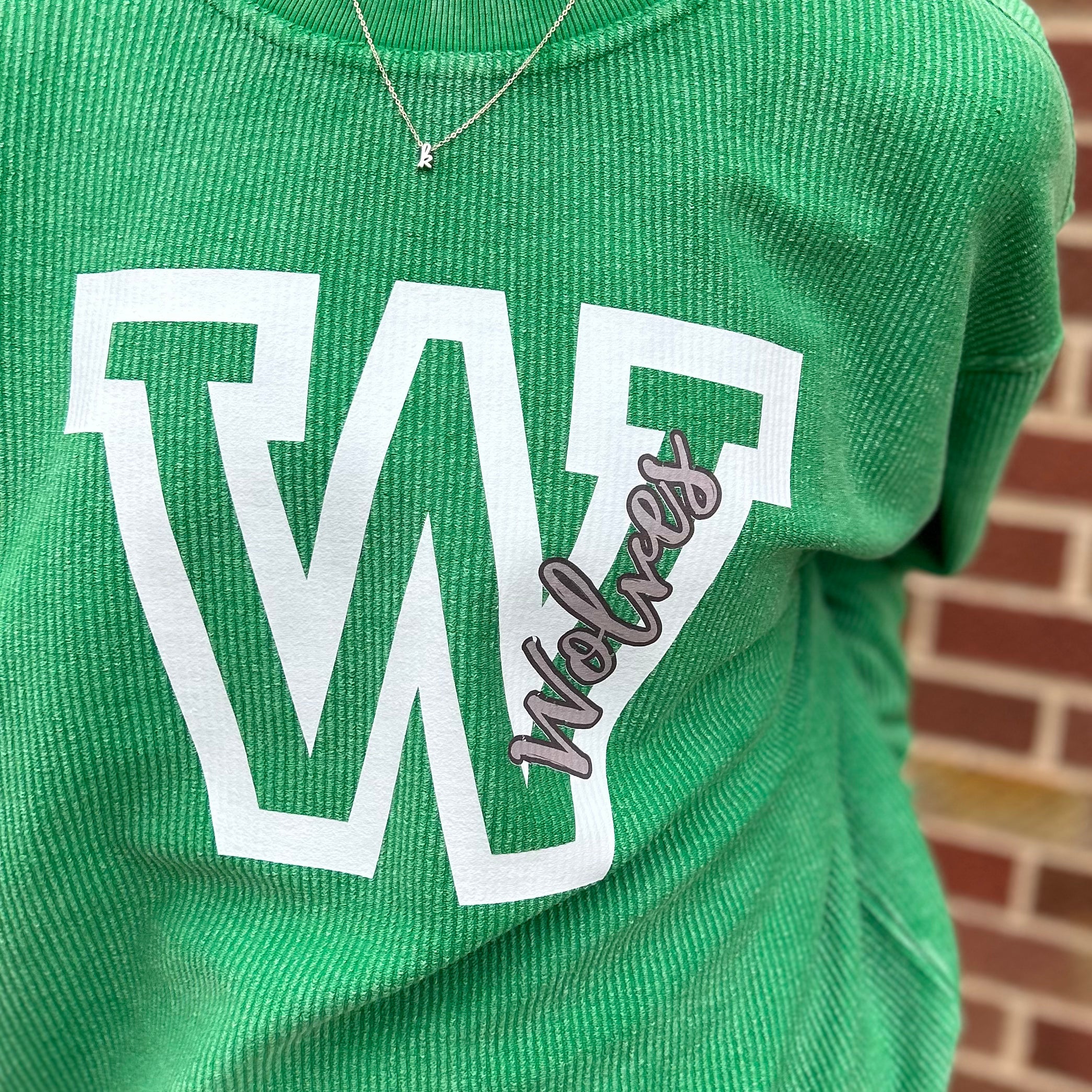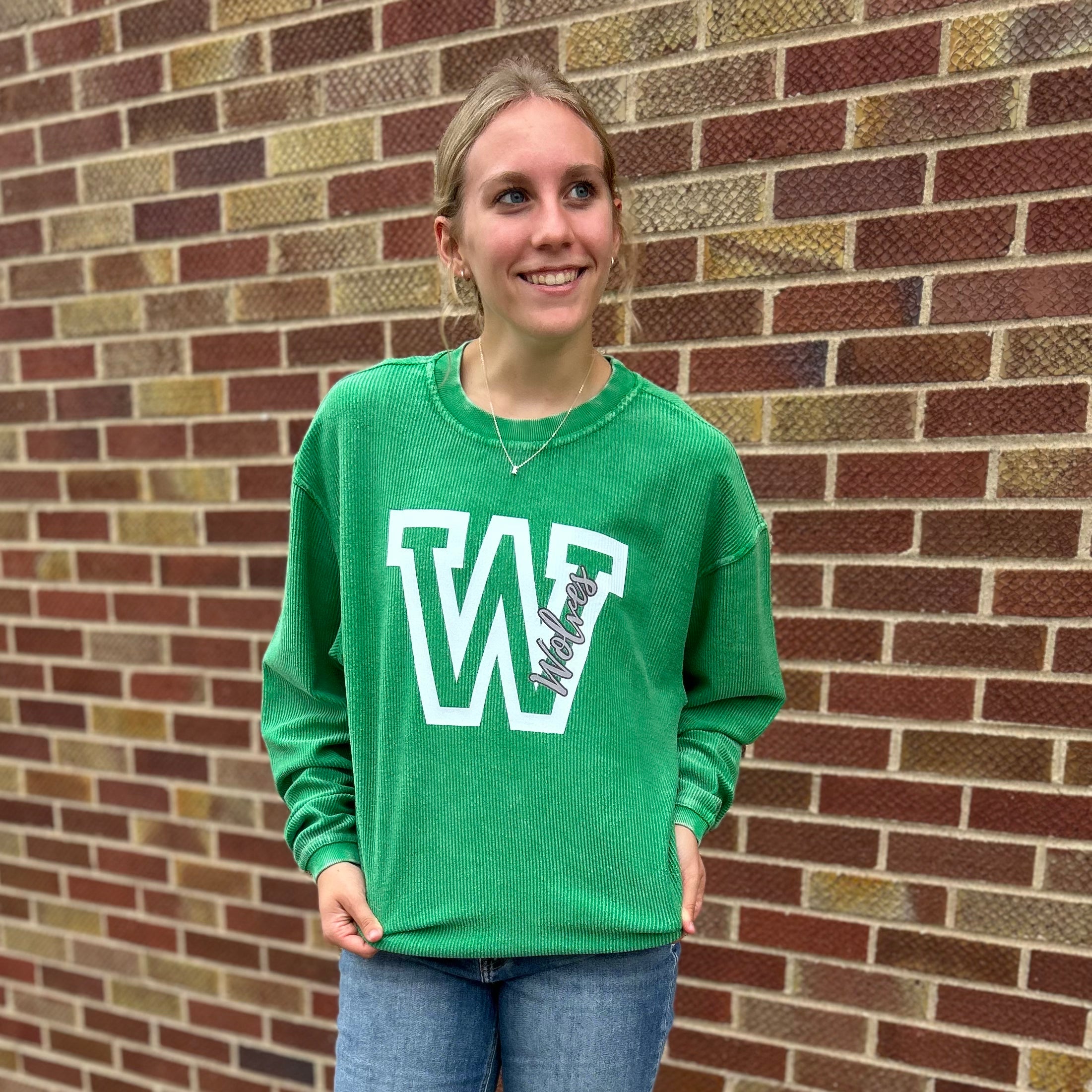 This Green Wolves Corded Crew Neck embodies casual style and school pride. Its quality construction ensures lasting comfort and durability, perfect for everyday wear. Show off your school spirit with the classic design and vibrant green color.