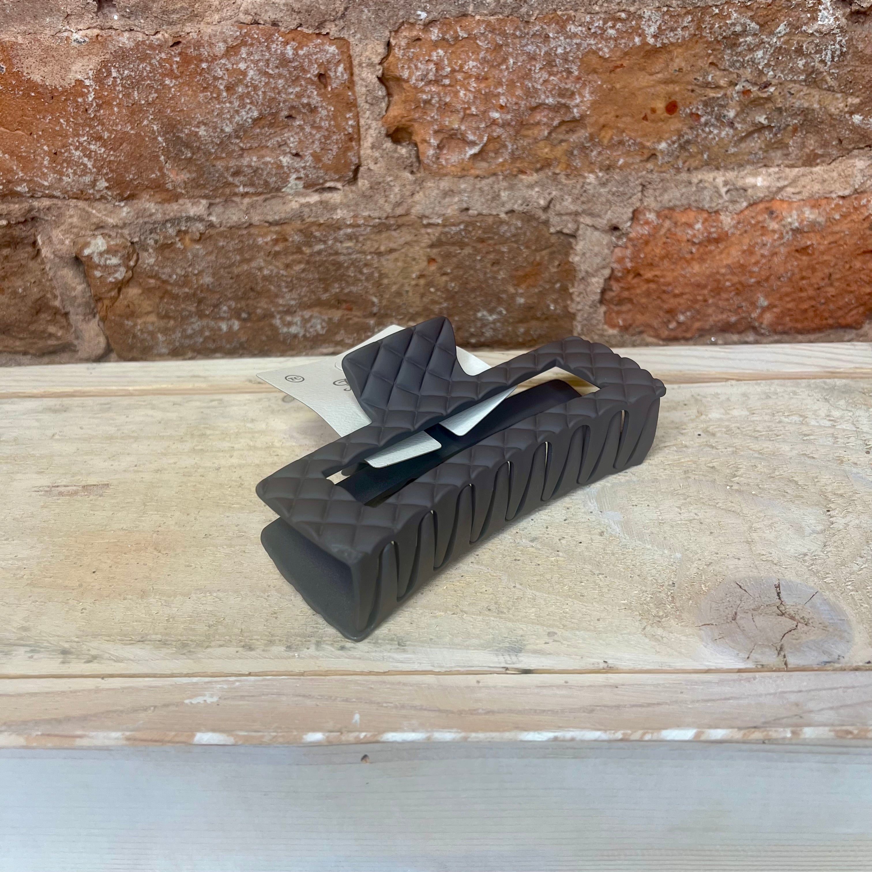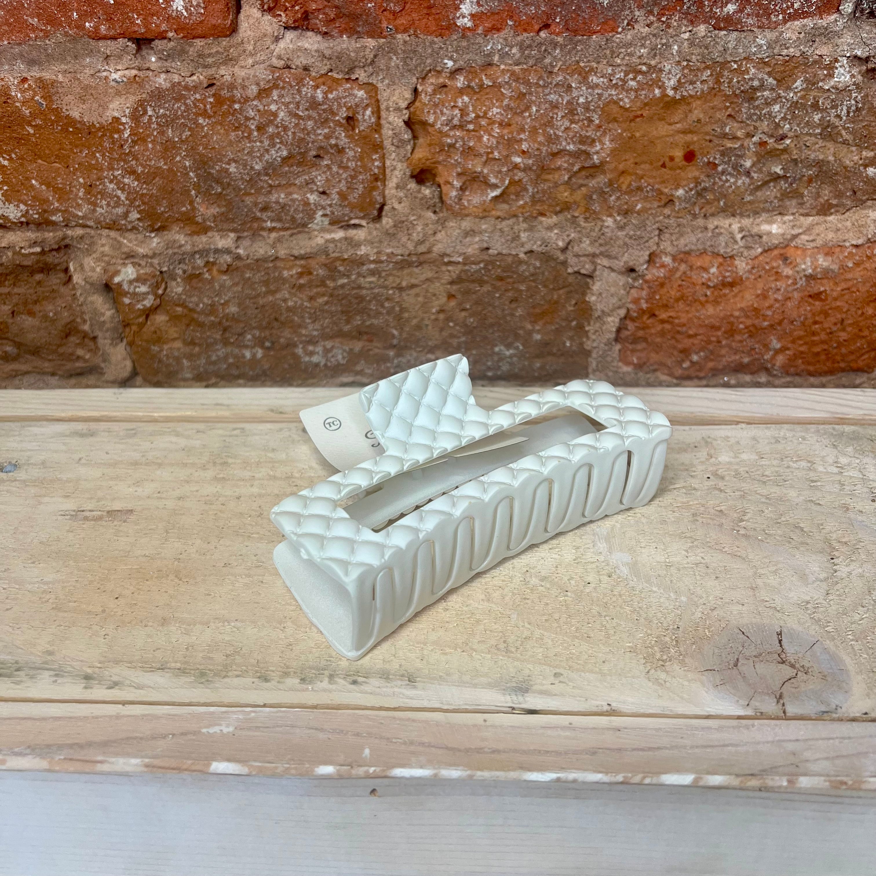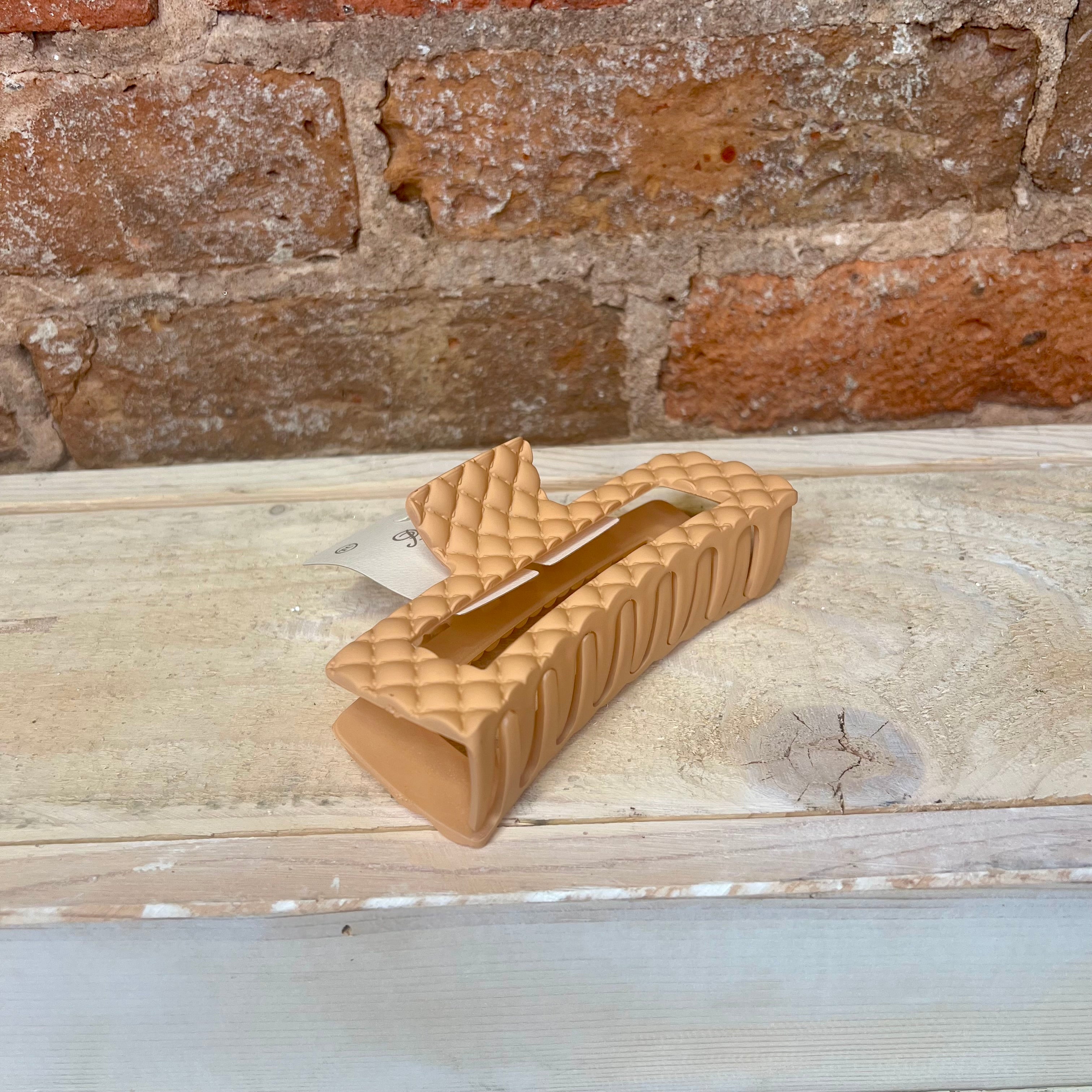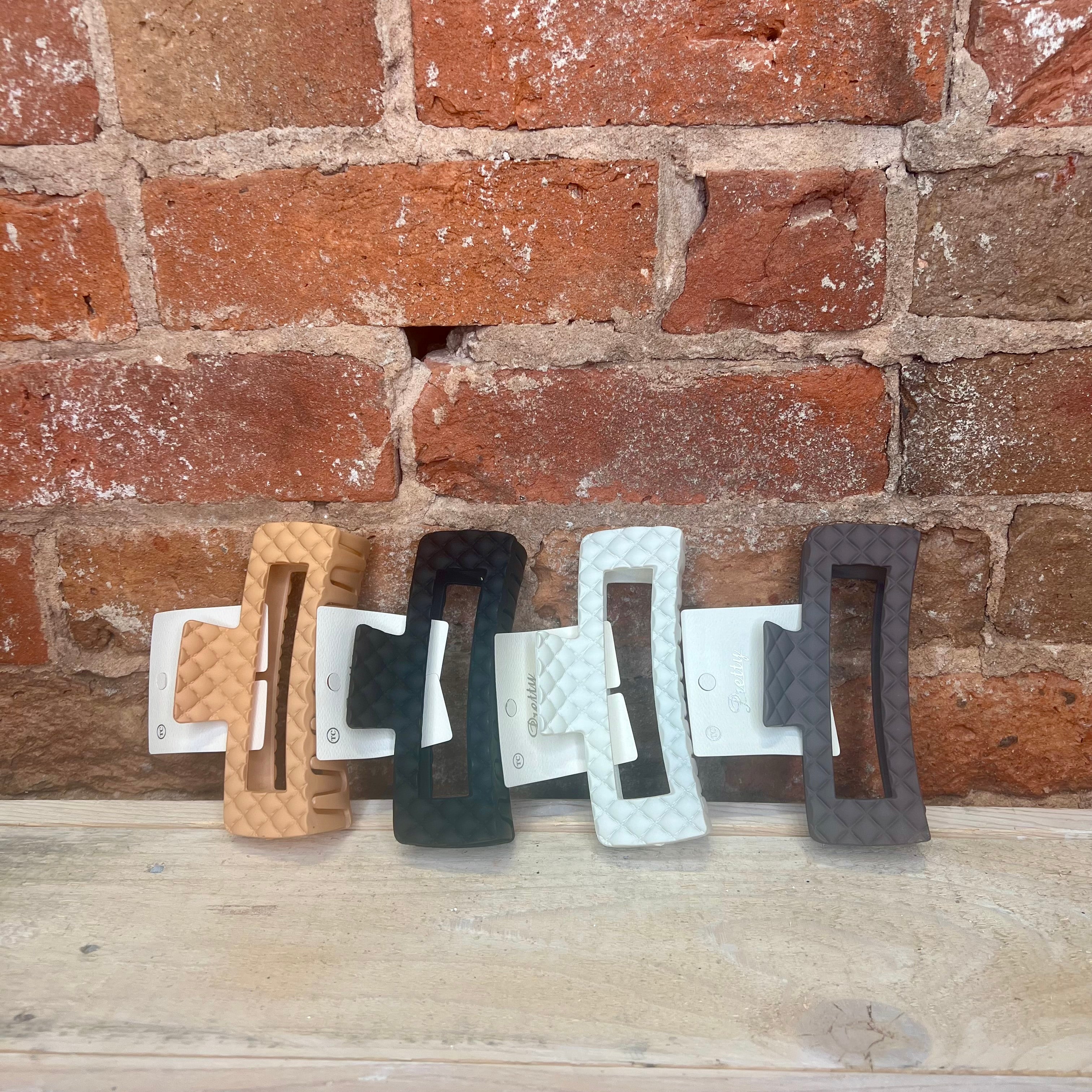 Add a splash of fun to your hair game with the Textured Matte Jumbo Hair Claw! Available in mocha, cream, black, and apricot, this claw features a diamond stitching pattern. Perfect for holding thick locks with ease while keeping you looking effortlessly cool.