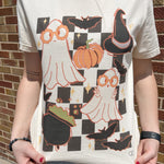 This oversized tee features a captivating Halloween-themed design with a checkerboard pattern, playful ghosts, a witch hat, and a bubbling cauldron brew. Crafted for comfort and style, its relaxed fit makes it perfect for festive occasions or casual wear, while the detailed graphic captures the spooky spirit of the season with a unique artistic flair.