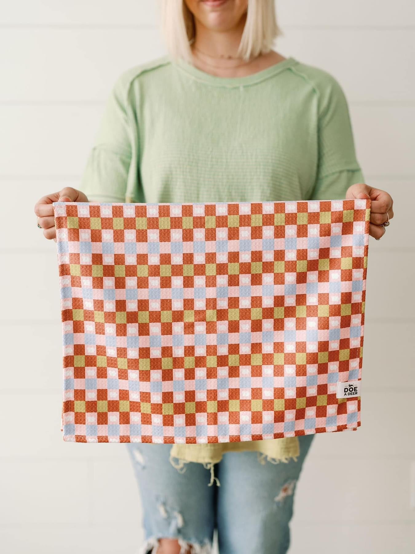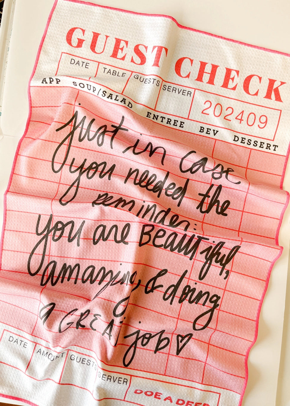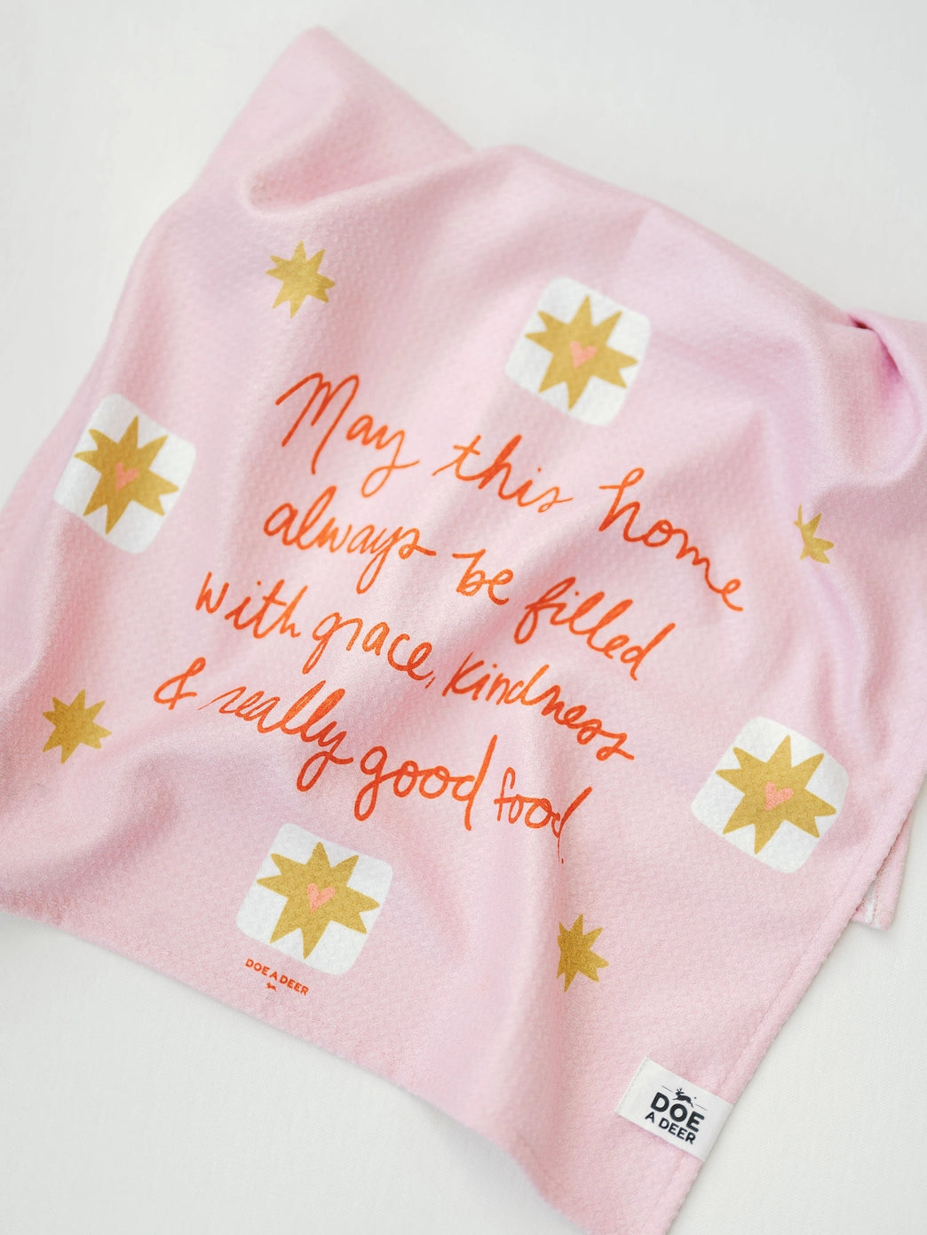 The perfect addition to your kitchen! This pretty pink towel not only adds a pop of color, but it's absorbent waffle texture makes drying dishes a breeze. The sweet message and quilt feature add little touches of charm. Perfect for your kitchen where you’re making the good food, or gift to someone who is always offering up the good food and tons of kindness!
