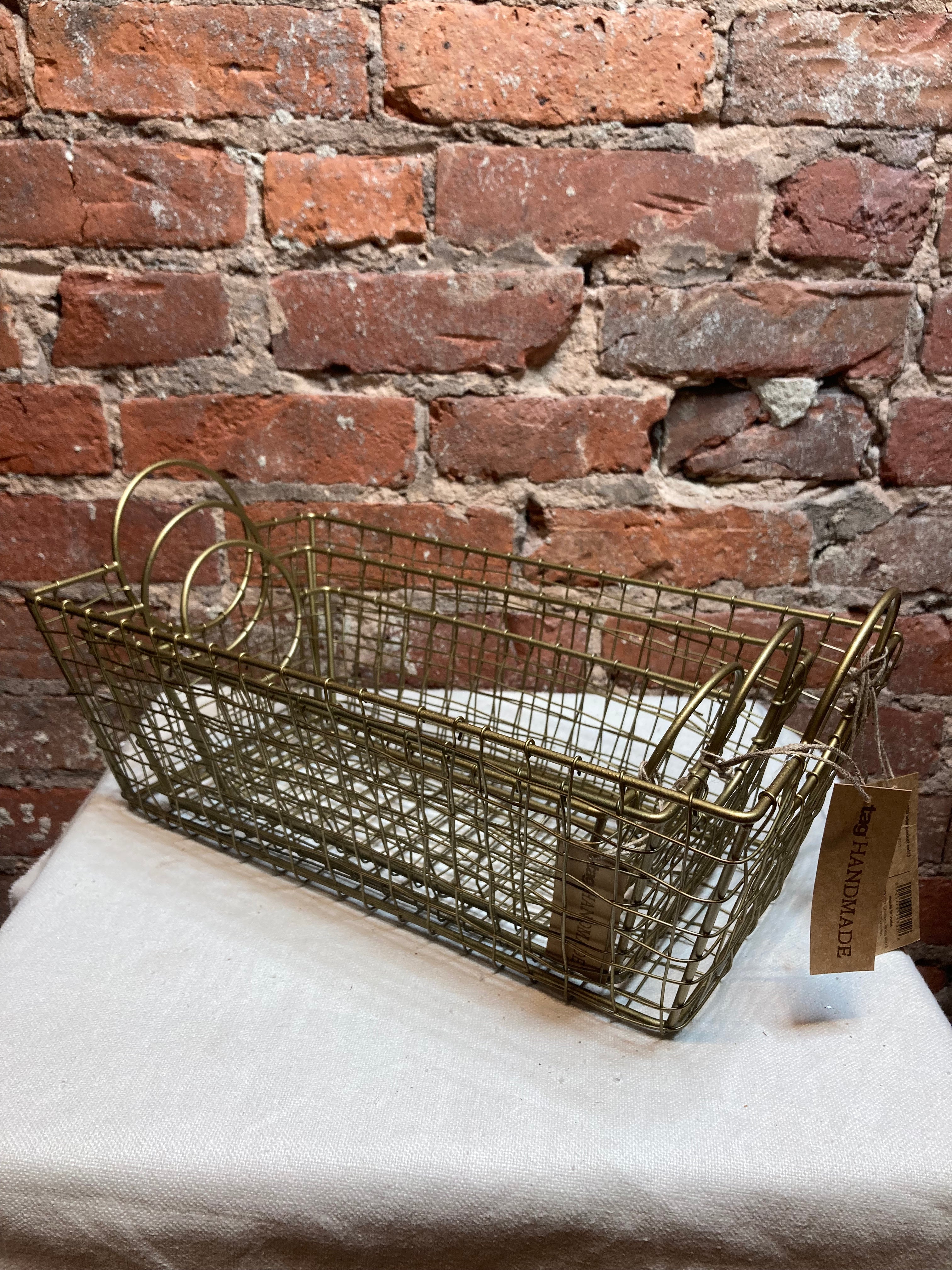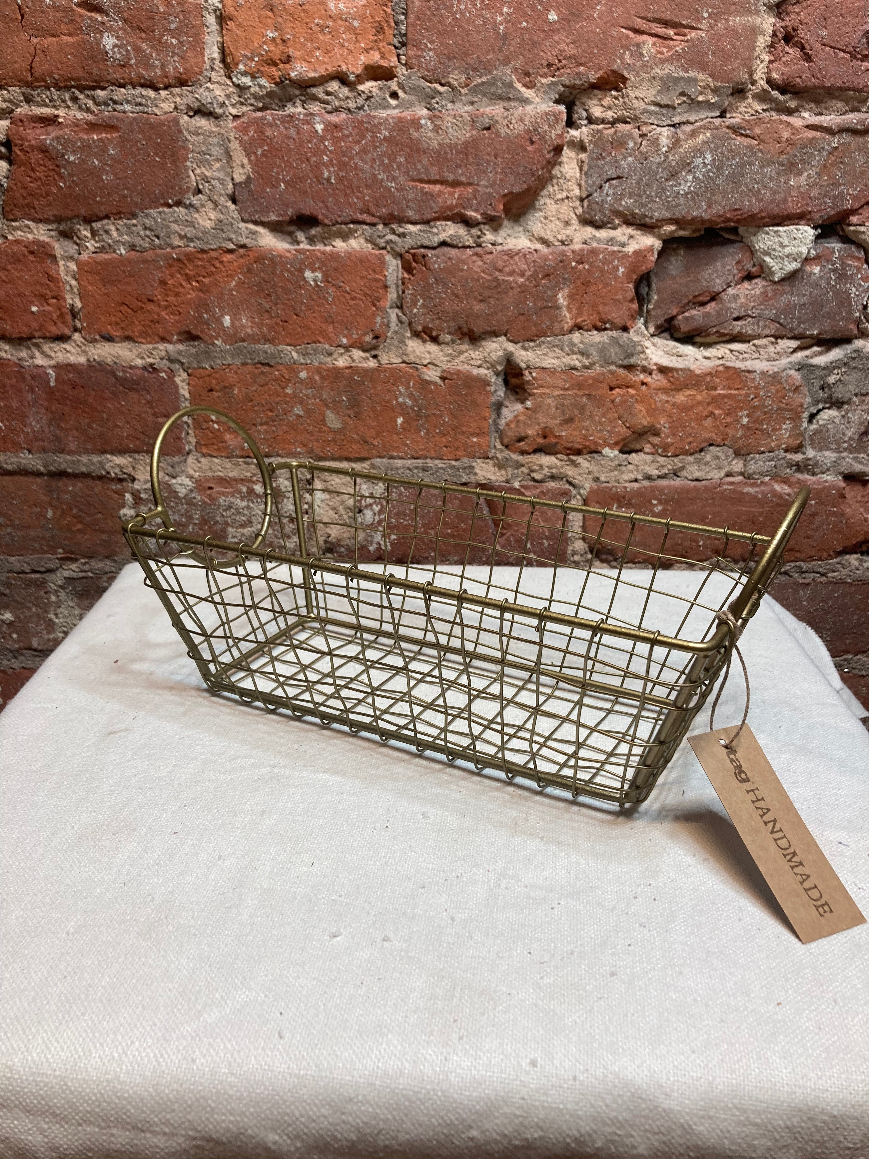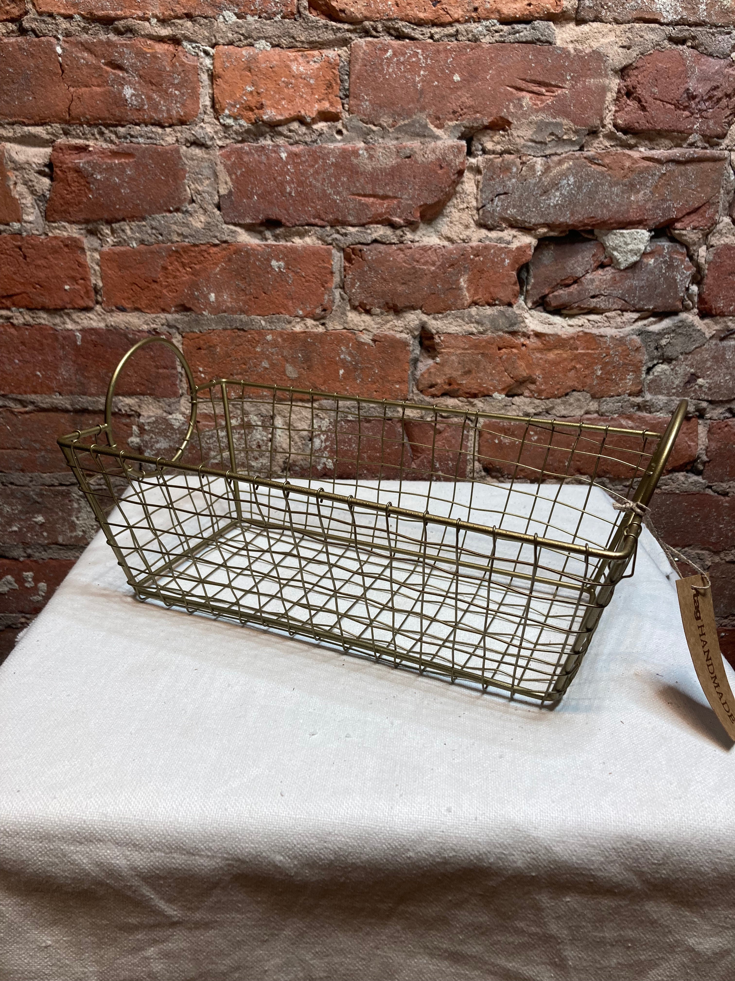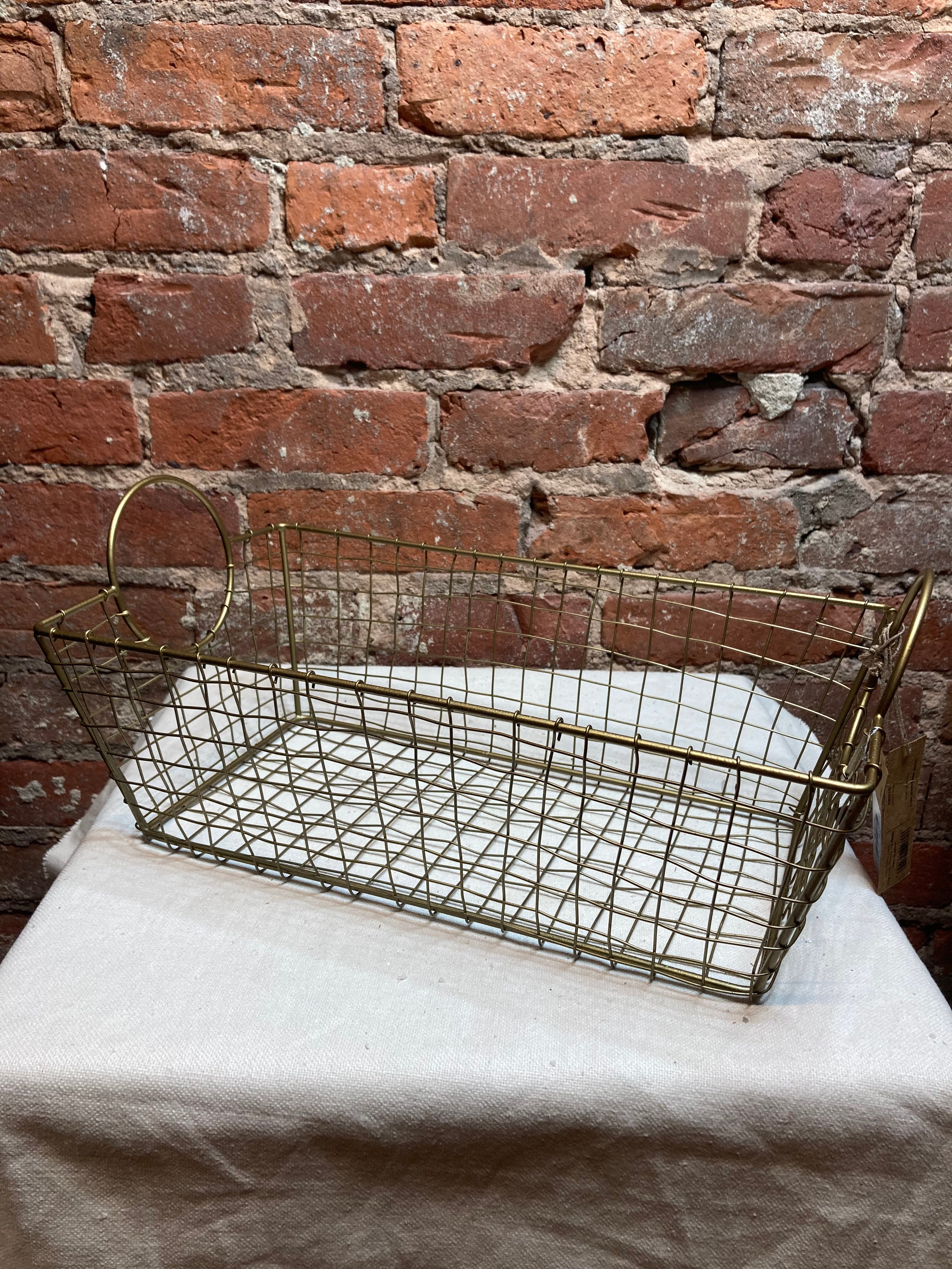 Gold wire basket with circular handles that comes in a variety of sizes: 11.75"x5.5", 14"x7", and 15.74"x8.5". Each size of this basket is sturdy and will be a great addition to your home decor. Sold separately.