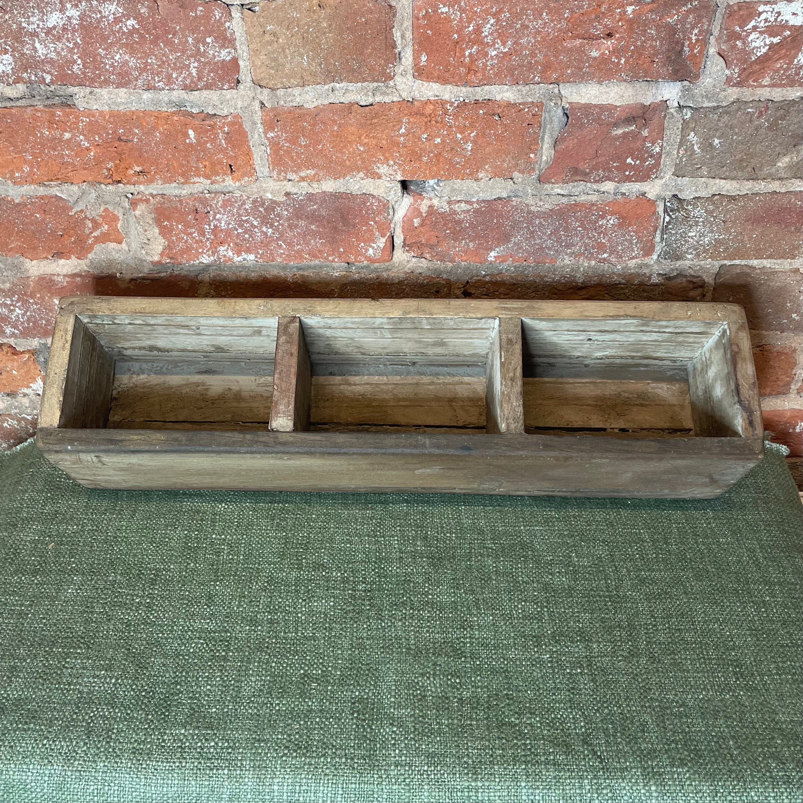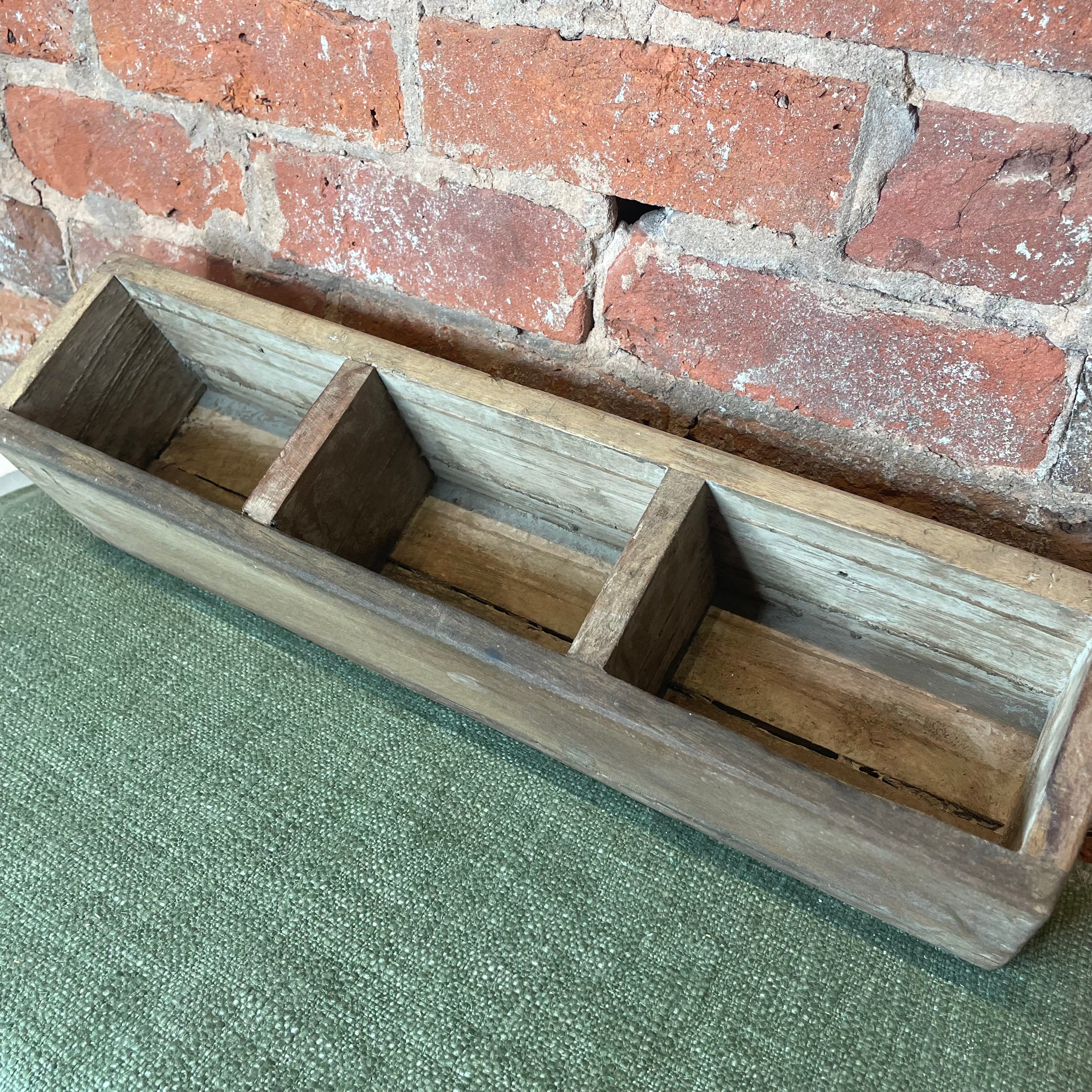 Expertly crafted from reclaimed wood, this three section wall container offers both style and organization. With its sturdy construction and unique design, it is perfect for displaying plants, storing small items, or adding a rustic touch to any room. Upgrade your home decor with this functional and eco-friendly piece. 5x2”