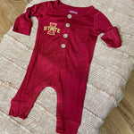 This red infant bodysuit features four wooden buttons on the top and the Iowa State logo printed on the top left. Designed for comfort and durability, it offers a soft fit that allows young fans to proudly showcase their team spirit with expert craftsmanship