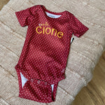 This red short-sleeve infant bodysuit is adorned with white polka dots and features "little cyclone" printed in yellow lettering on the front. Crafted for comfort and ease, it provides a soft, breathable fit ideal for young Iowa State supporters.