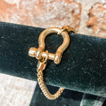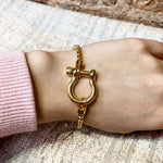 This Gold Horsebit Chunky Link Bracelet features a bold and timeless design. With its chunky links and iconic horsebit detail, this bracelet adds a fun touch to any outfit.