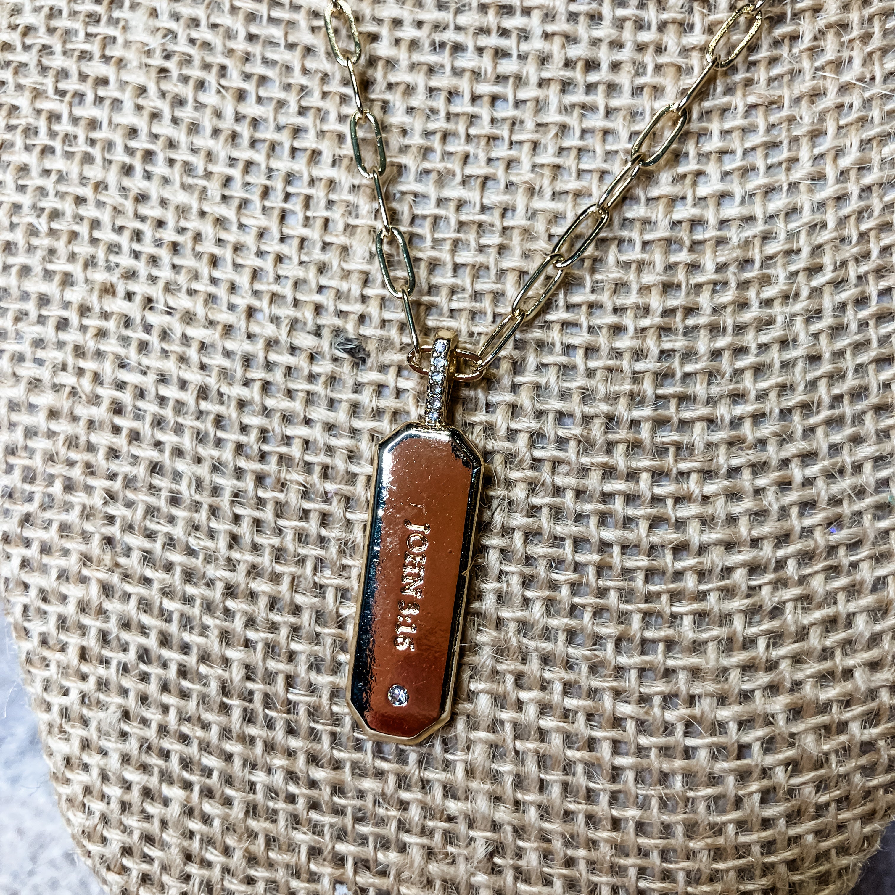 Elevate your style with our Gold Paperclip Chain John 3:16 Necklace. This necklace features a gold paper clip chain, and features a delicate charm, engraved with John 3:16 scripture. Perfect for everyday wear and a meaningful addition to your jewelry collection.