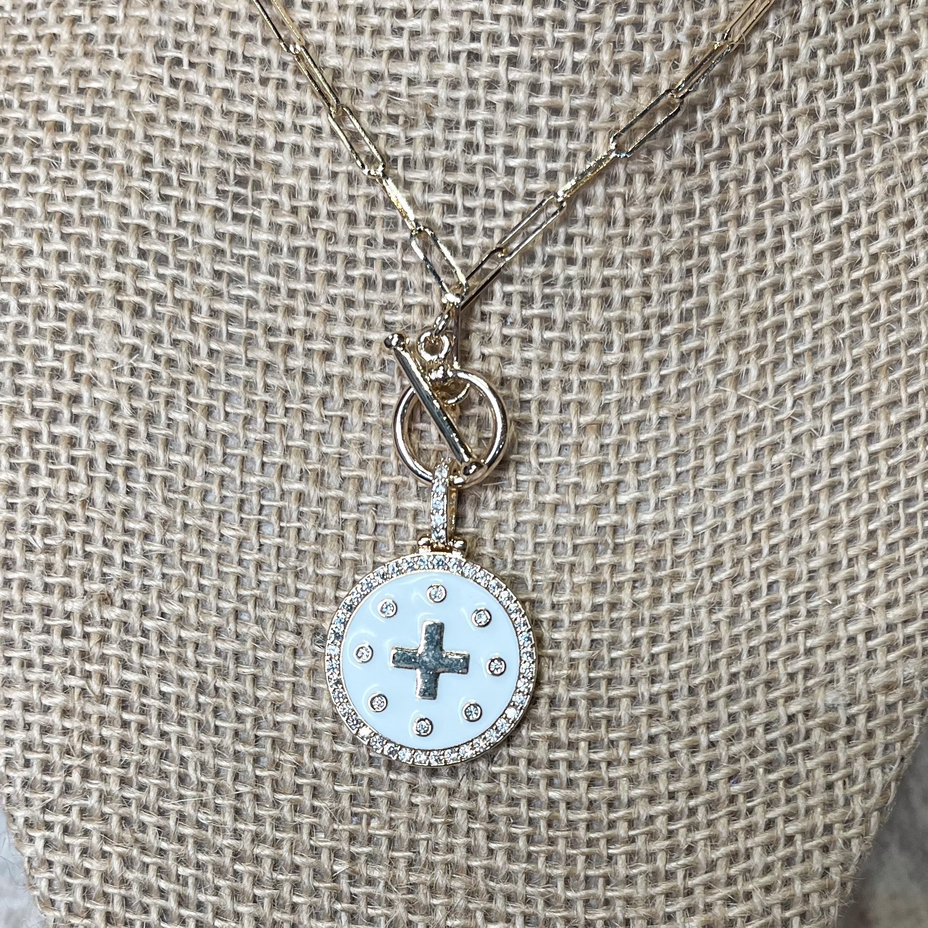 This elegant necklace features a gold paperclip chain and a white circle cross pendant. The toggle closure ensures a secure fit, making it perfect for daily wear. Complete your look with this timeless accessory.