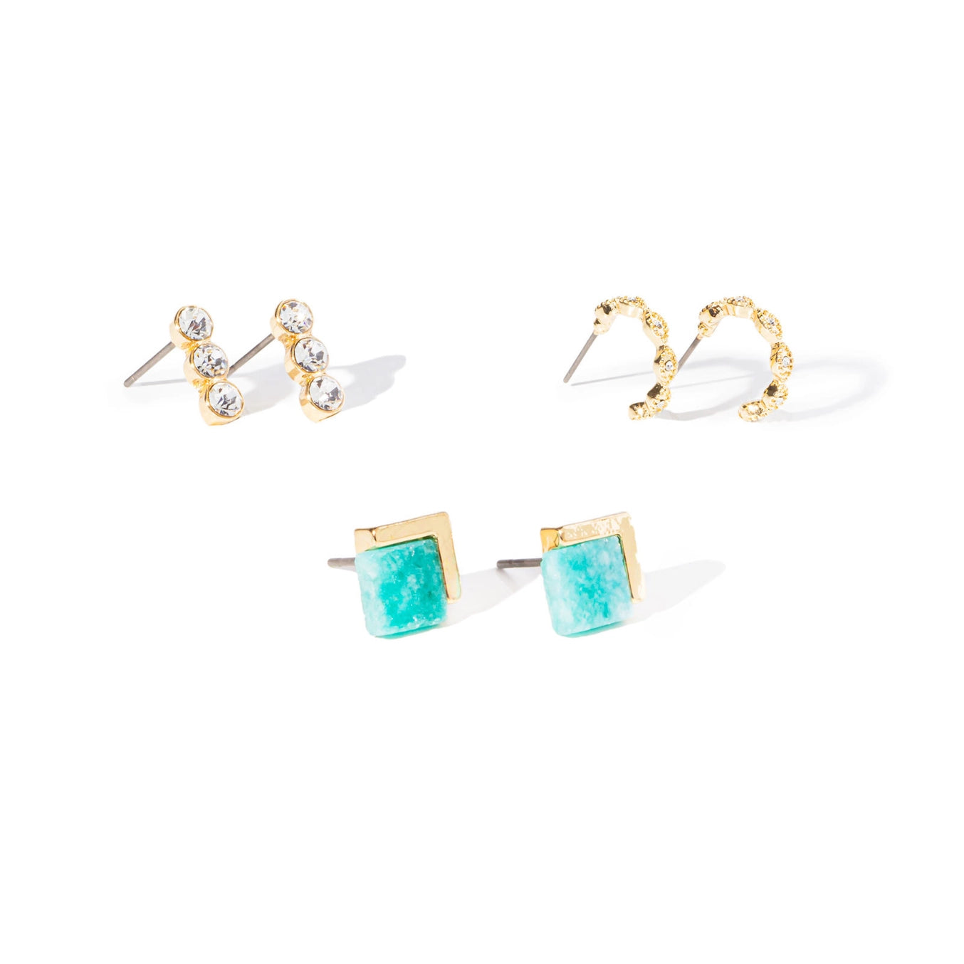 Designed with high-quality, nickel-free metals, each earring trio features a genuine semi-precious stone pair and two pairs of goldtone accent styles. Each stone in the Terra Collection is chosen for its unique energies and made super giftable with fun messaging on each card.