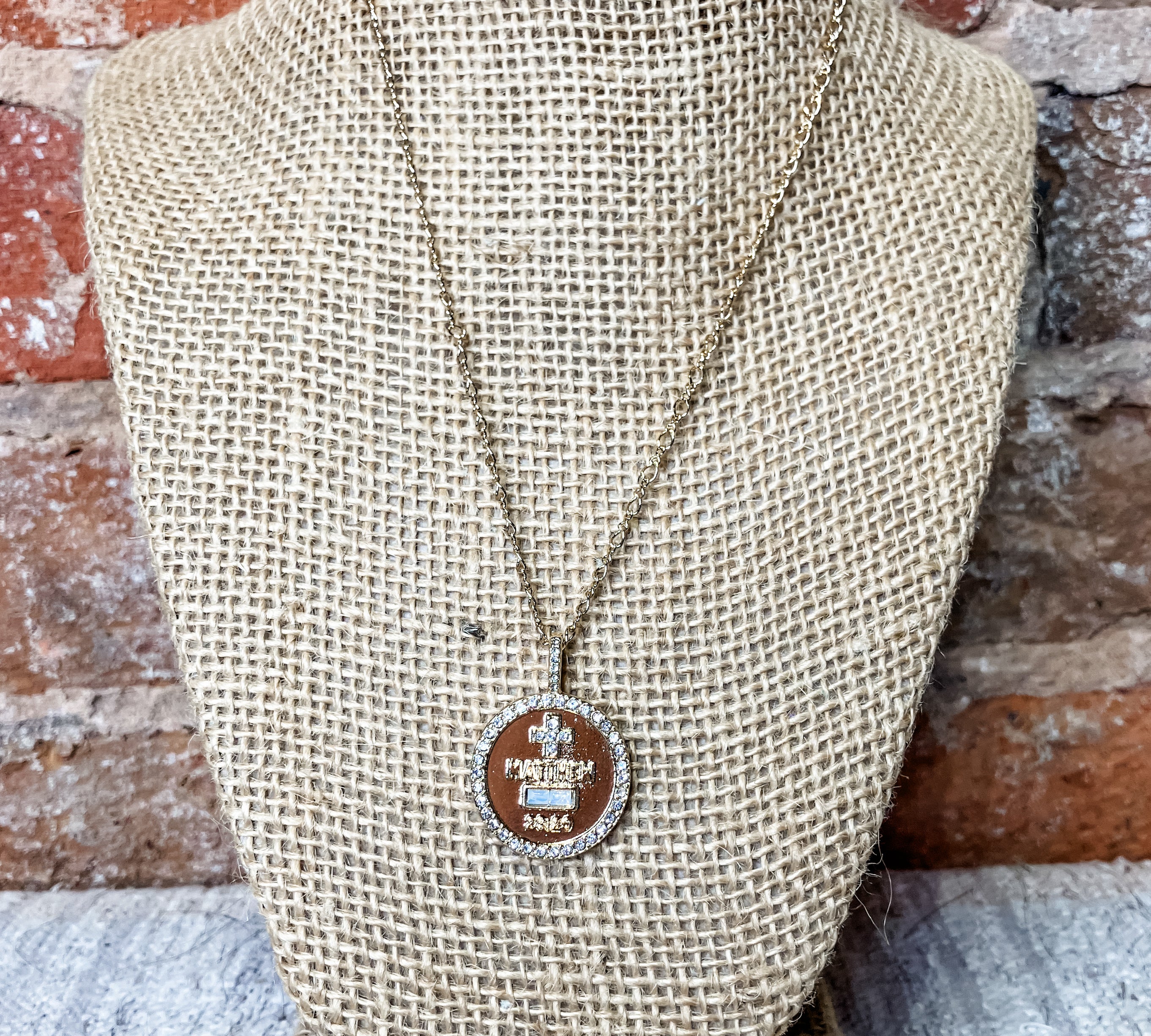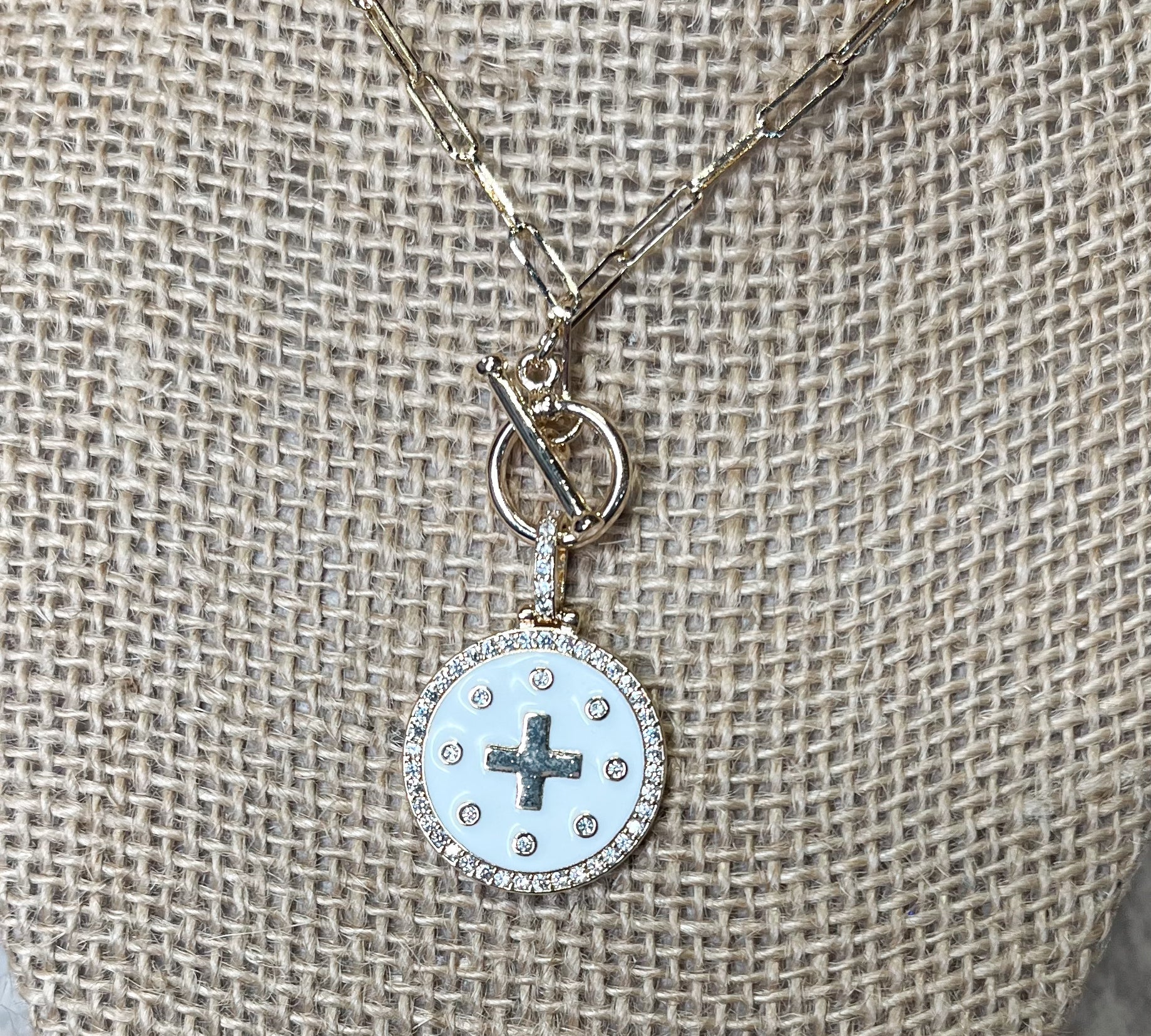 Gold Paperclip Chain Necklace w/White Circle Cross Pendant