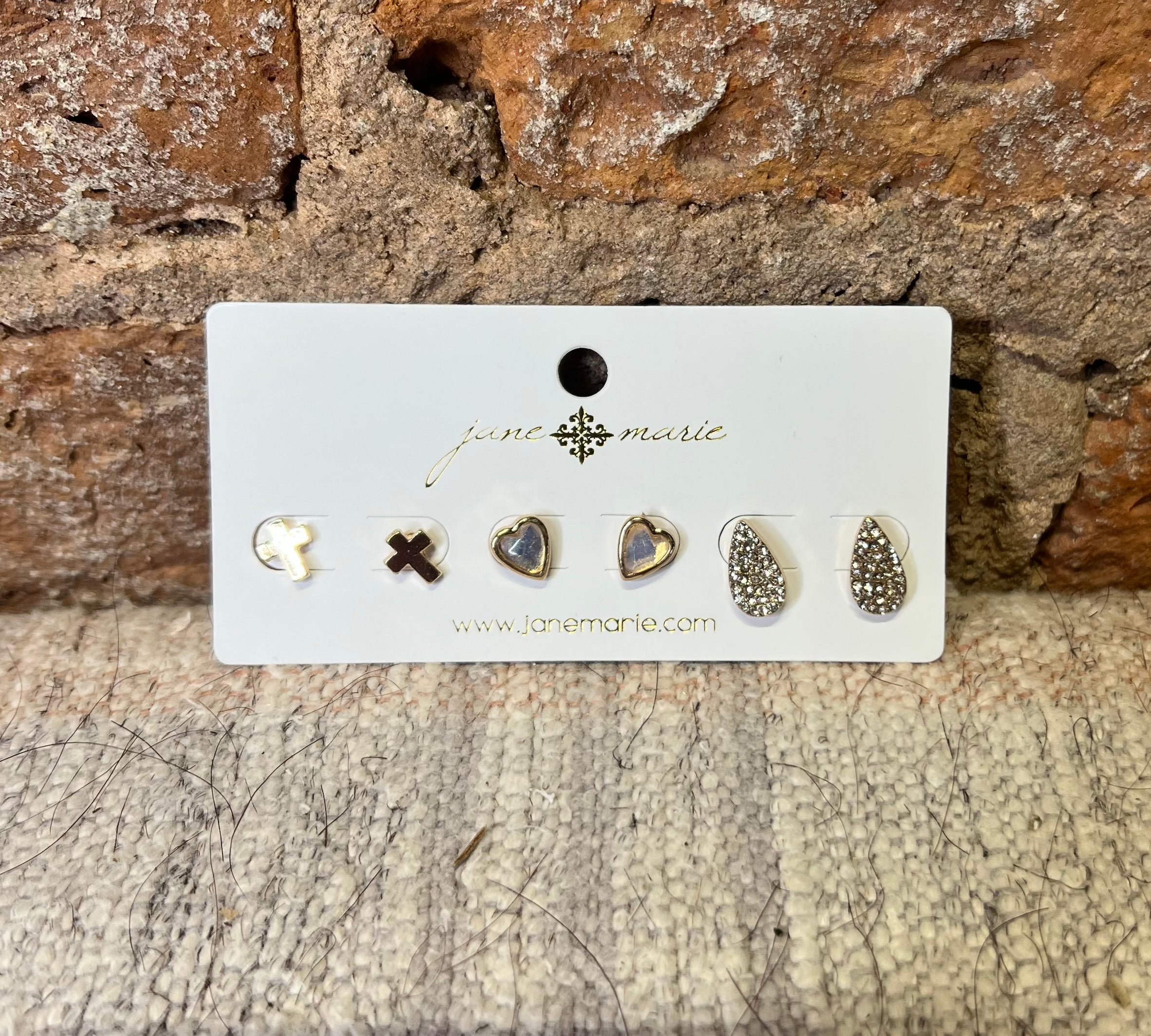 3 Stud Opal Heart/Rhinestone Teardrop/Cross Earring Set