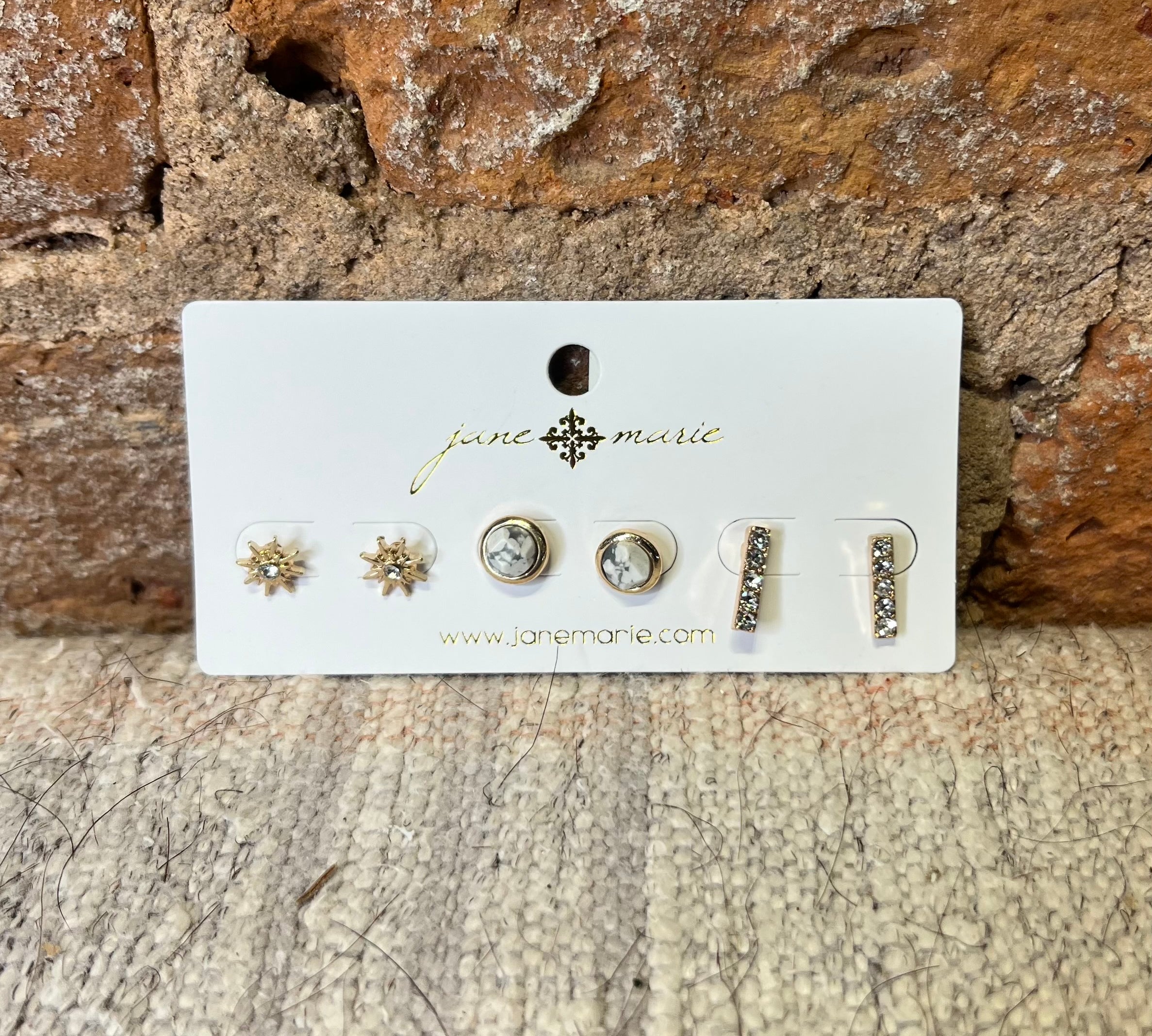 3 Stud Howlite Circle/Rhinestone Bar/Star Earring Set