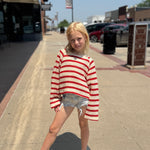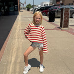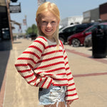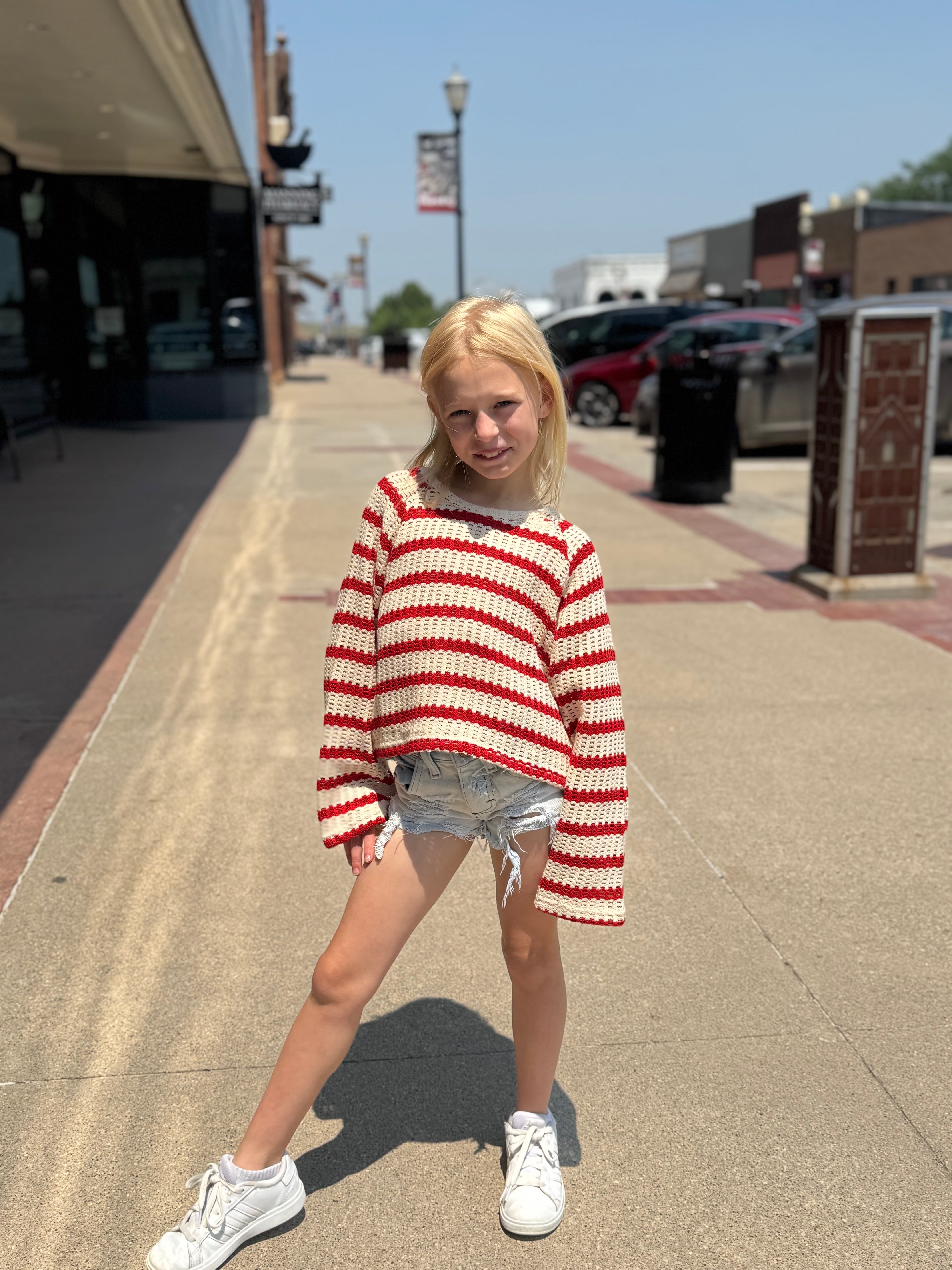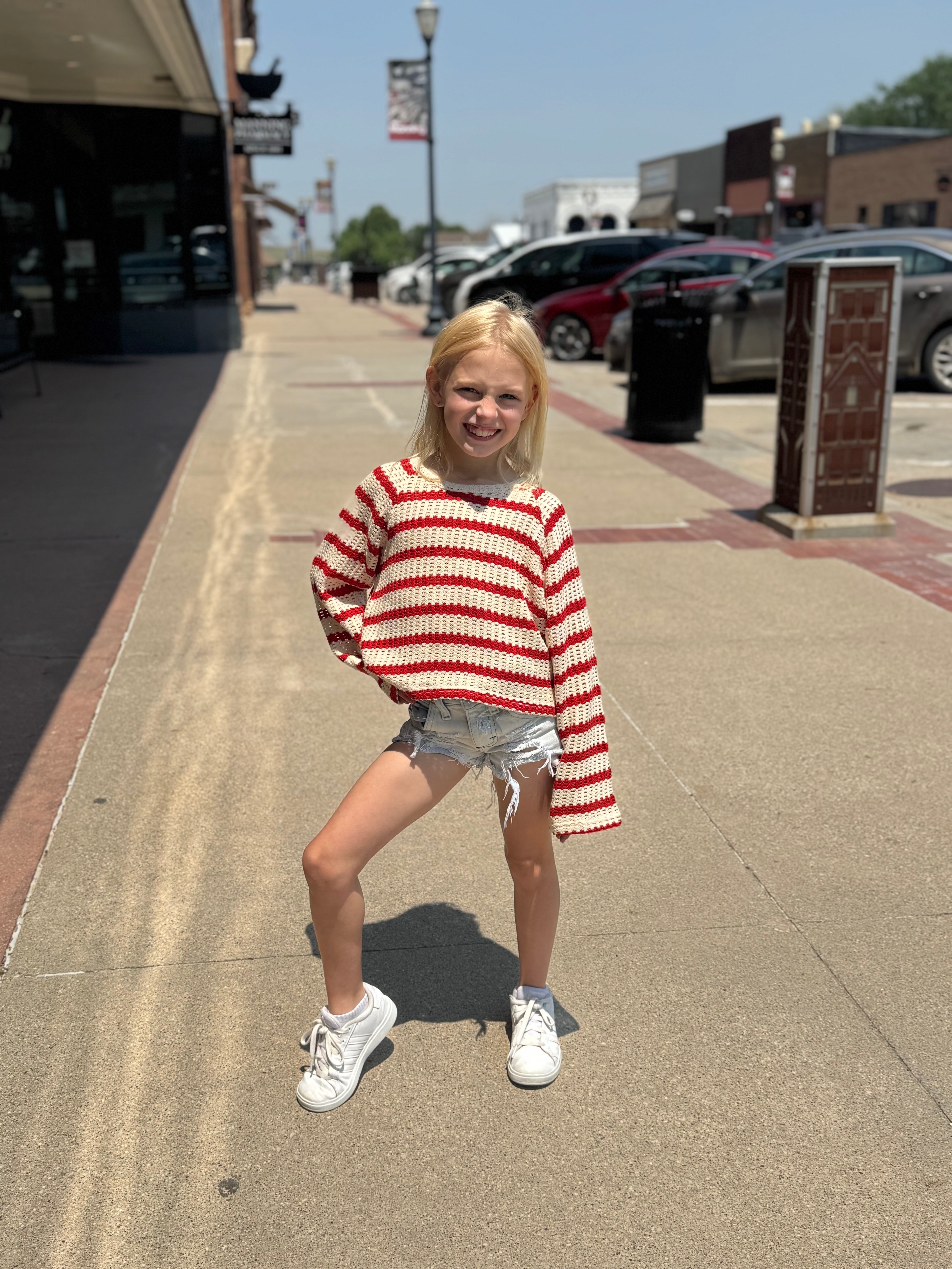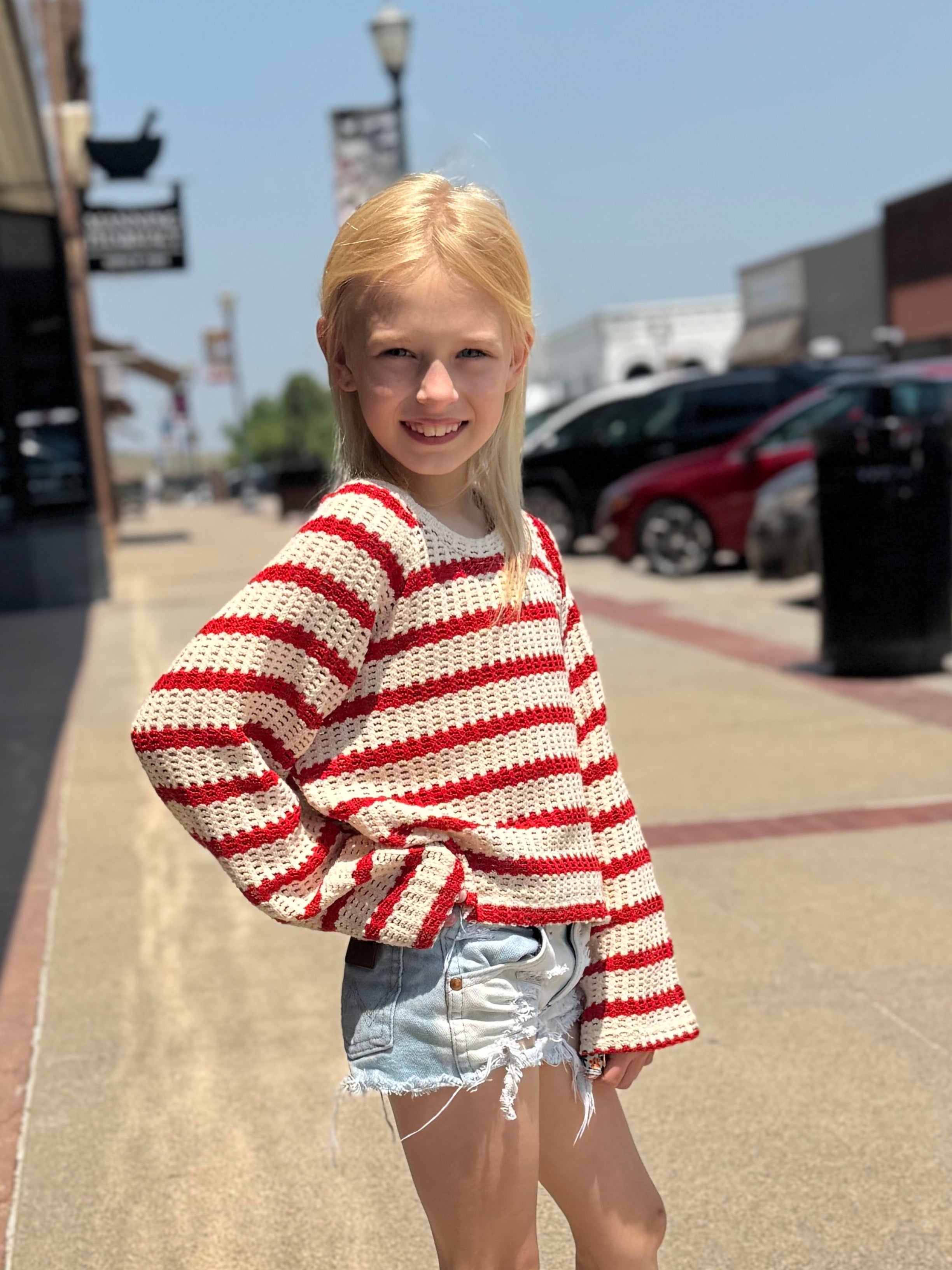 This Girls Cropped Crocheted Knit Striped Top features a delicate crochet pattern combined with bold stripes for a stylish, textured look. Its cropped fit offers a trendy silhouette, perfect for layering or pairing with high-waisted bottoms.