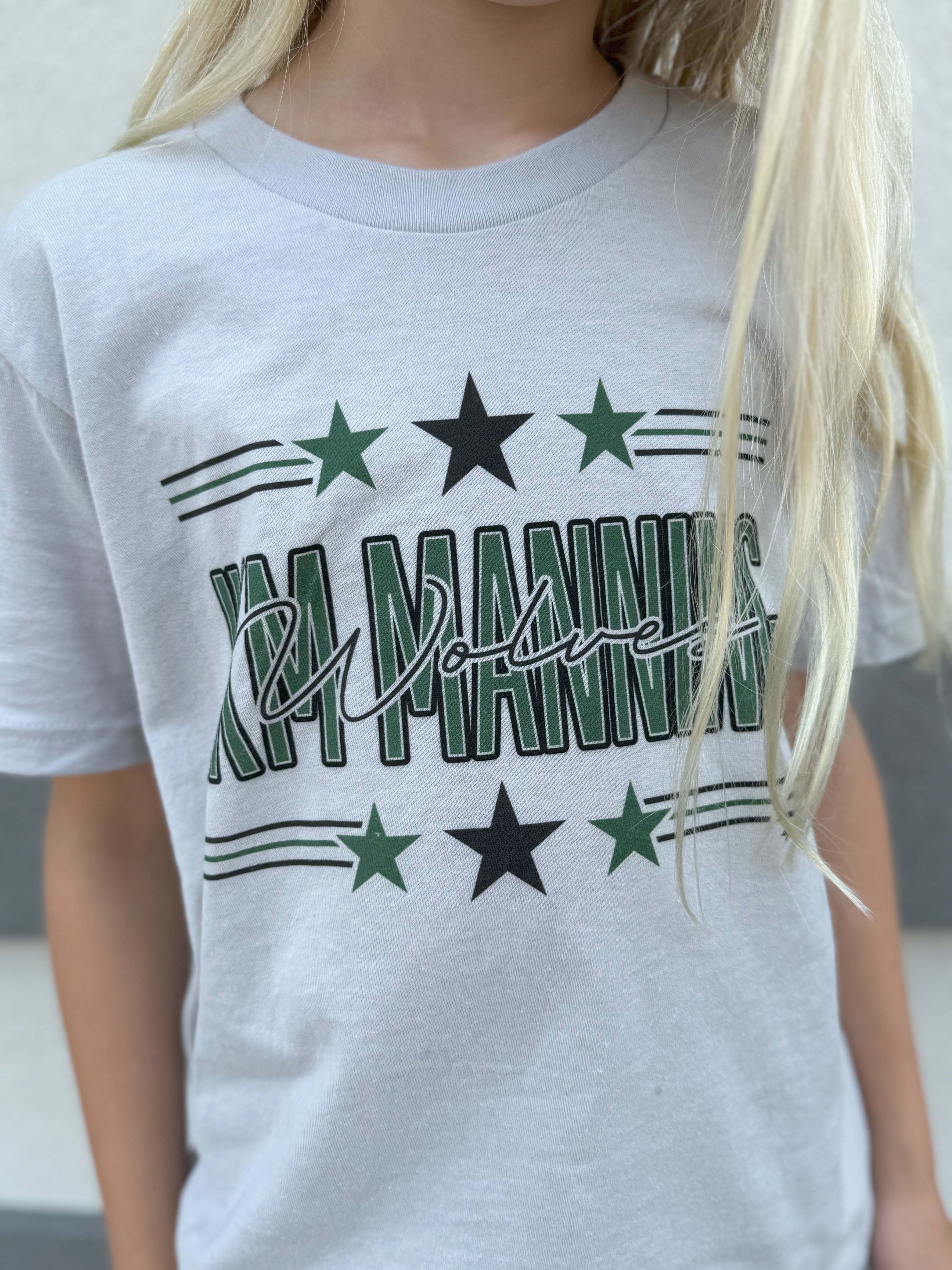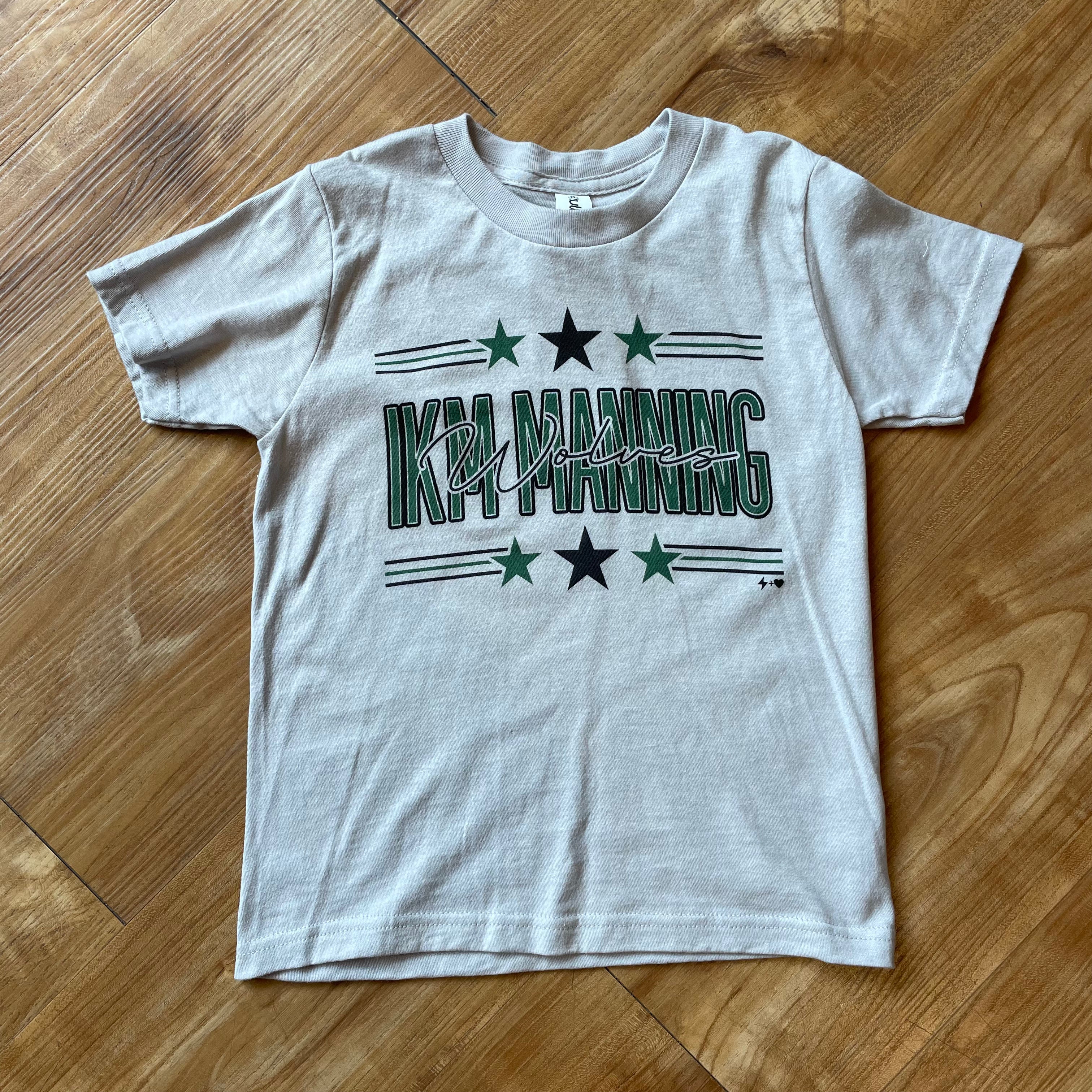 Update your kids wardrobe with this youth kids spirit stars tee shirt. Tultex brand light grey tee. IKM-Manning wolves in black and green with stars around it.