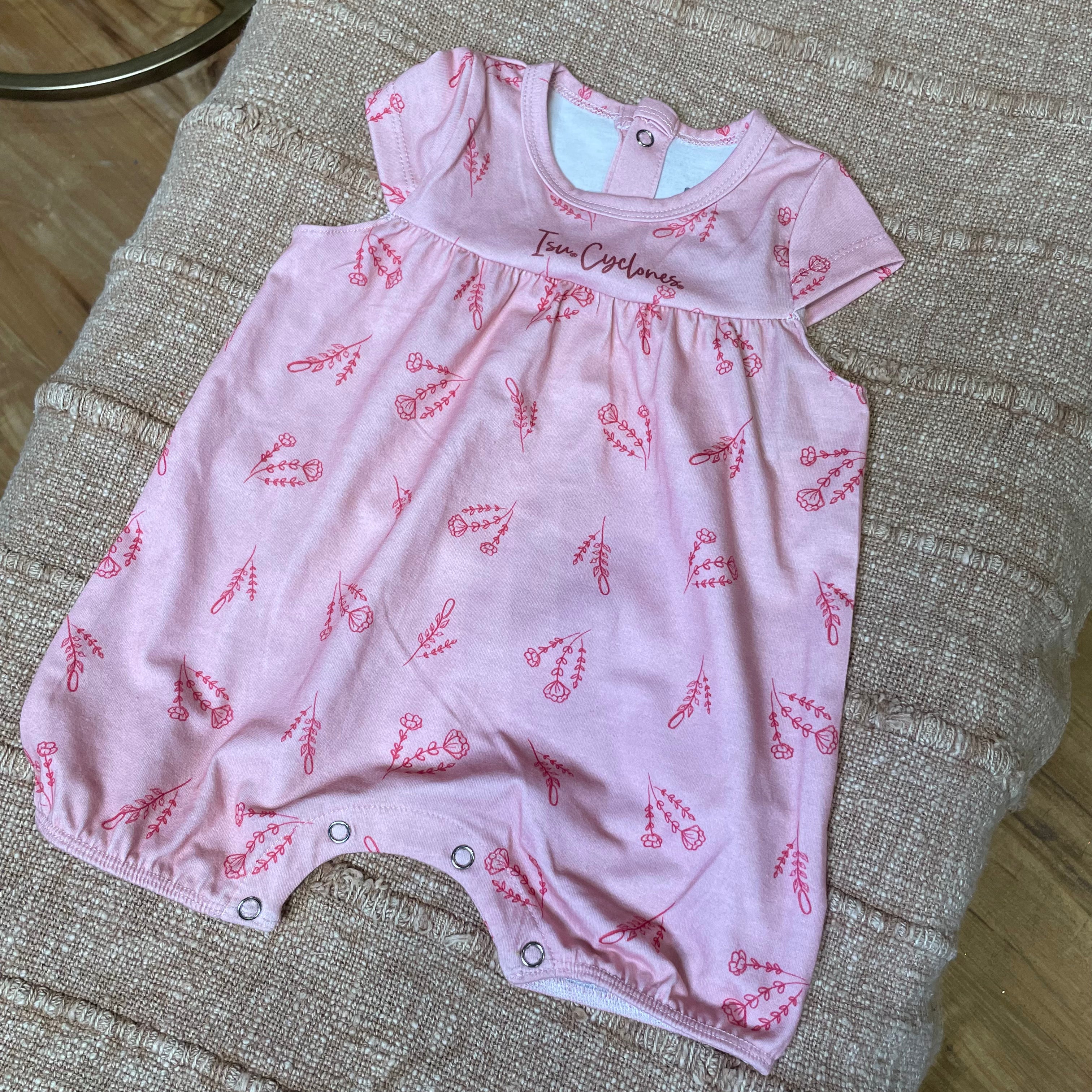 This pink short-sleeve infant romper features a floral design with "ISU Cyclones" prominently printed in red on the front. Designed for comfort and ease, it offers a soft fit perfect for young fans to showcase their team spirit with expert-quality craftsmanship.