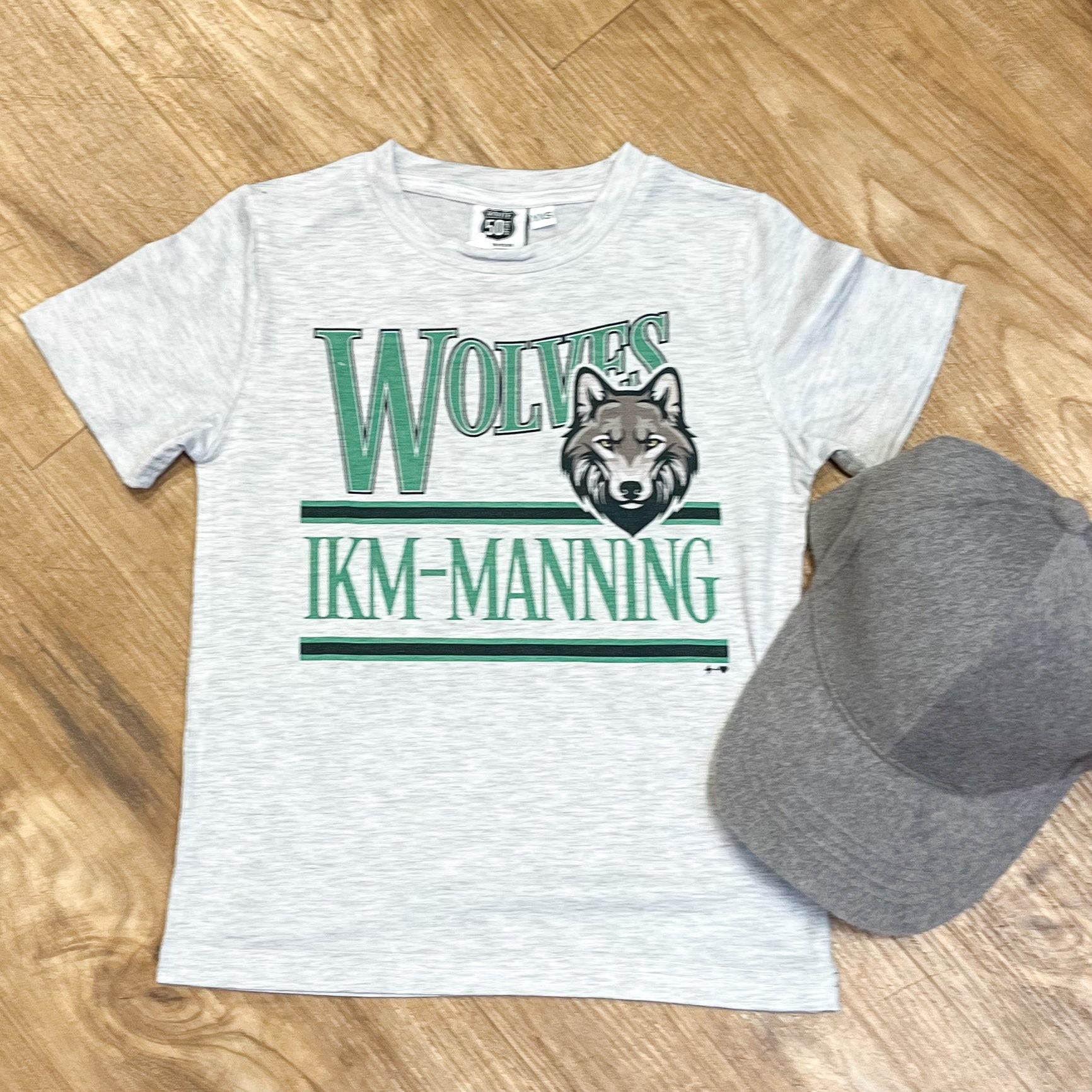 Get fierce with this IKM-Manning Wolves tee! Show off your team spirit with this curved mascot design, perfect for any fan.