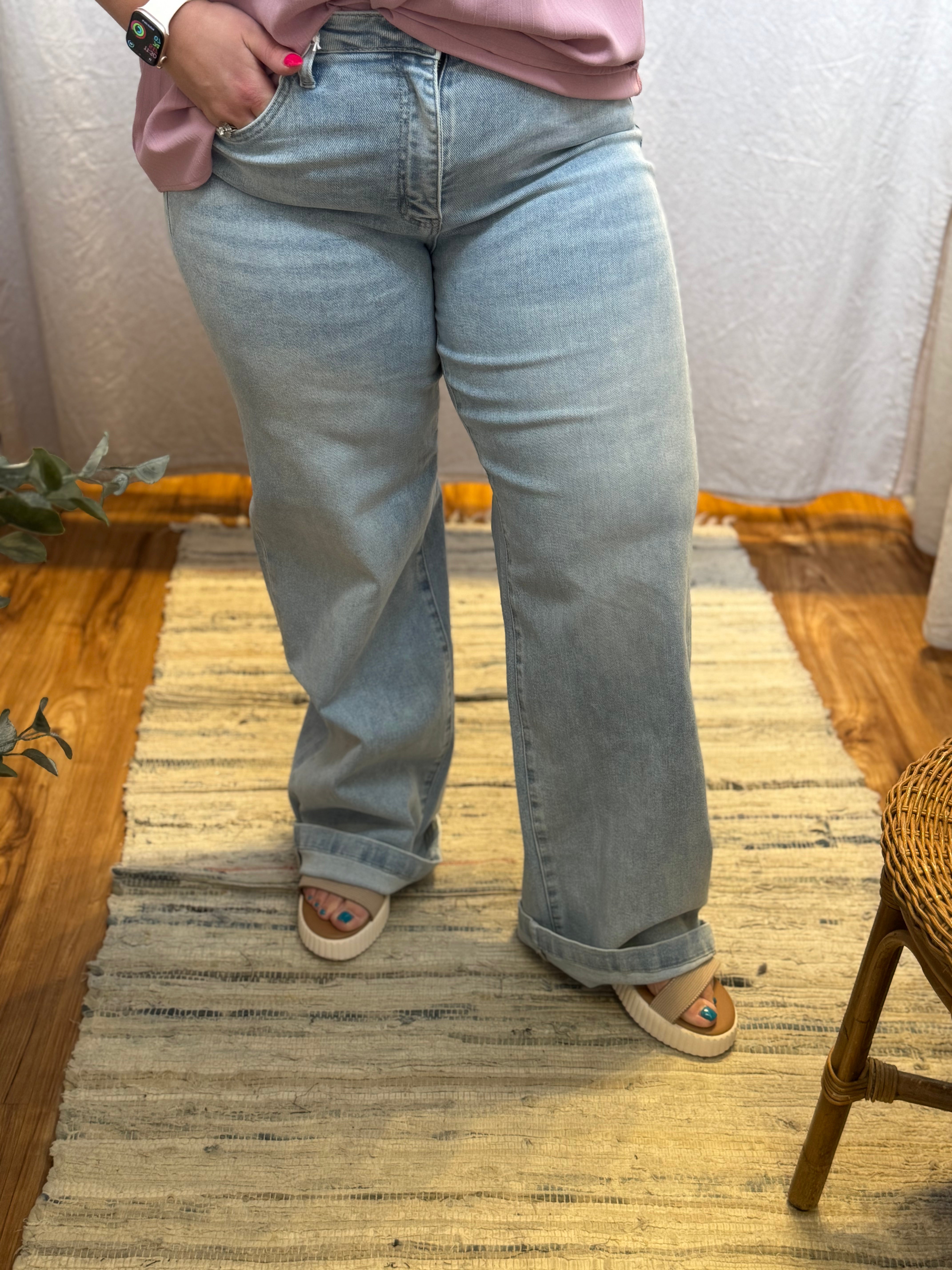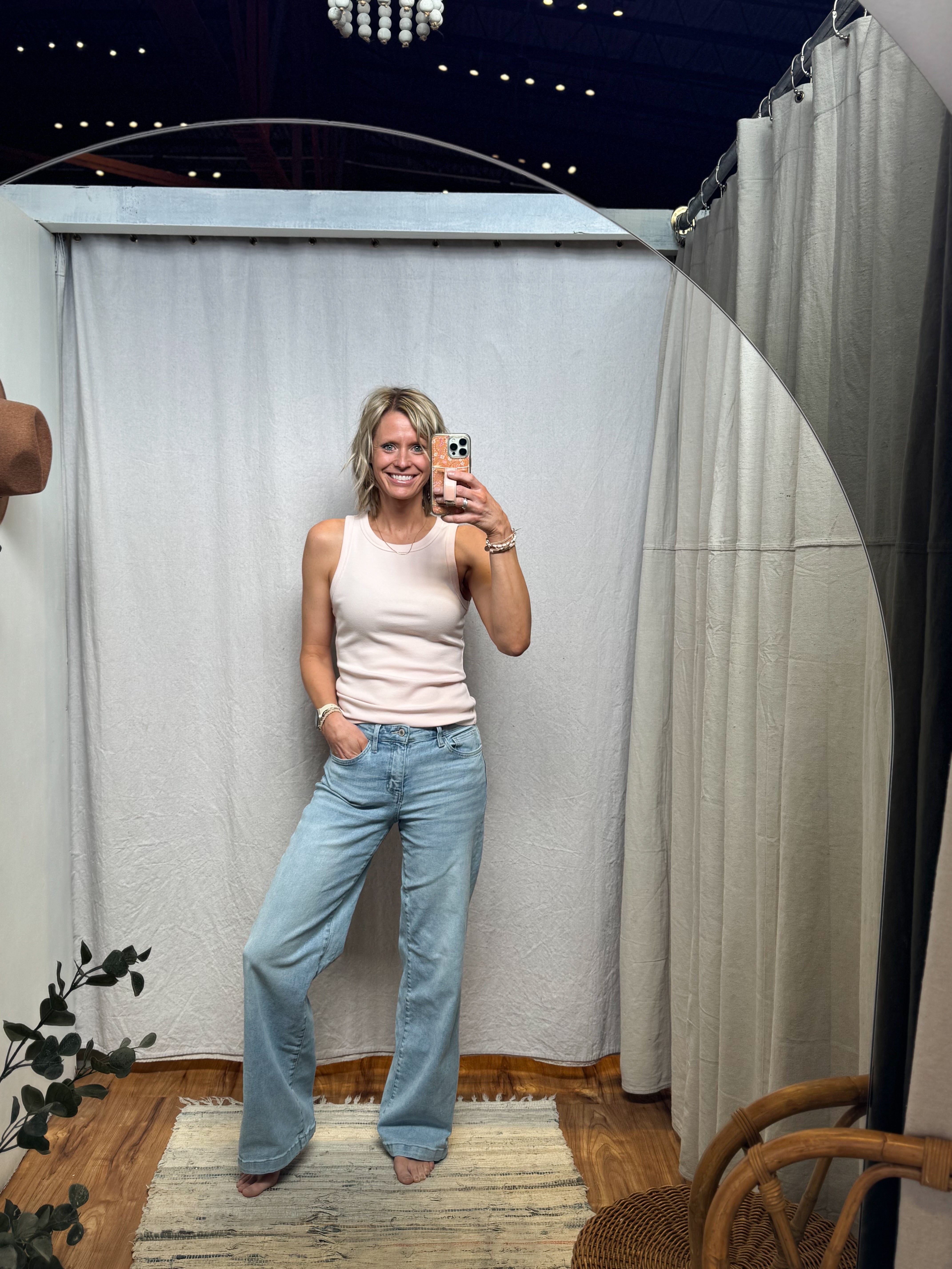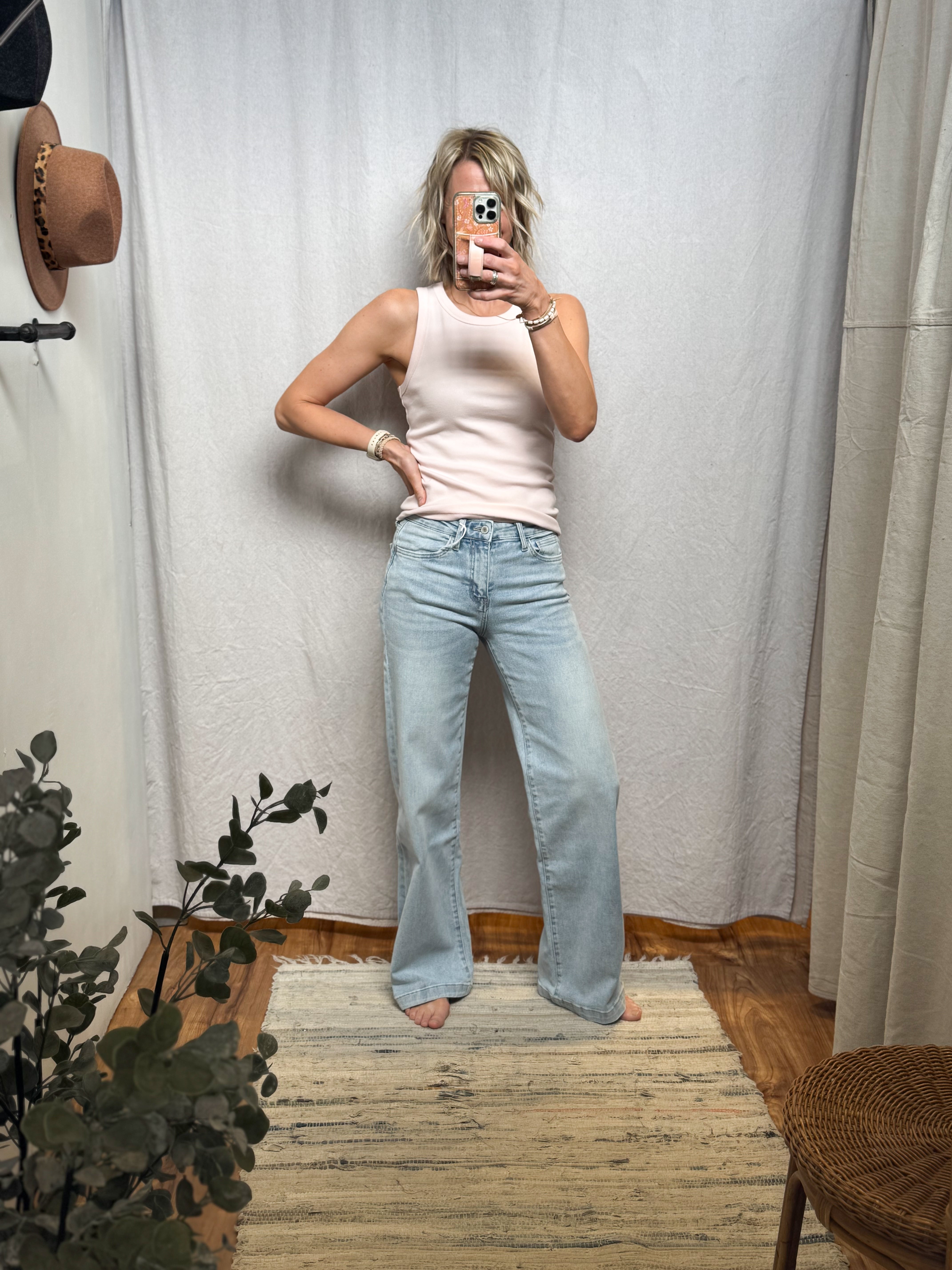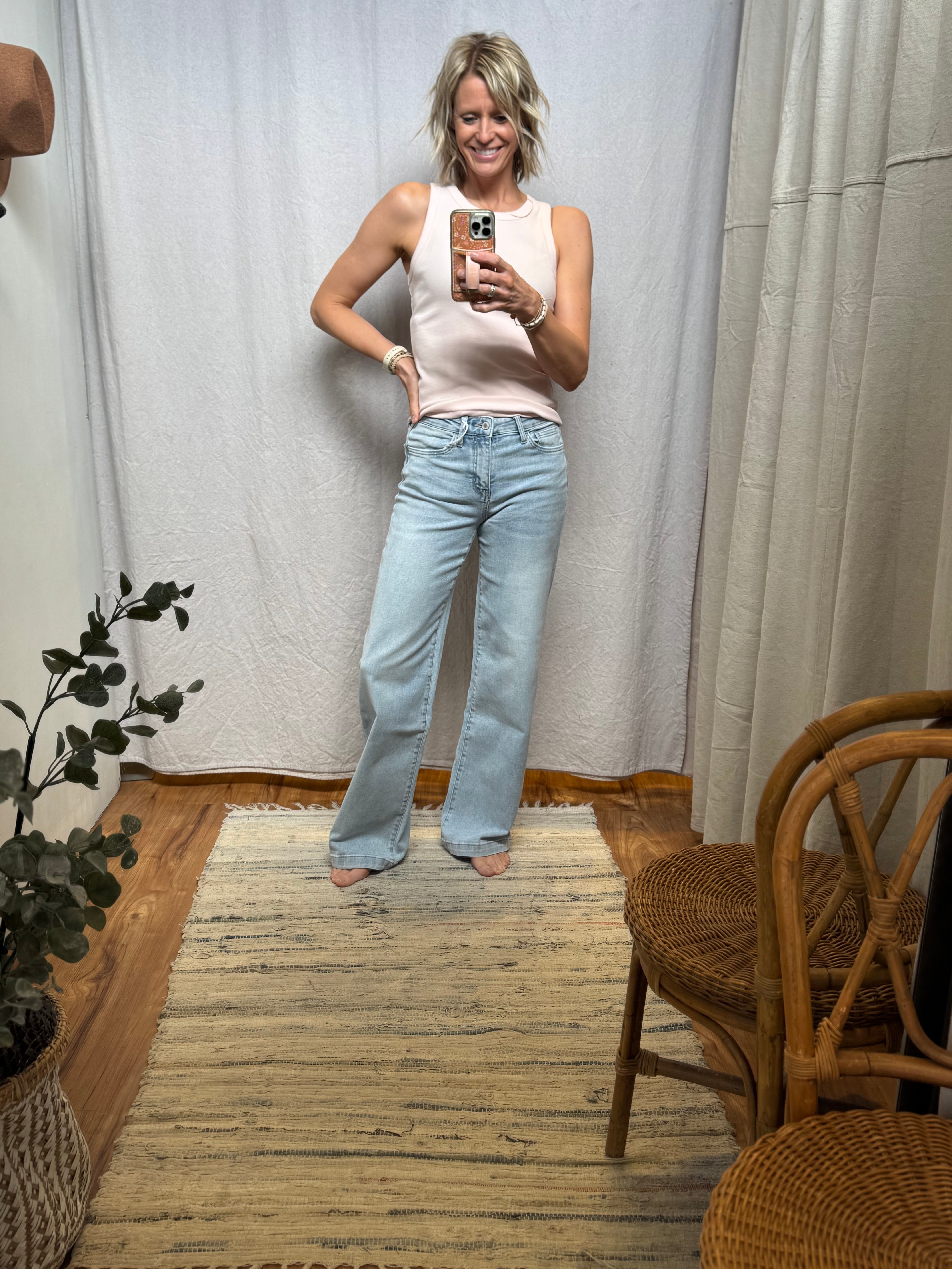 High rise full length wide leg jeans Comfort stretch denim, high rise waist, finished hem, full length, wide leg jeans.