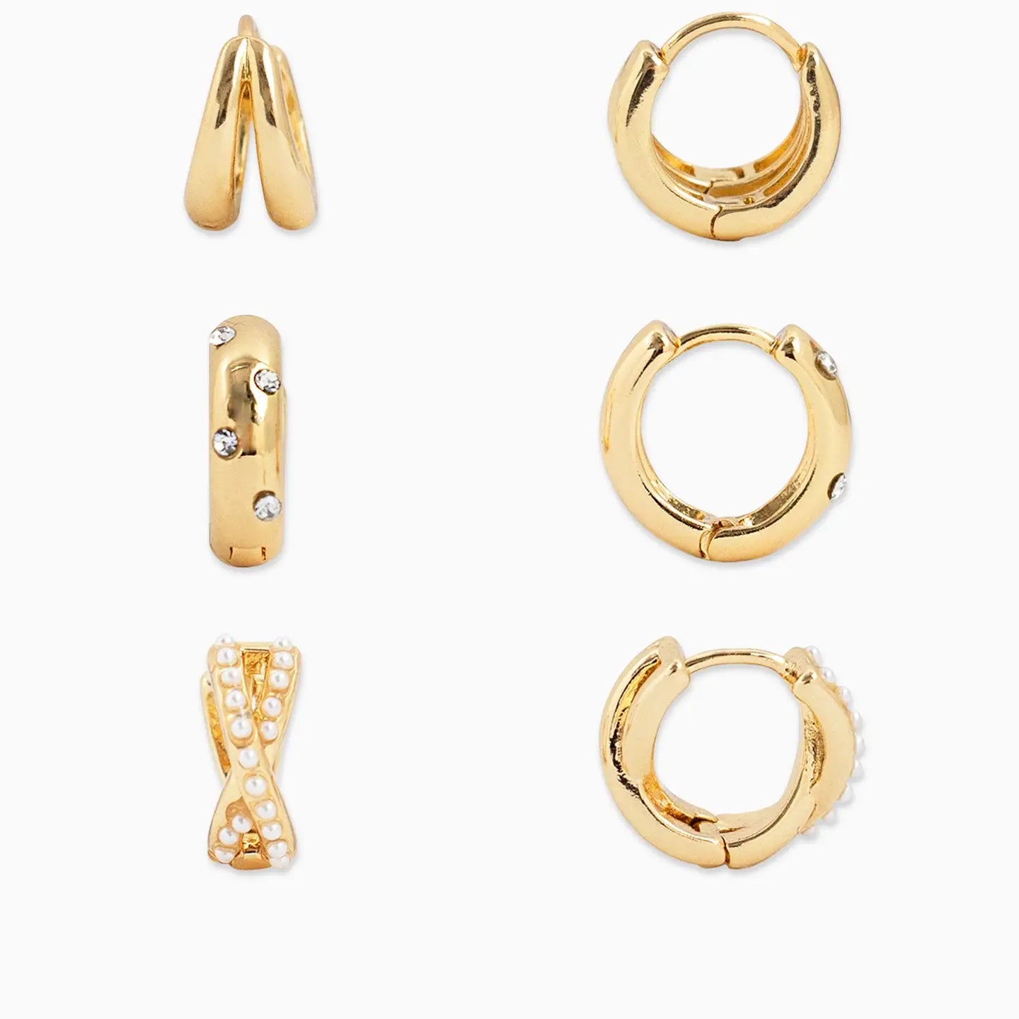 Upgrade your earring set collection with this Huggie Hoop Variety Earring Set of 3! These huggie hoops offer three huggie style hoops at the same size but a variety of hoop styles to choose from, allowing your customer's to effortlessly switch up your look.
