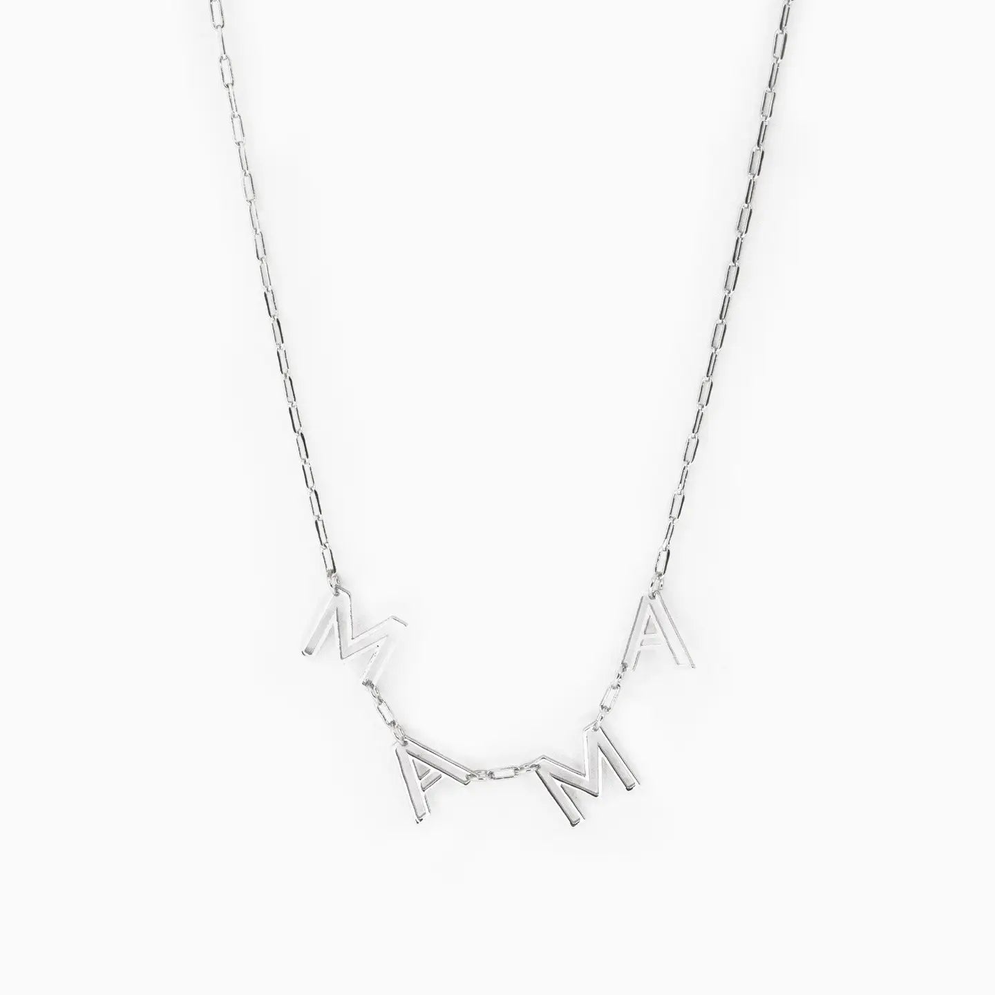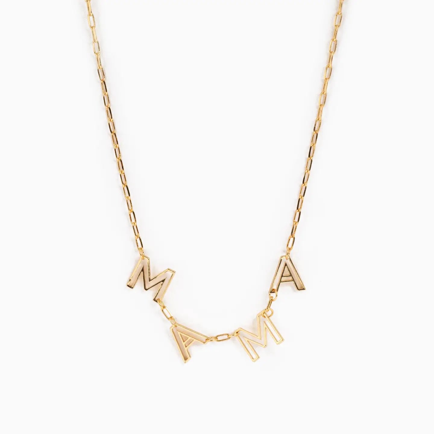 Each letter in "MAMA" is cutout and spaced apart to form a Mama letter cutout station necklace. This is a great seller for the Mother's Day season but can also be sold year-round because Mom's should be celebrated every day.