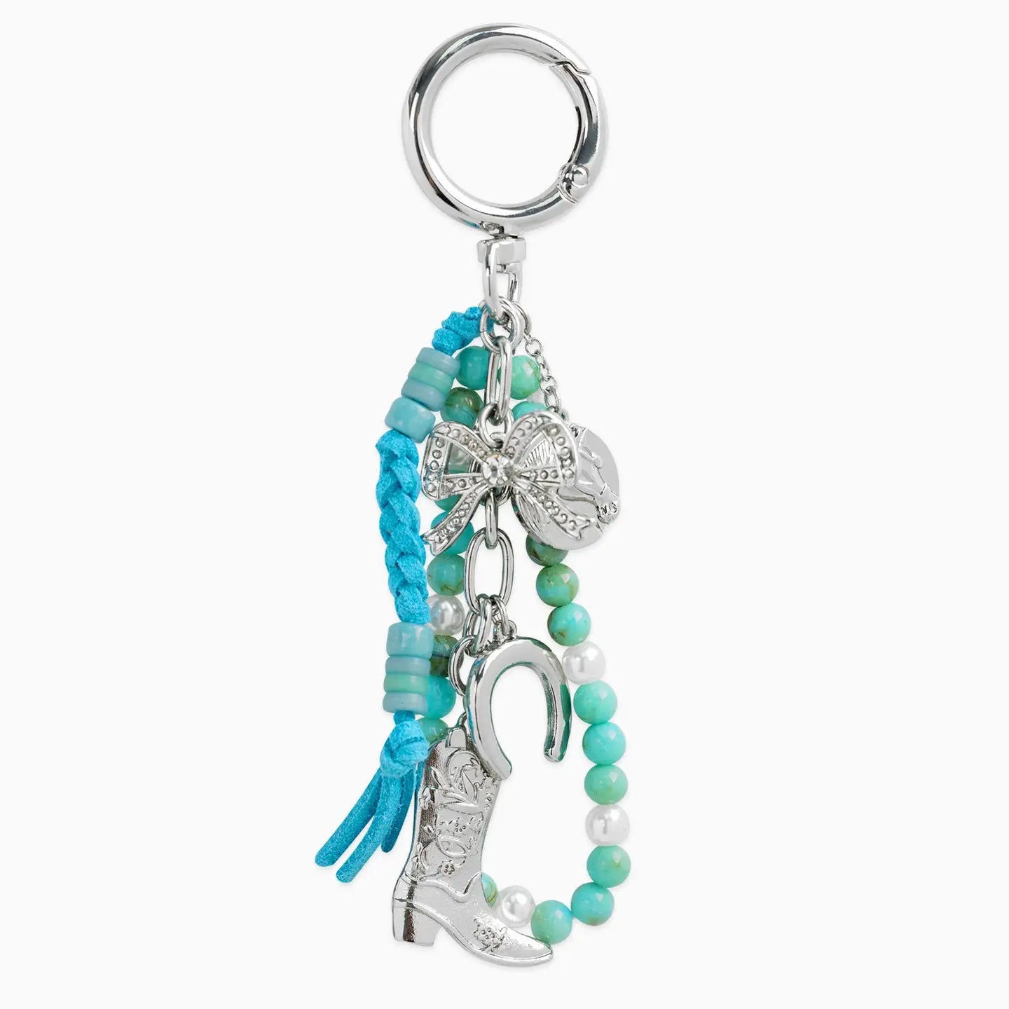 A Western-inspired cluster featuring a detailed cowboy boot, horseshoe, coin, and crystal-tipped bow charm. Strands of smooth beads and pearls mix with braided leather, adding texture and movement to this trail-ready accent.