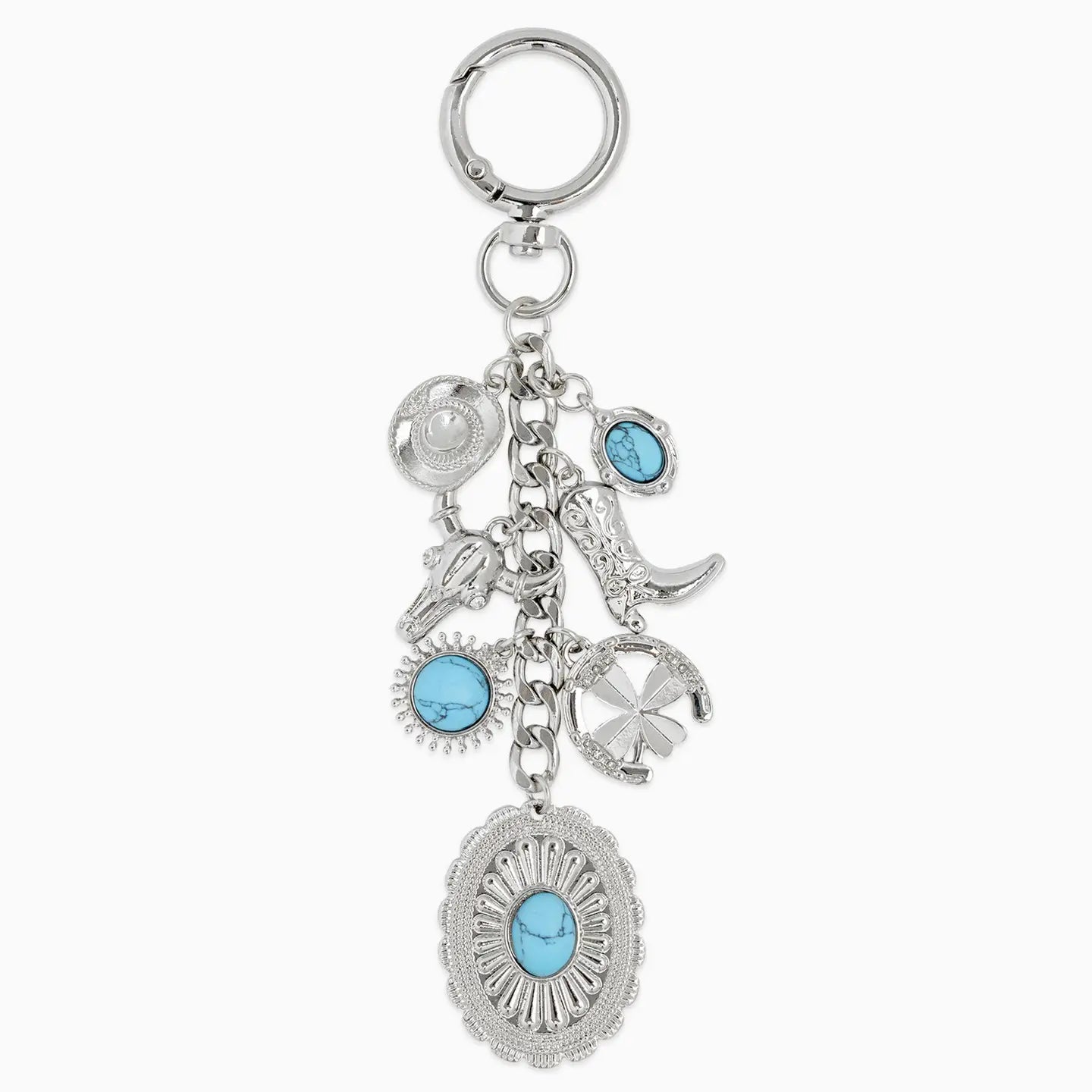 A statement charm rich with Western detail—cowboy boot, horseshoe, steer head, and concho charms, accented with turquoise-set medallions. Finished with a bold, oversized turquoise centerpiece for a striking frontier look.