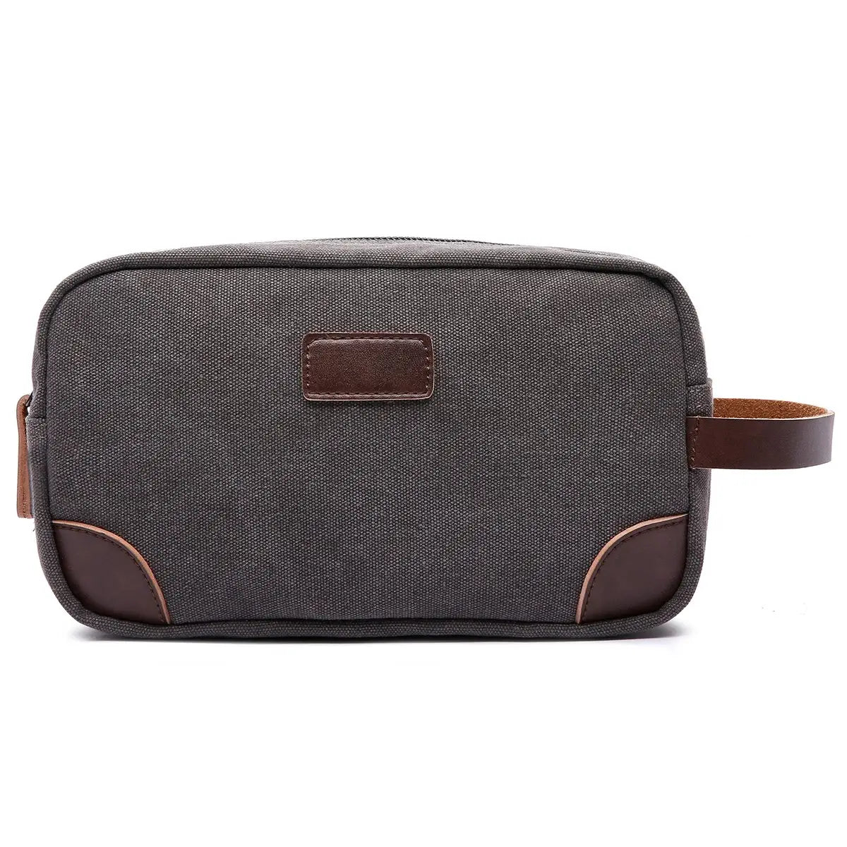 Perfect for vacations, business trips, and other travels, this durable men's canvas and faux leather toiletry bag will keep all his necessities handy. This bag features a water-resistant canvas, a faux leather strap handle and detailing, along with a wide-zipper opening.