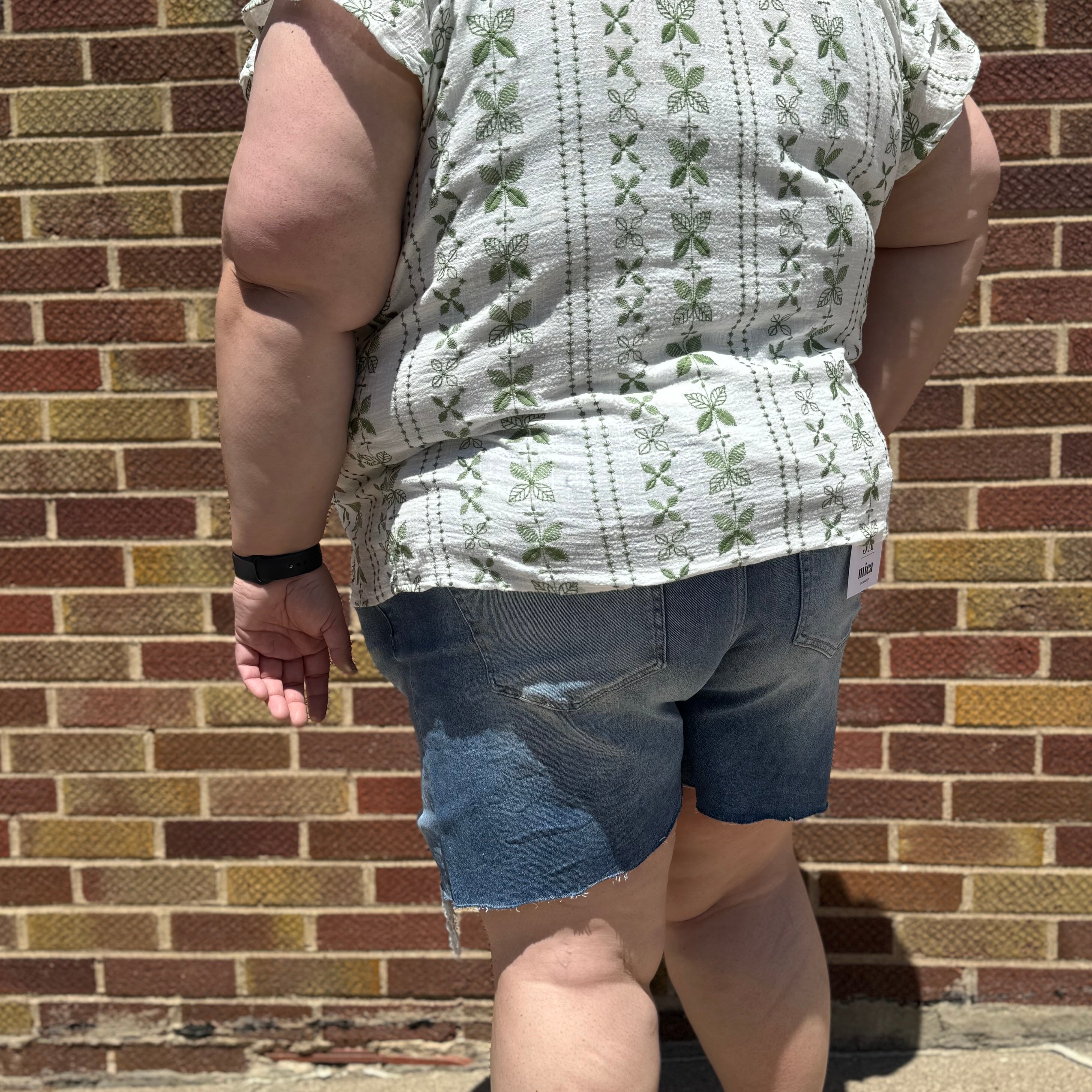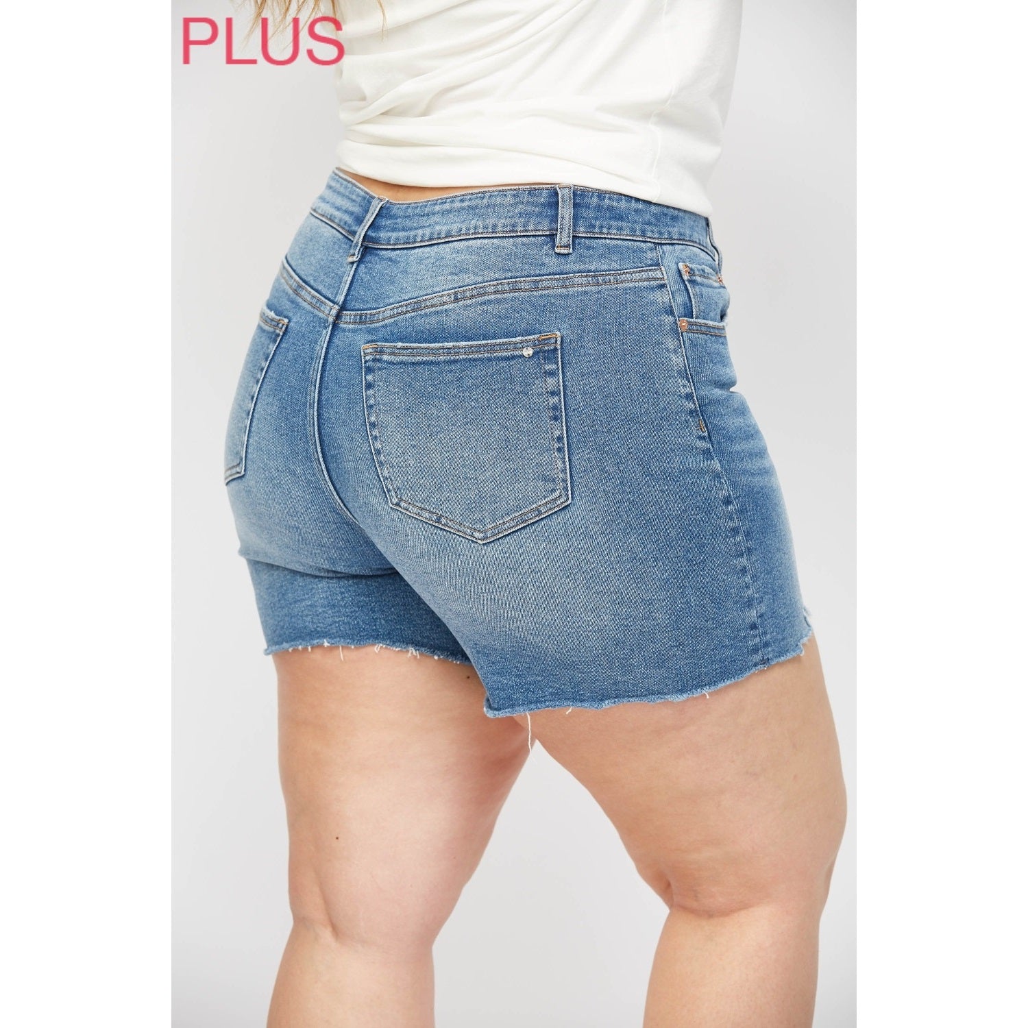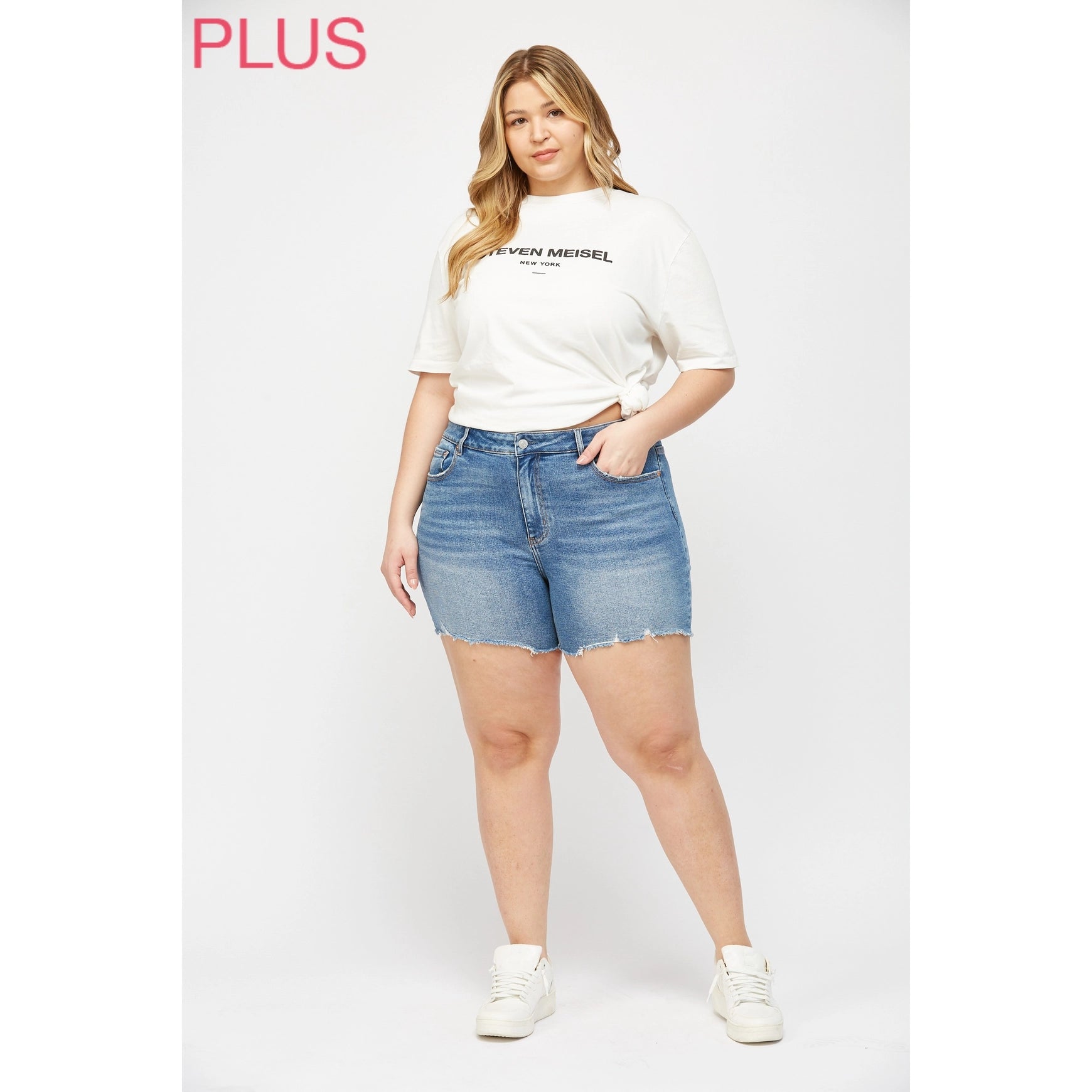 Elevate your style game with Mica Plus High Rise Cut Off Shorts. Featuring a raw hem and some distressed details, these shorts are perfect for a fun, edgy look.