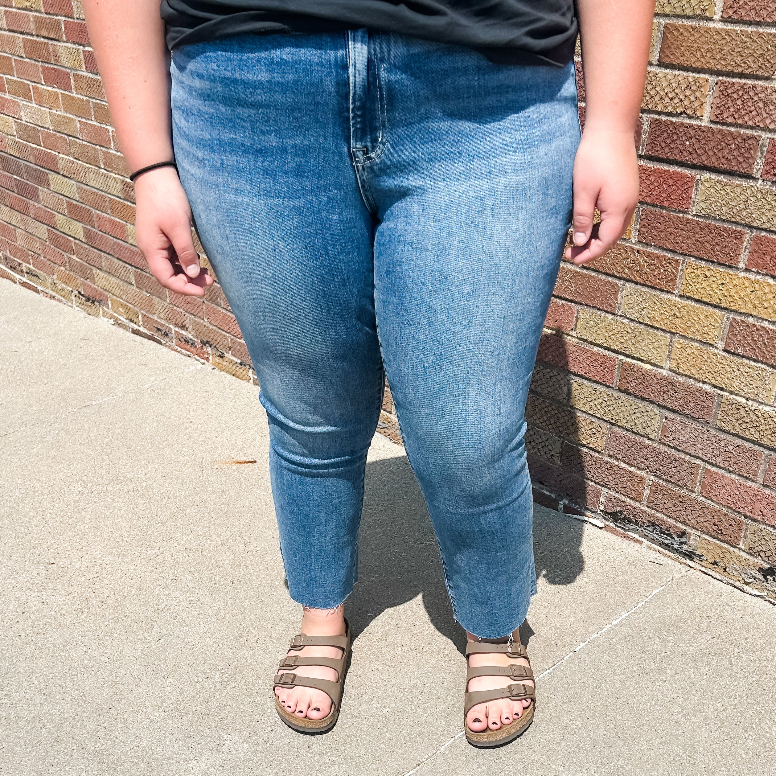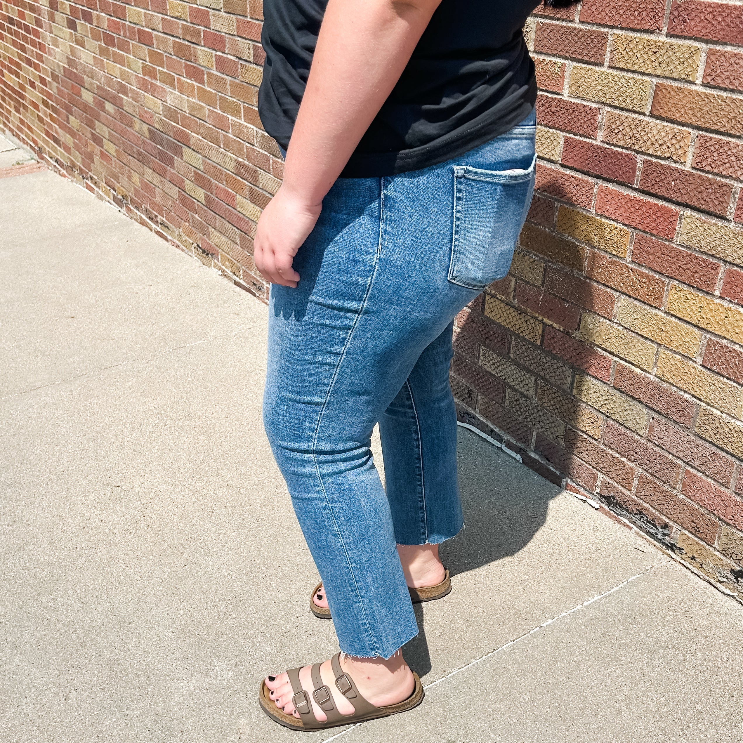 PLUS SIZE MID RISE CROP SLIM STRAIGHT JEANS COMFORT STRETCH DENIM, MID RISE WAIST, CLEAN CUT RAW HEM, CROPPED LENGTH, SLIM STRAIGHT JEANS F. RISE: 11 3/4" / INSEAM: 27 1/2" / LEG OPENING: 16"