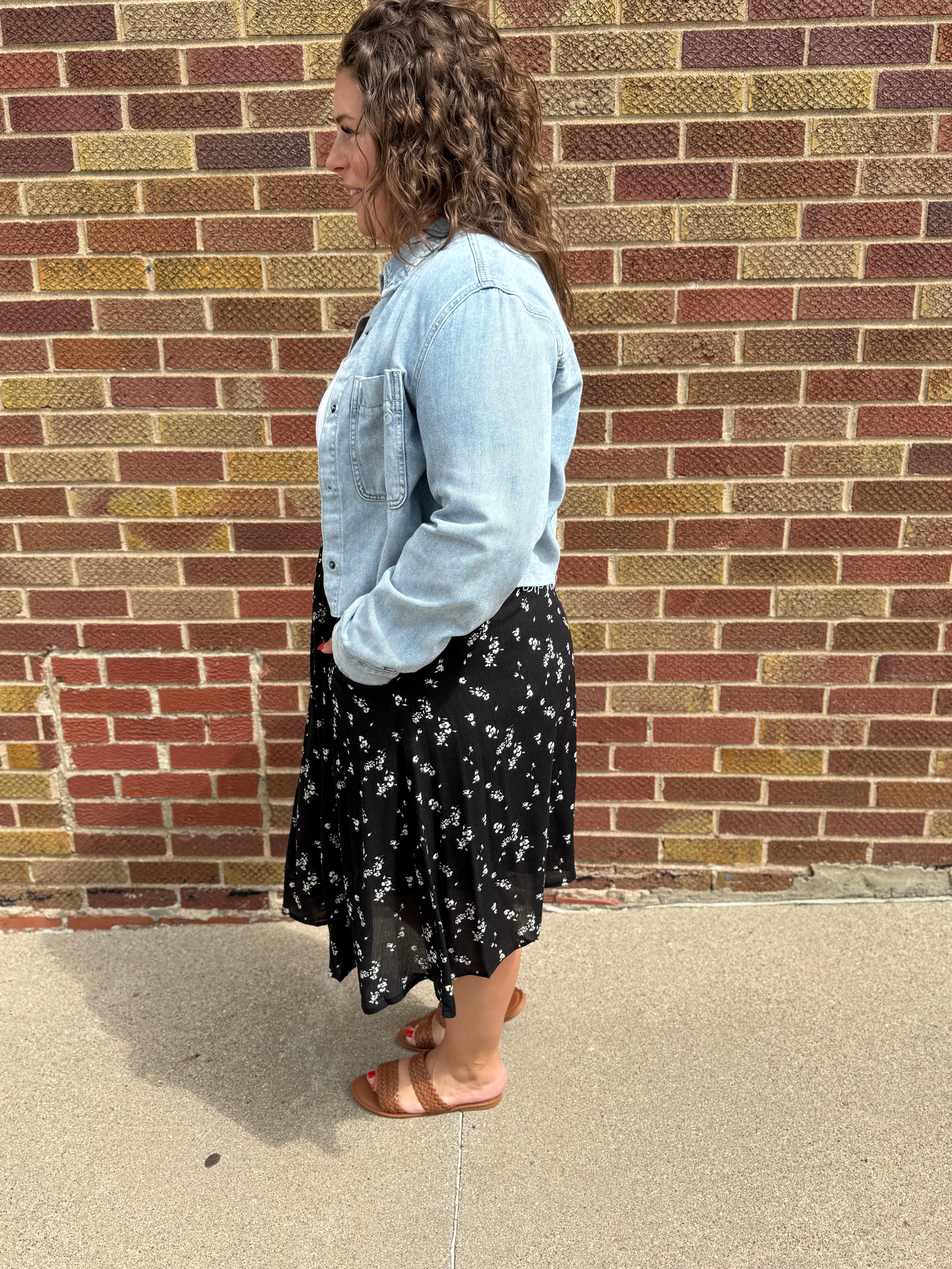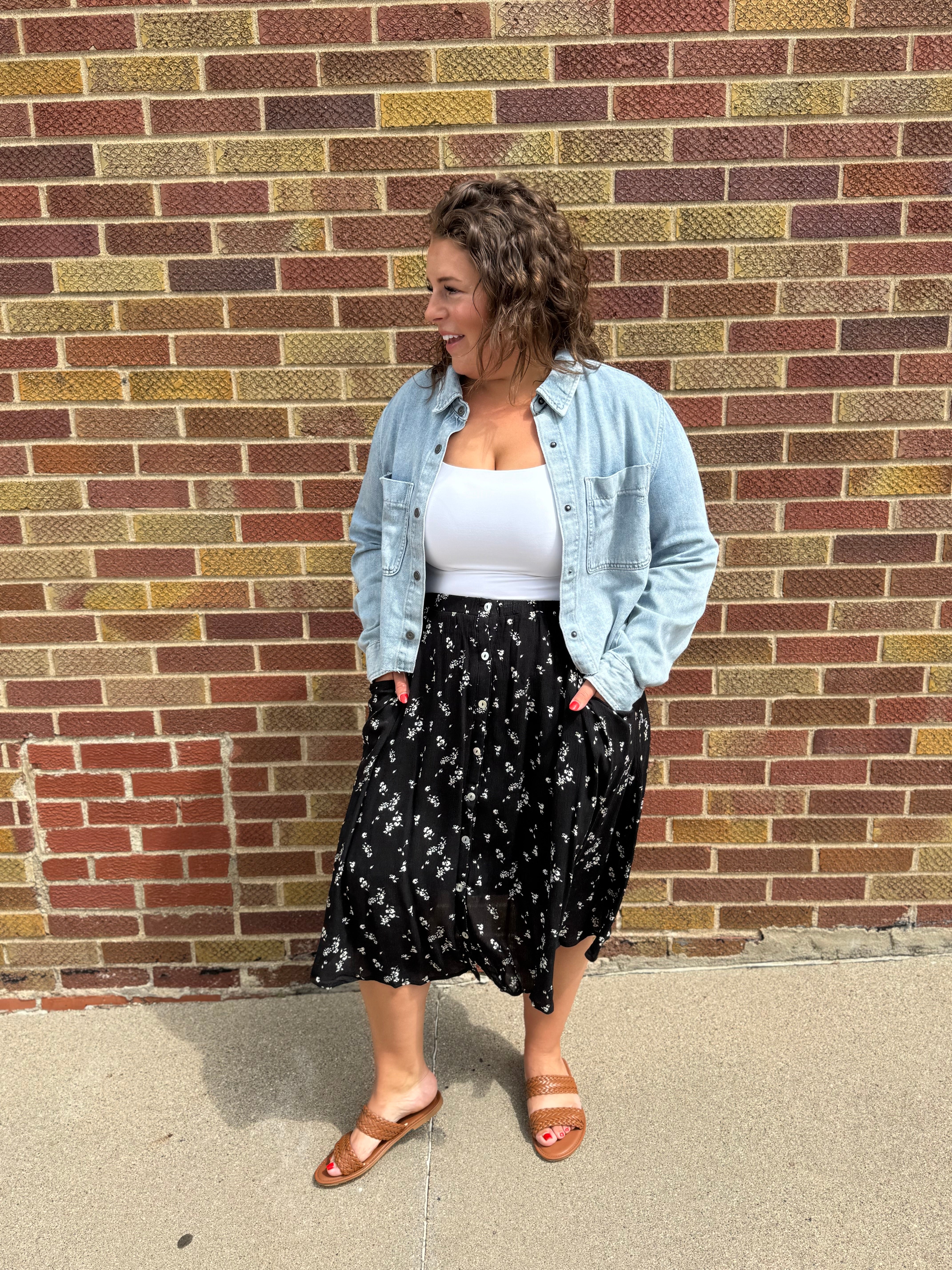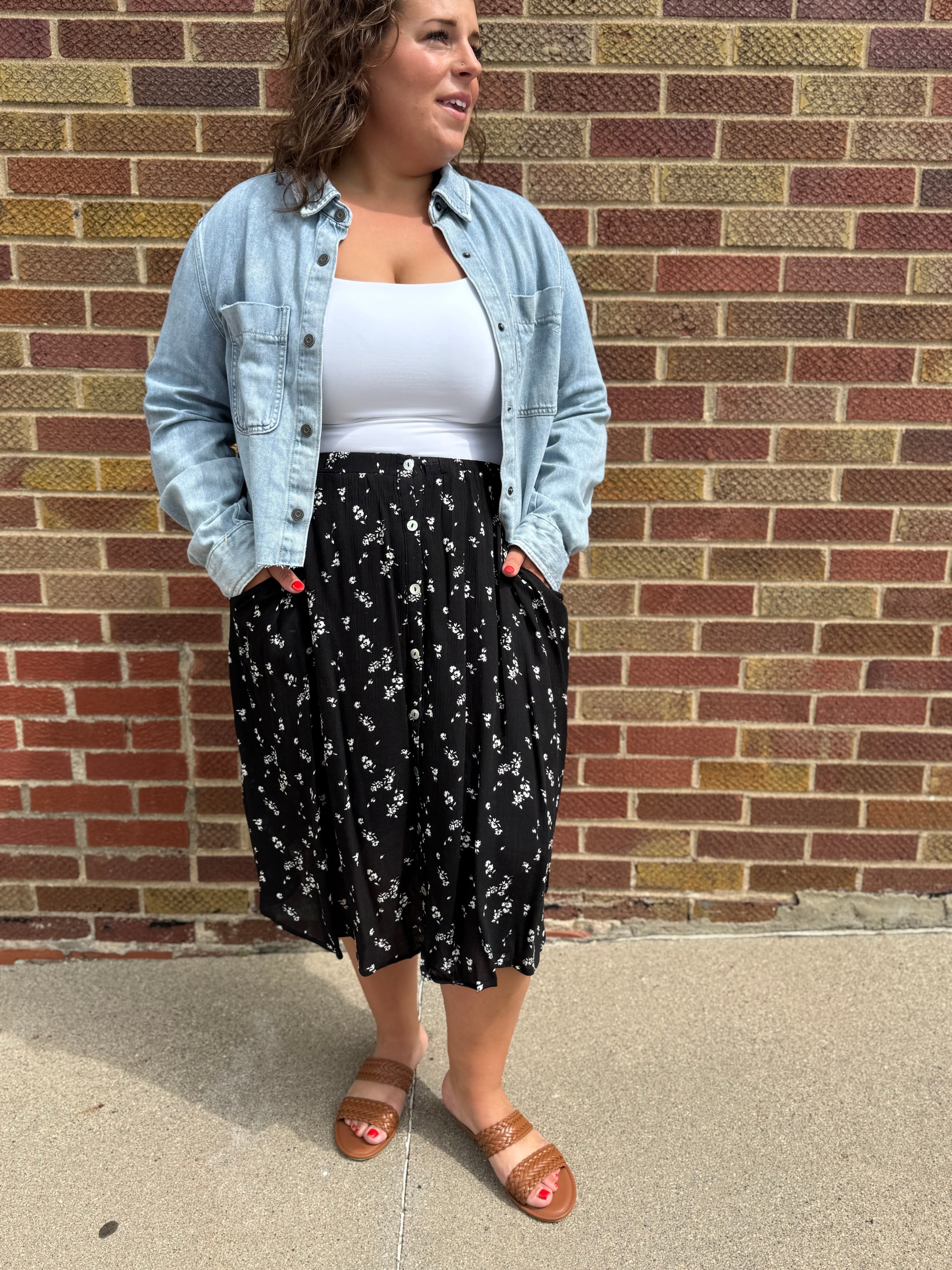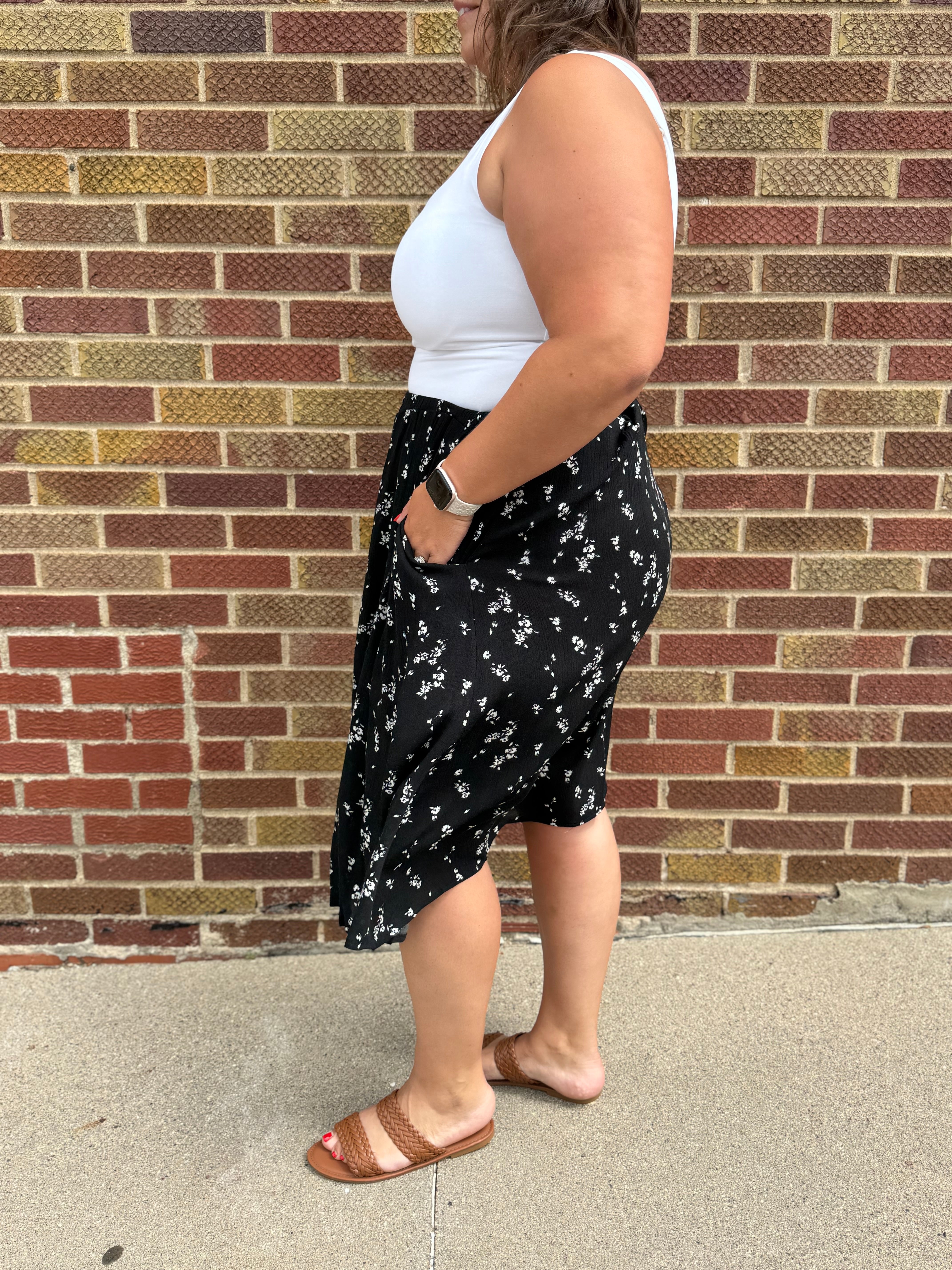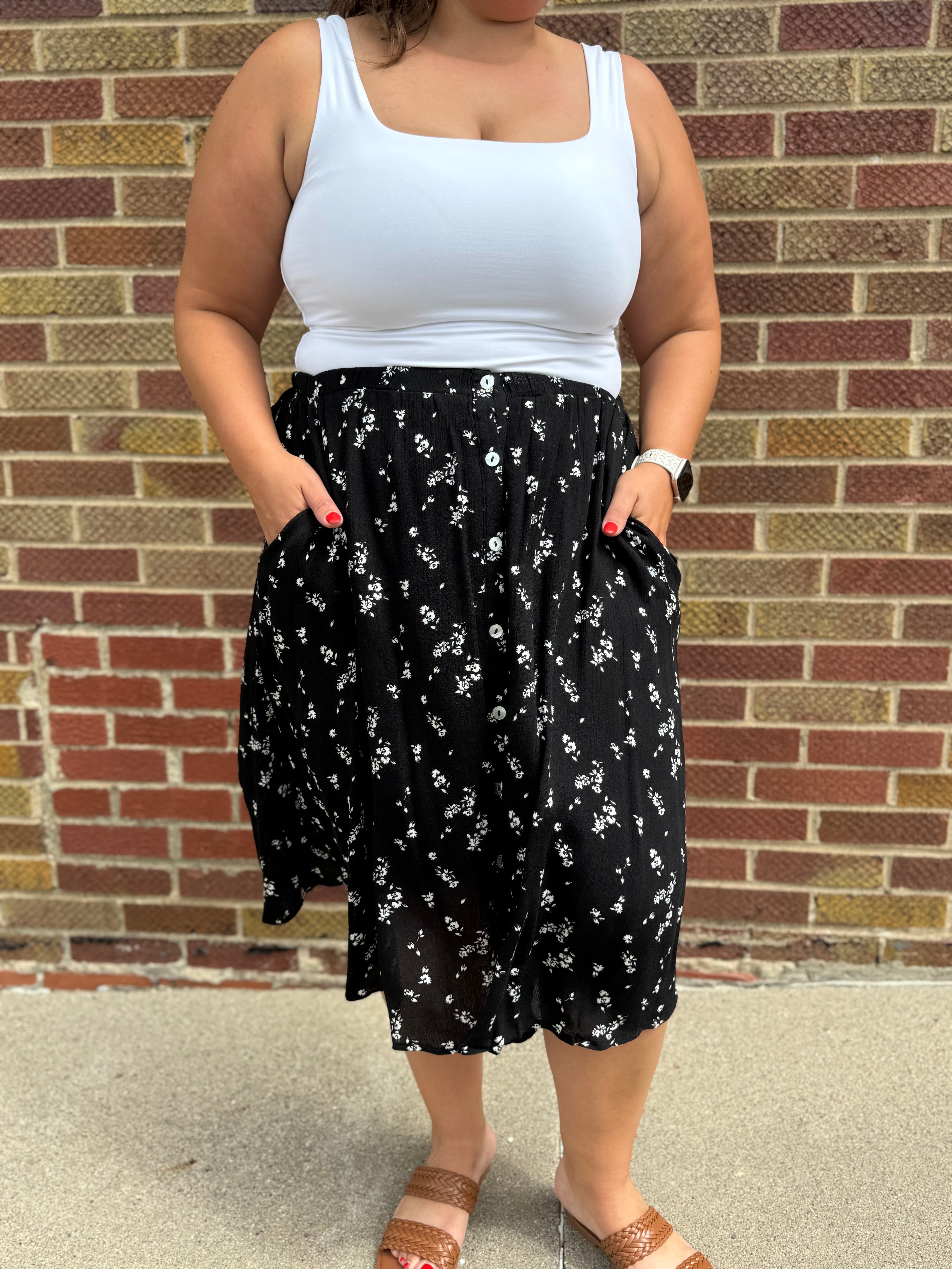 Its woven fabric offers a comfortable fit that flatters your curves, while the midi length adds a touch of elegance perfect for any occasion. Elevate your wardrobe with a versatile skirt that blends comfort, style, and convenience.