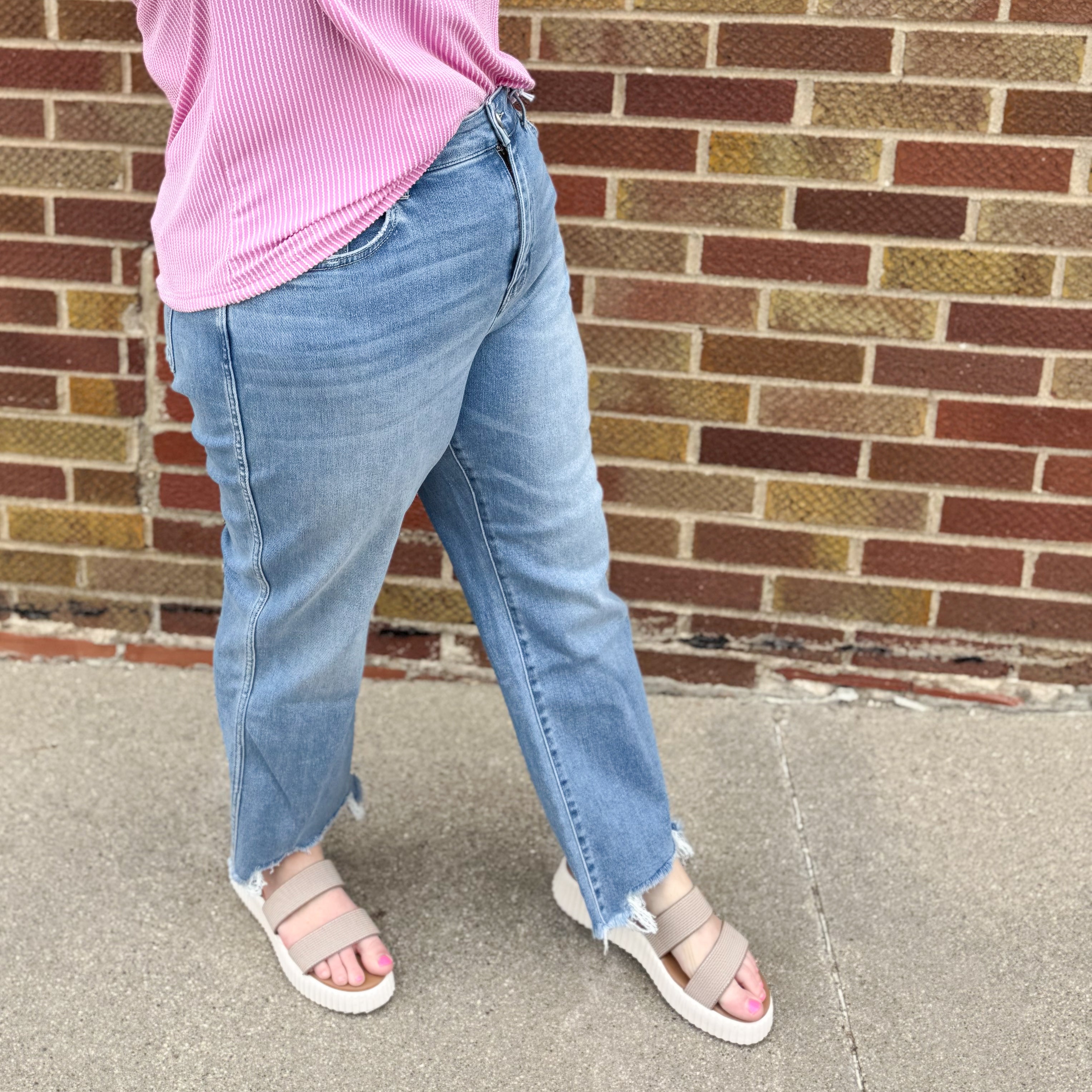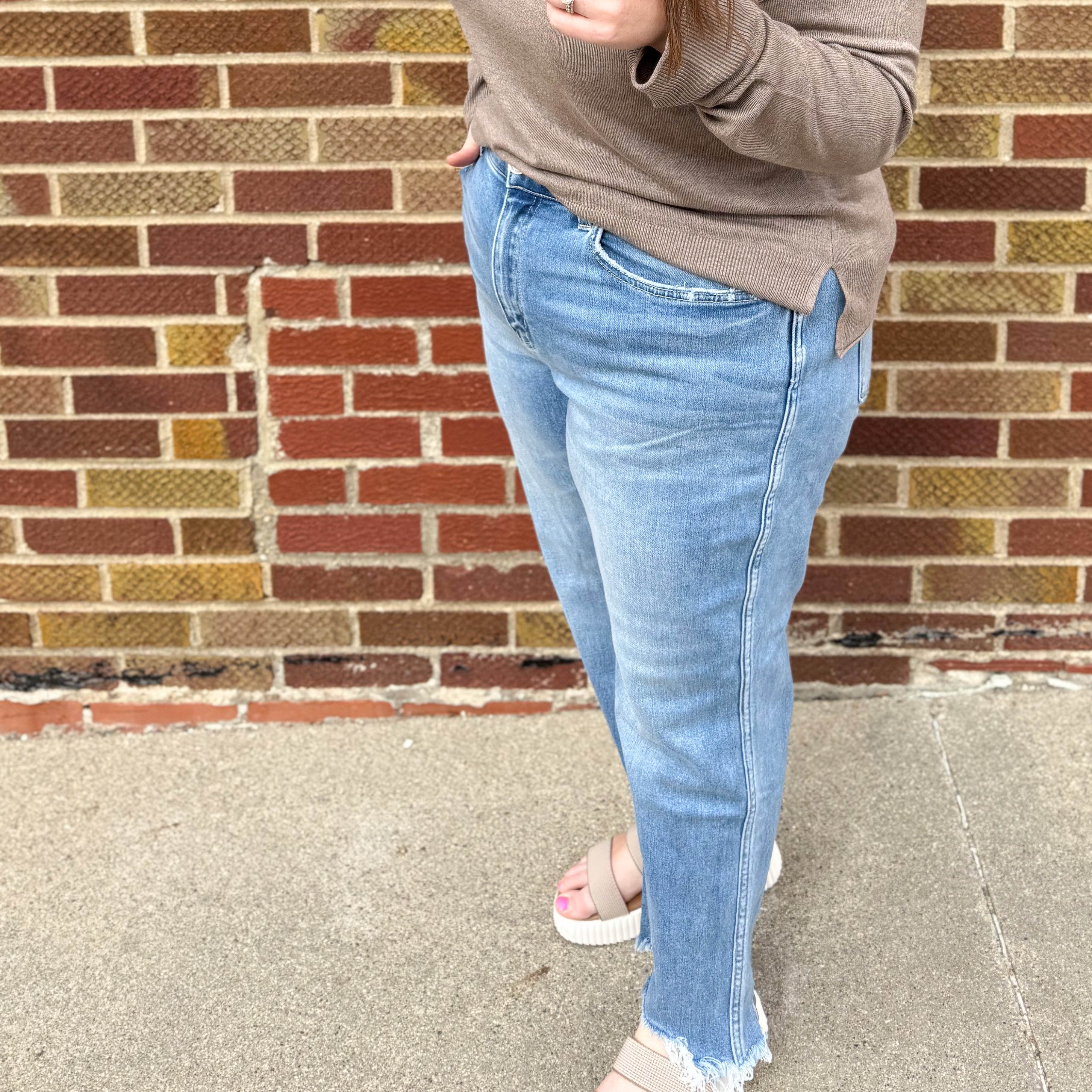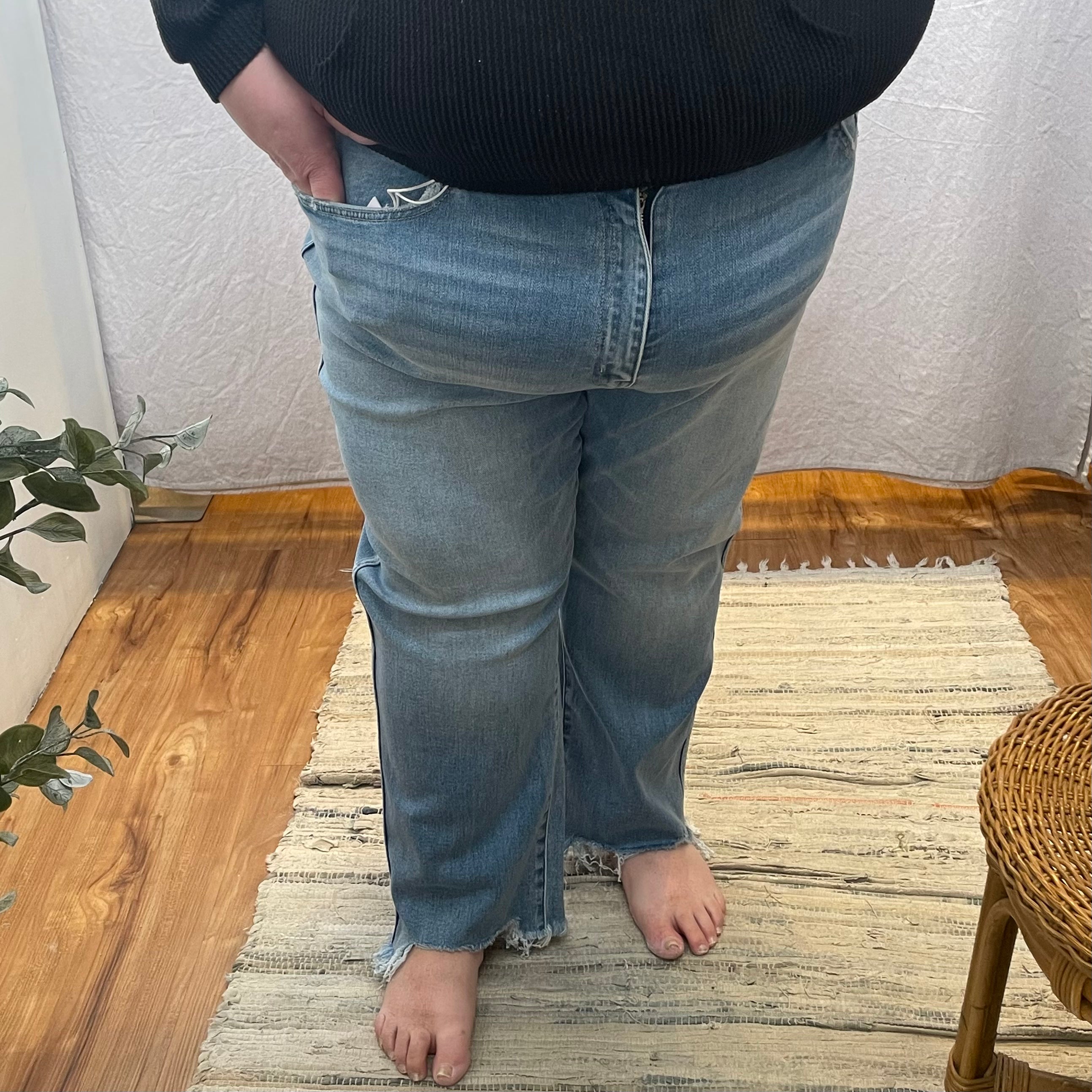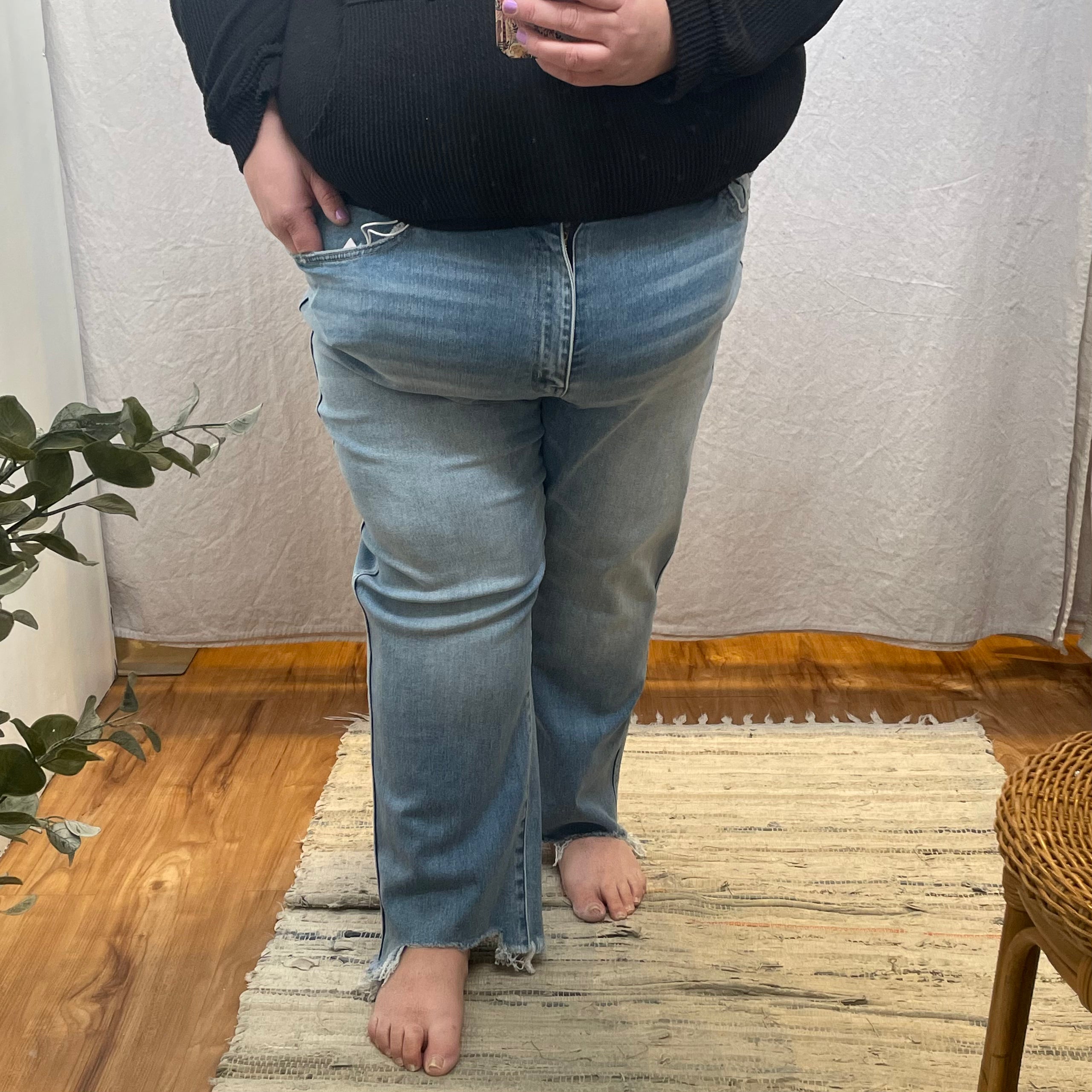 Plus size high rise regular straight jeans Comfort stretch denim, high rise waist, distressed detail, cropped length, regular straight jeans.