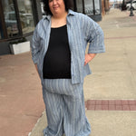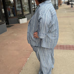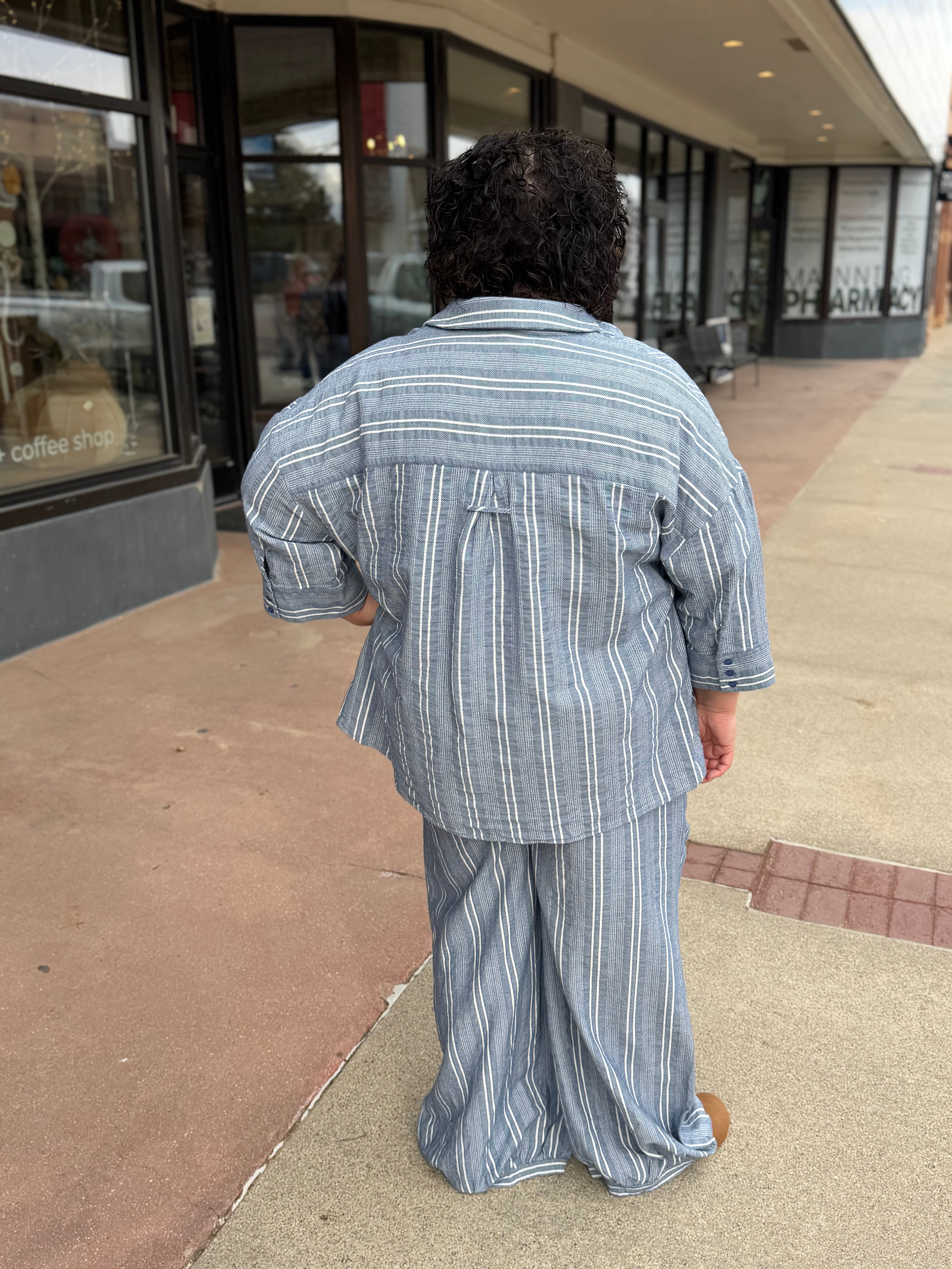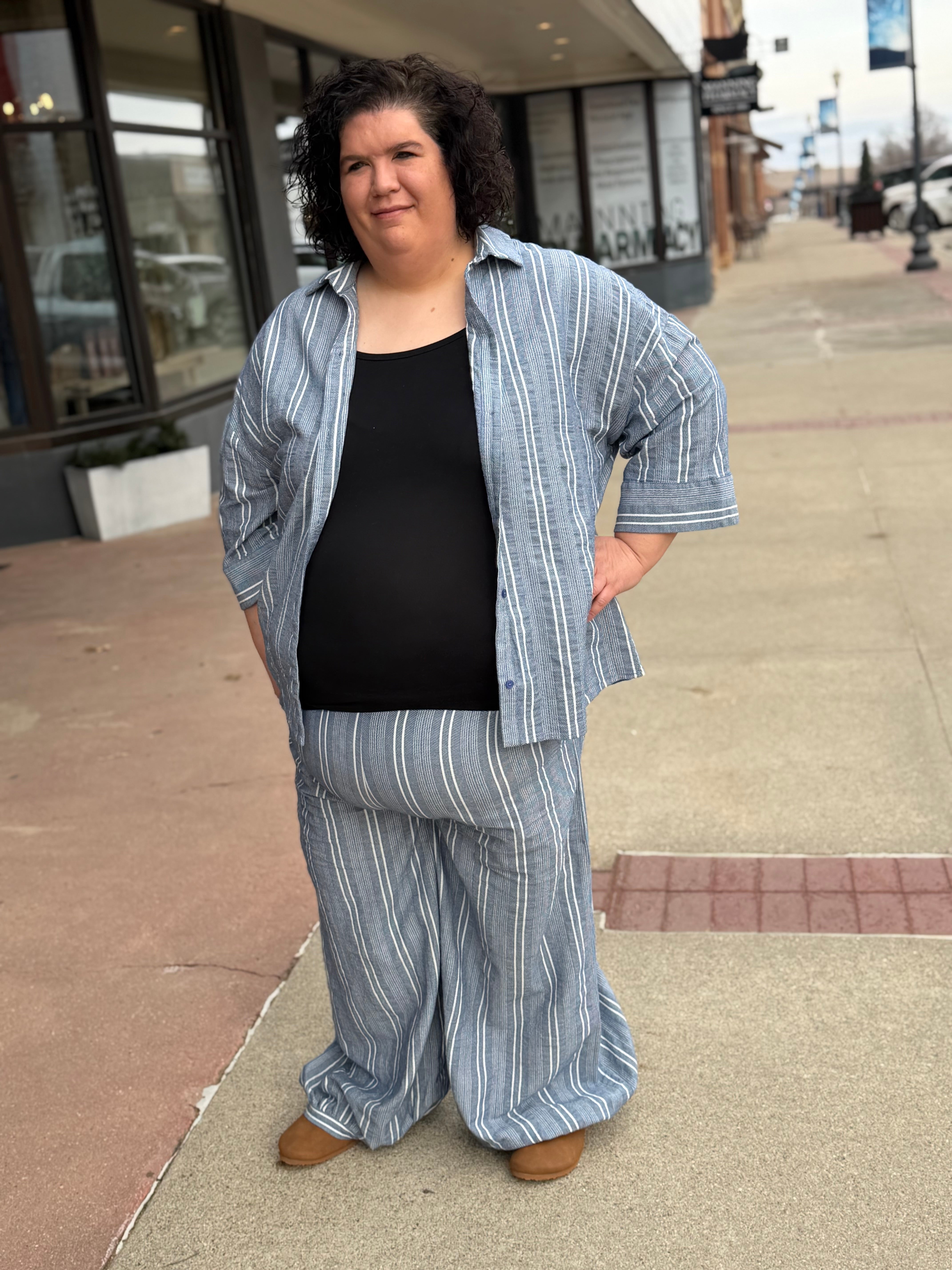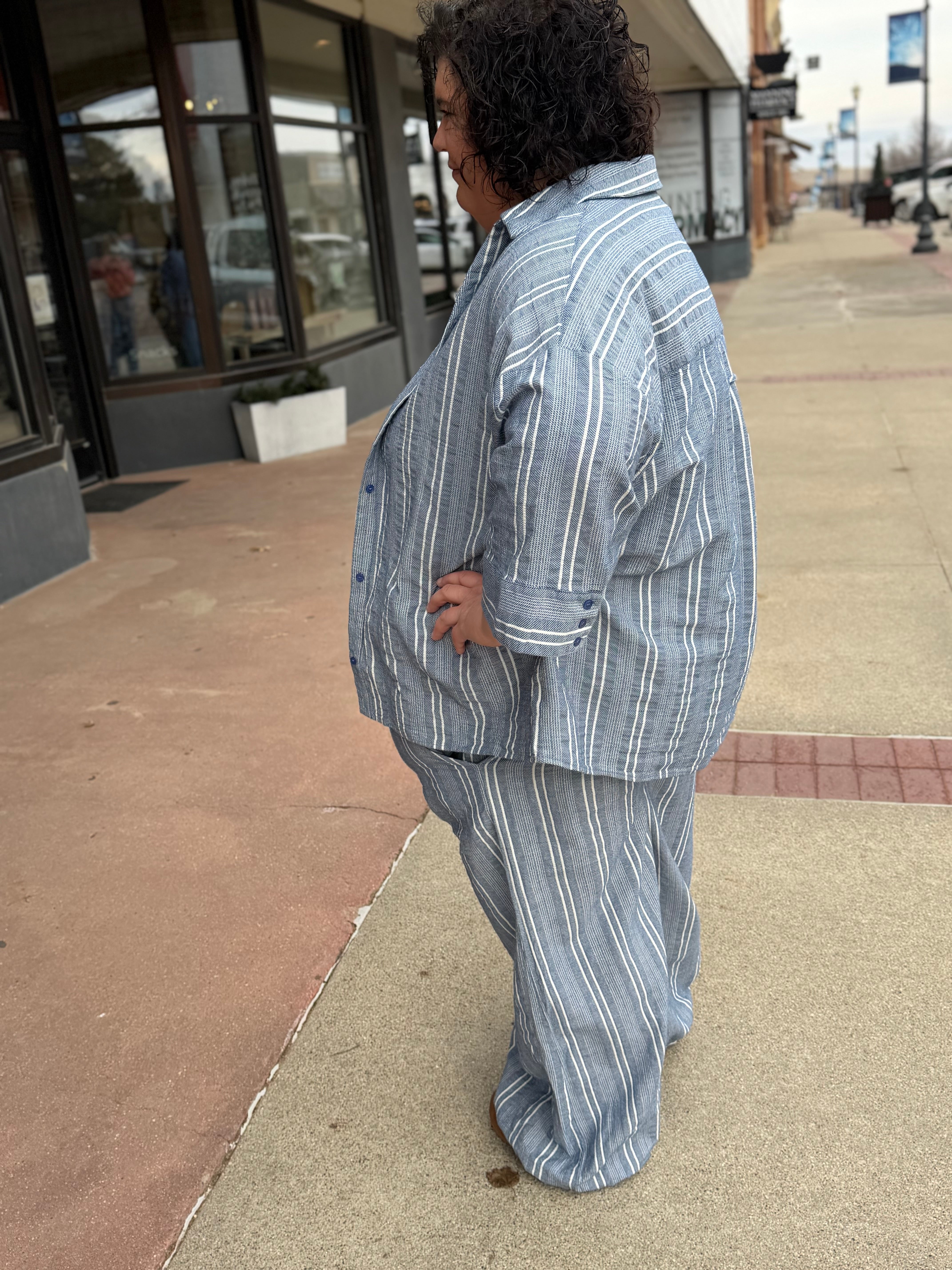 Discover the perfect balance of comfort and style with these white and blue striped pants. The relaxed, flowing fit moves with you throughout your day. These pants have an elastic waistband and pockets.