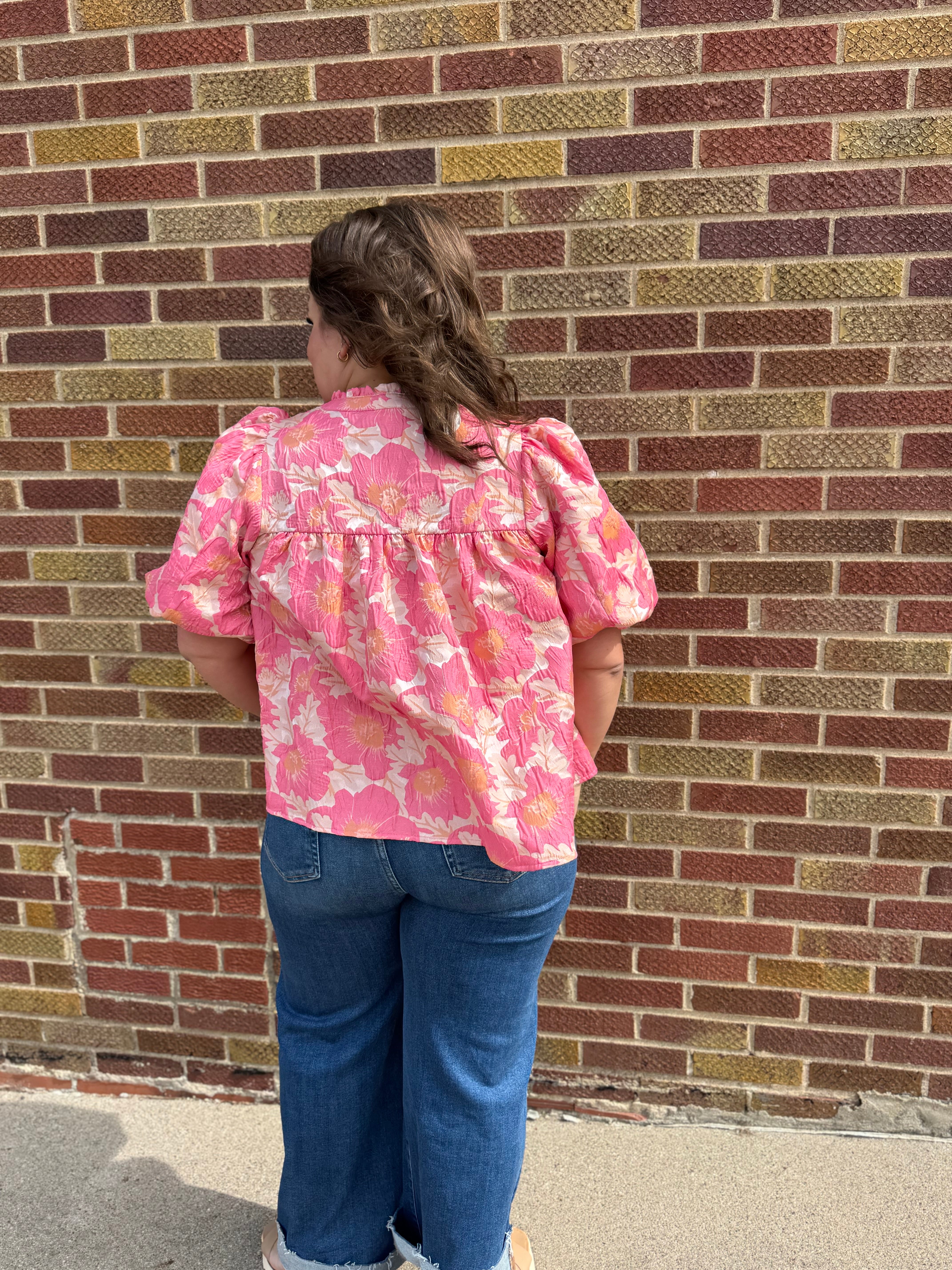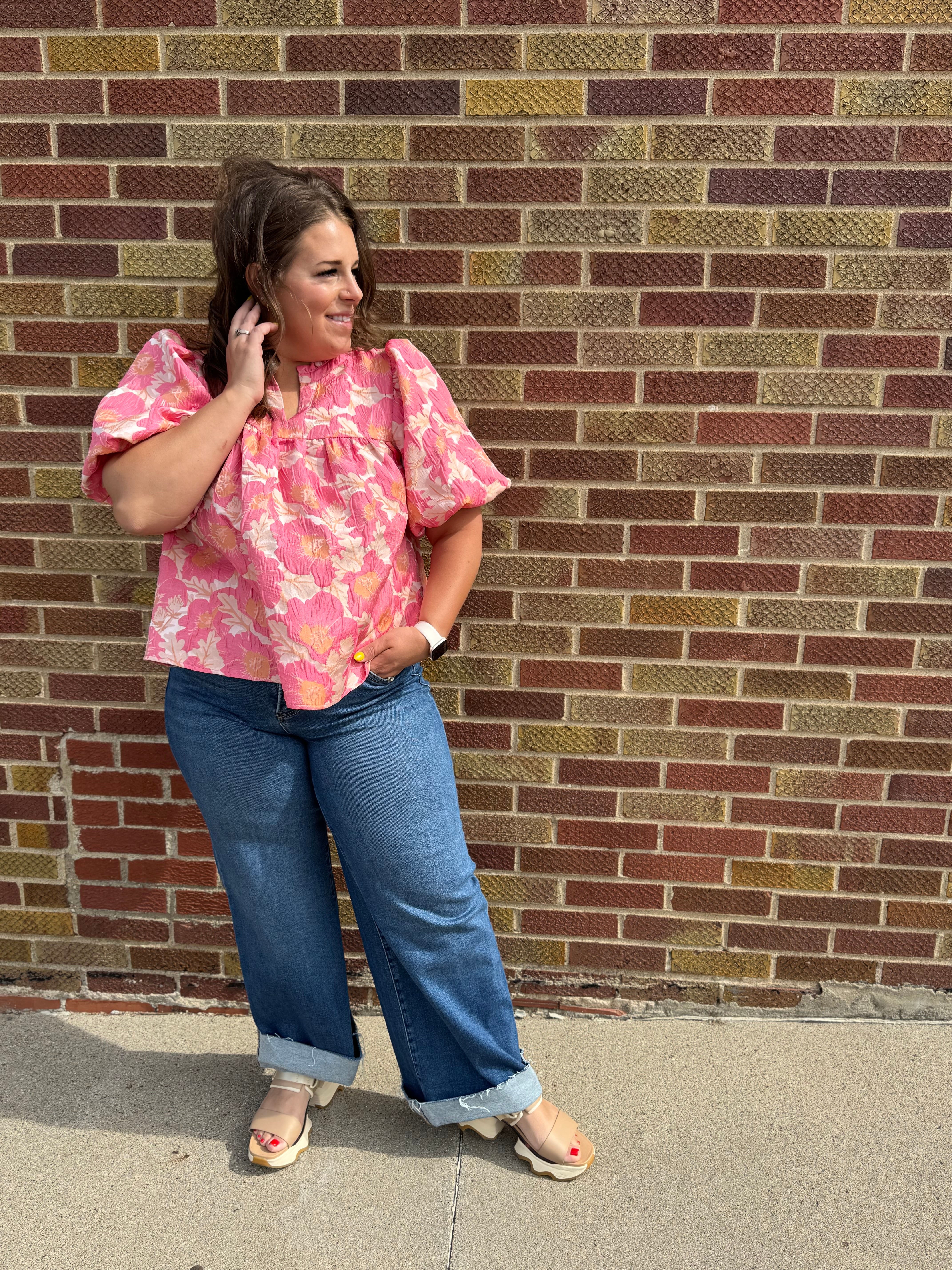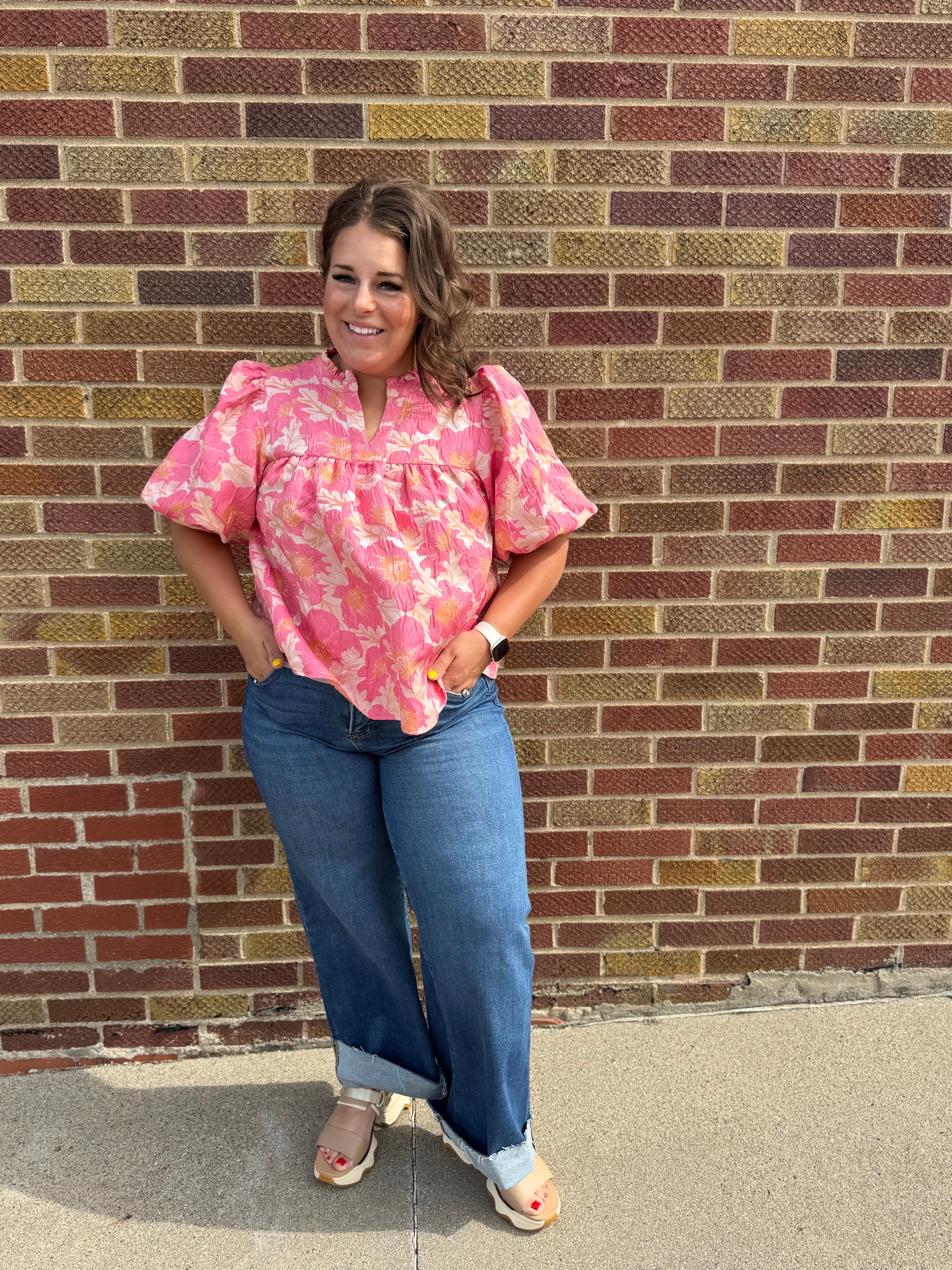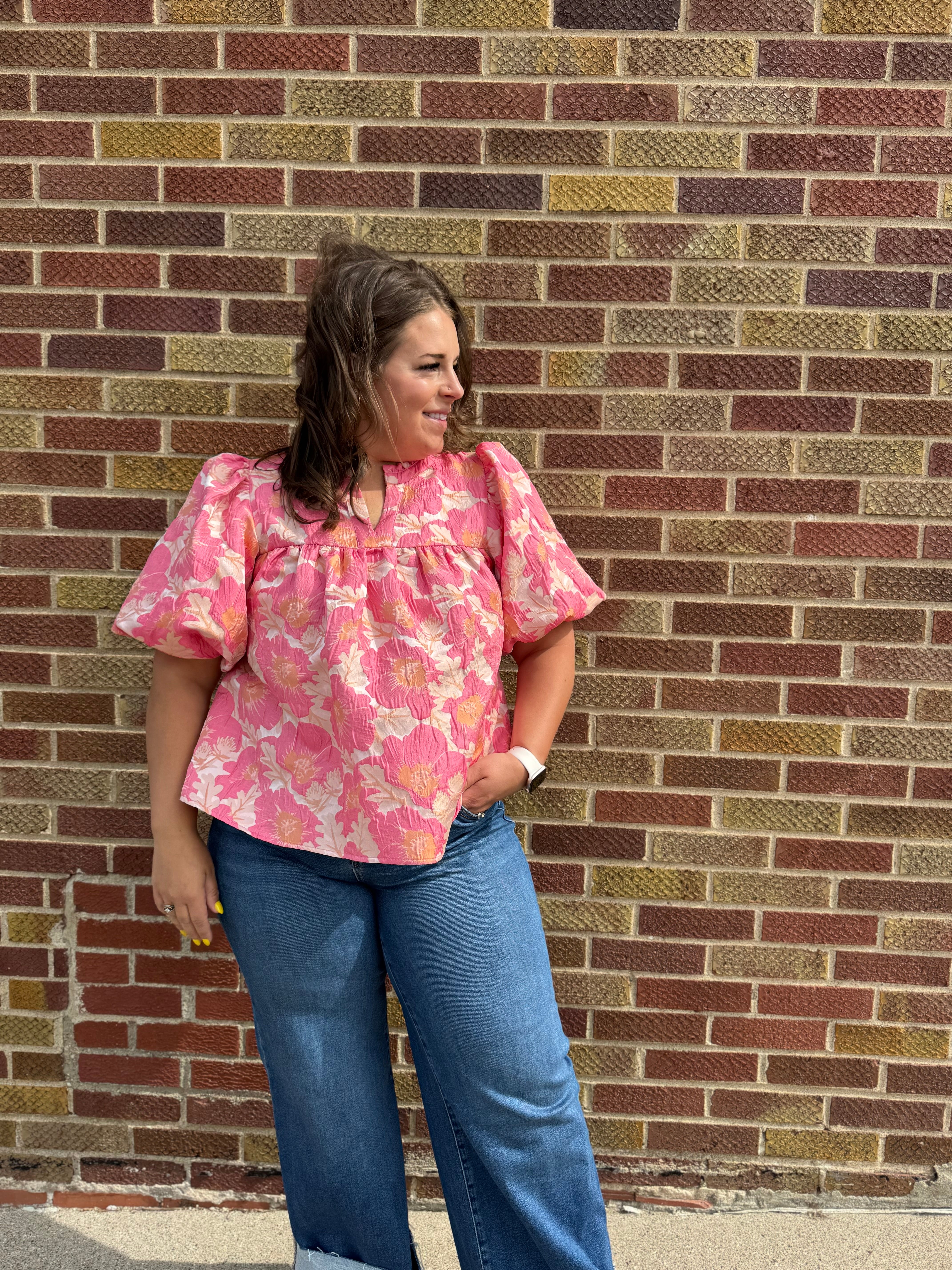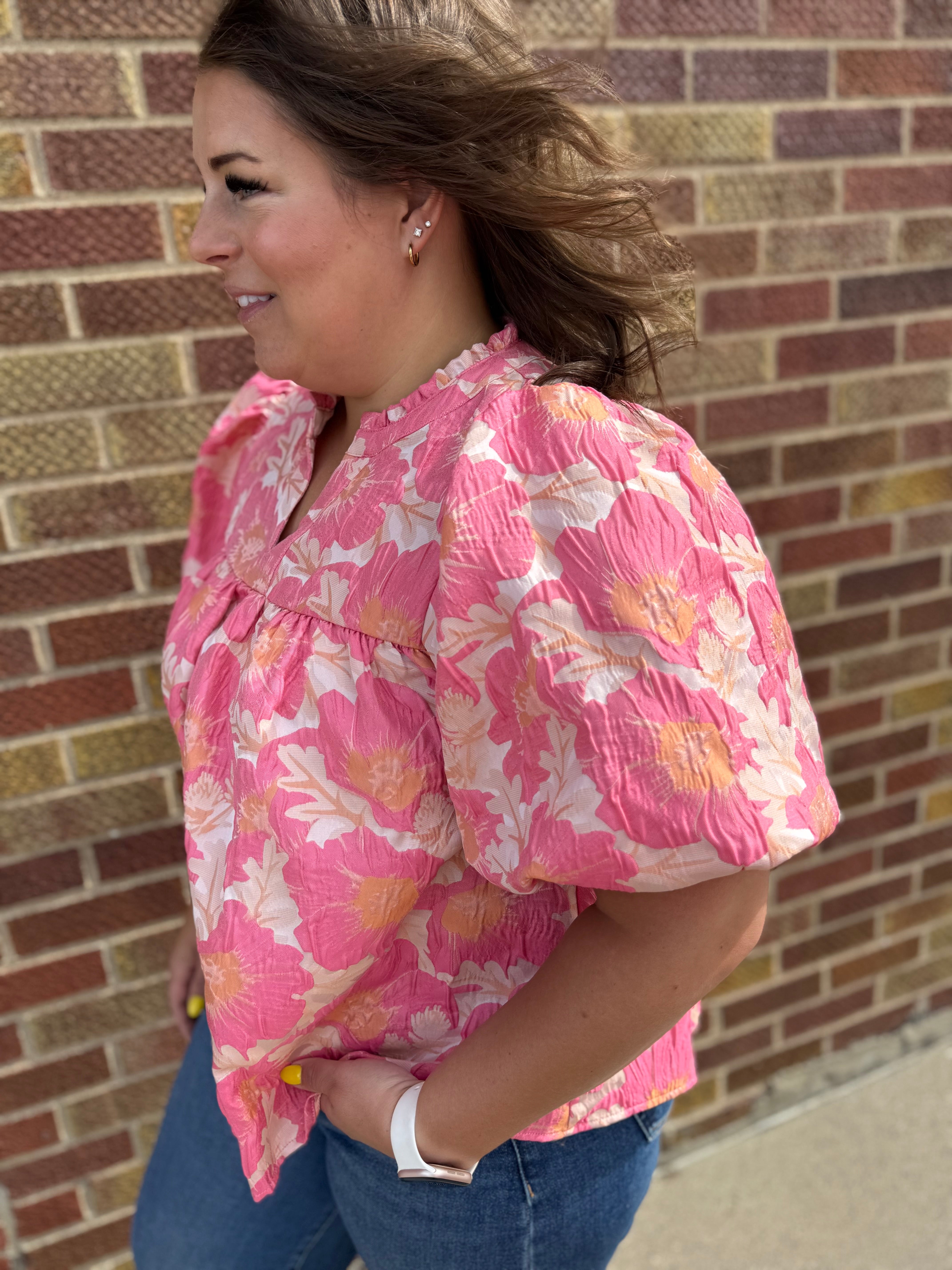 Plus Floral Satin Babydoll Top w/Bubble Sleeve