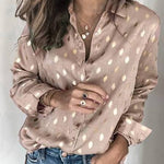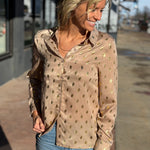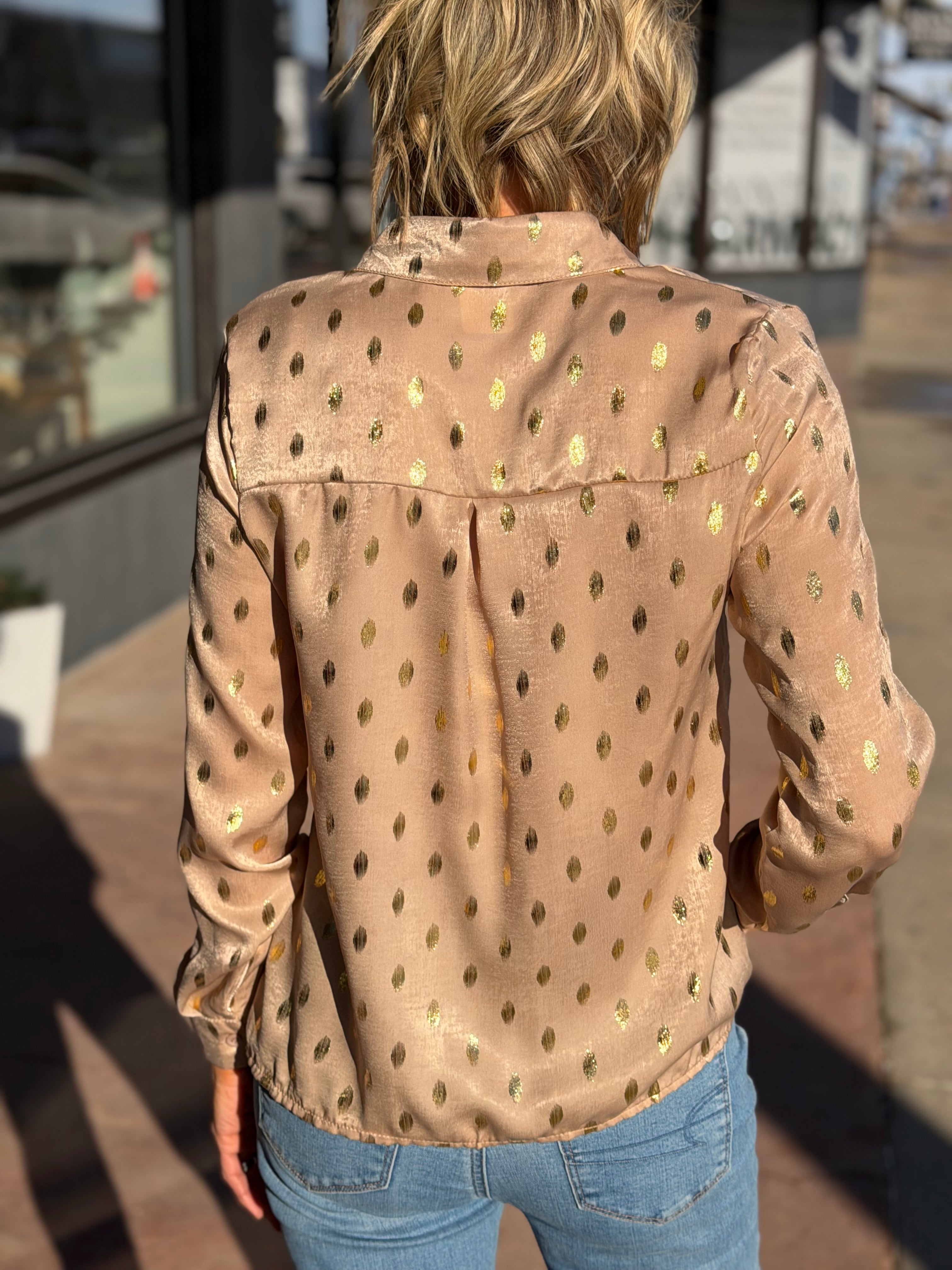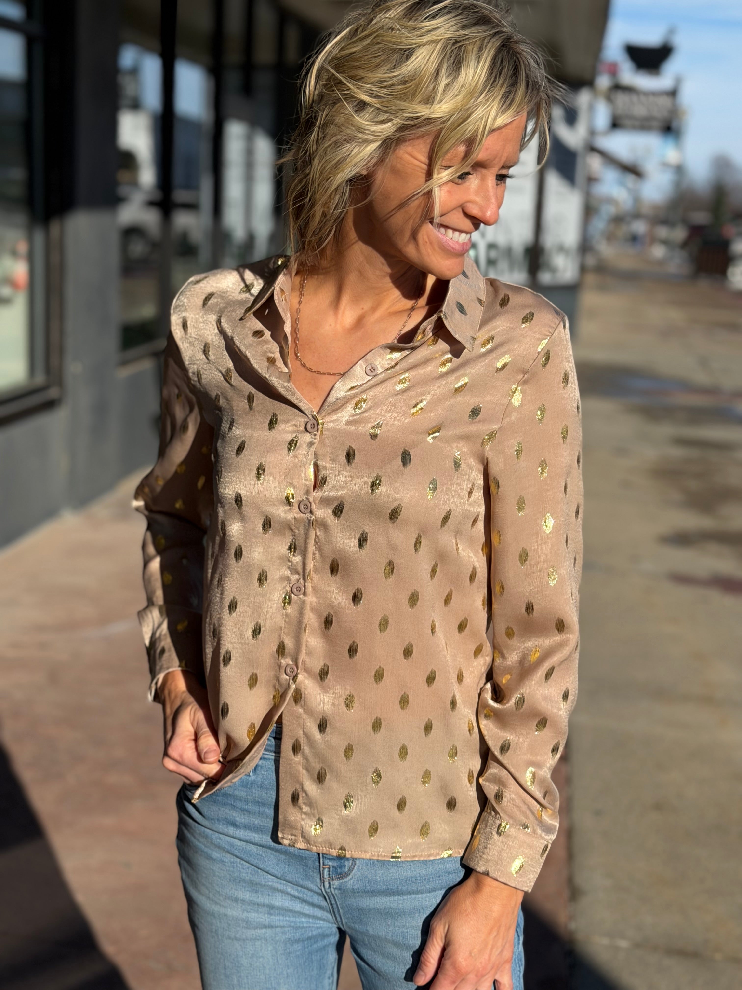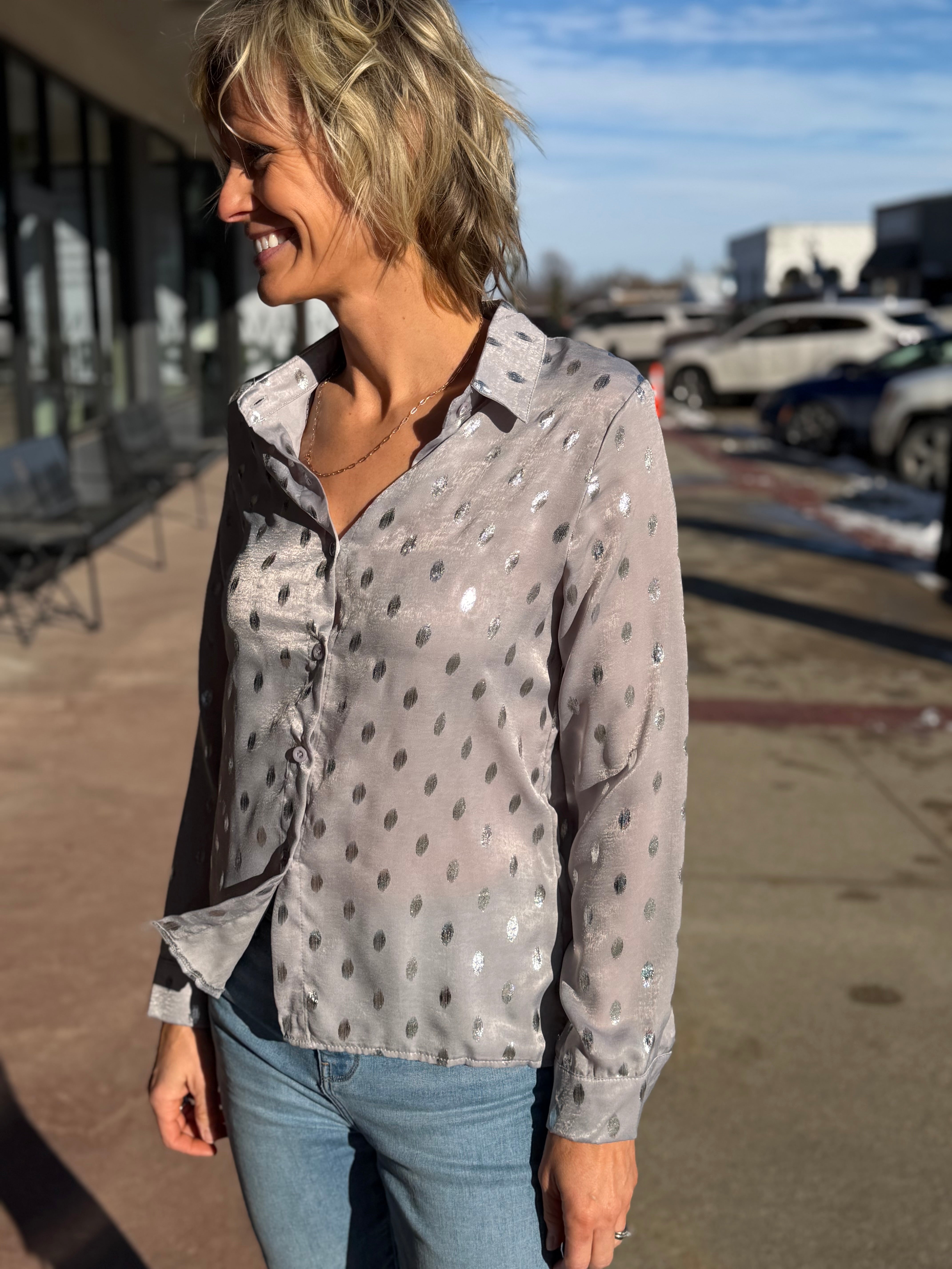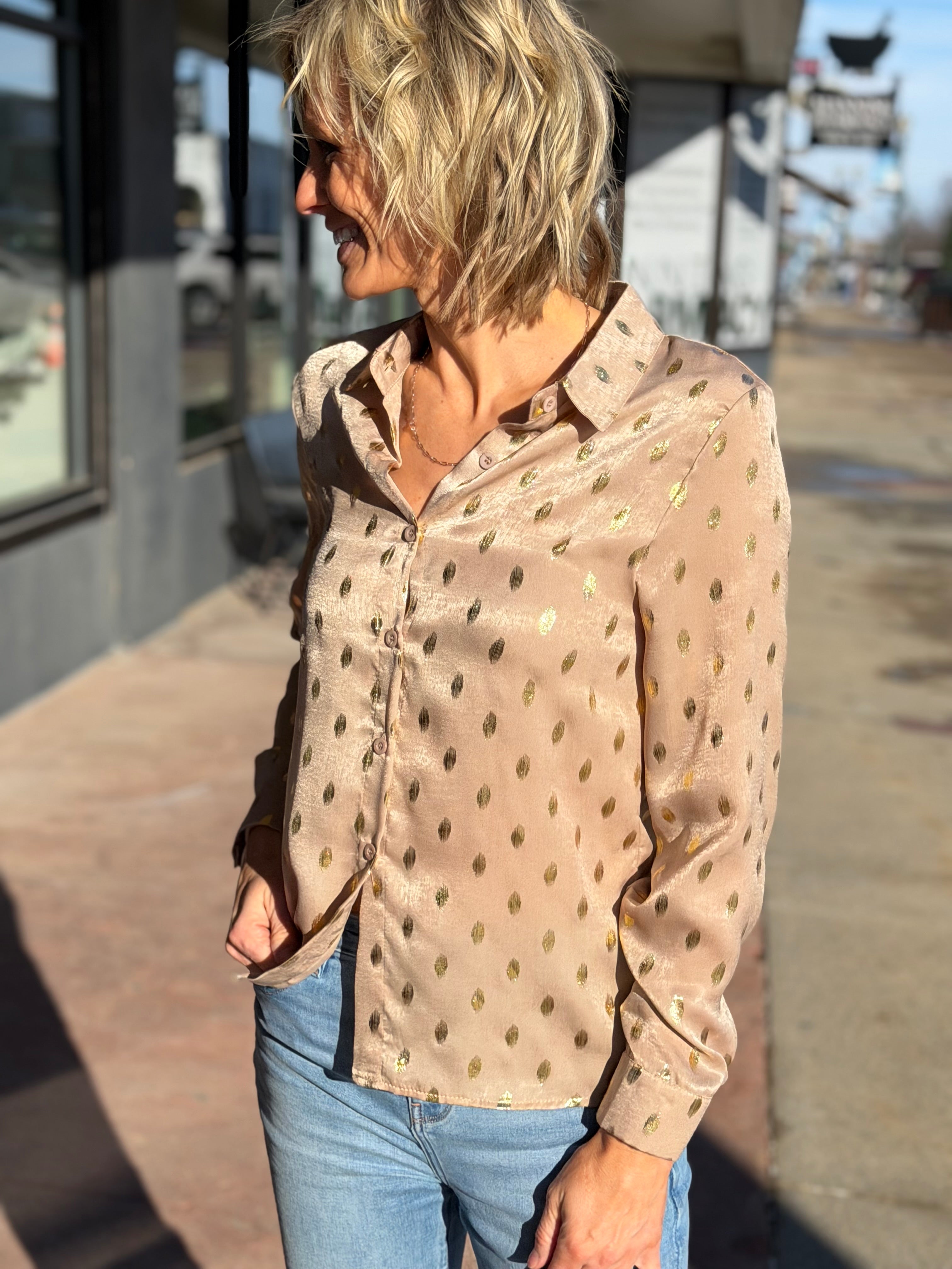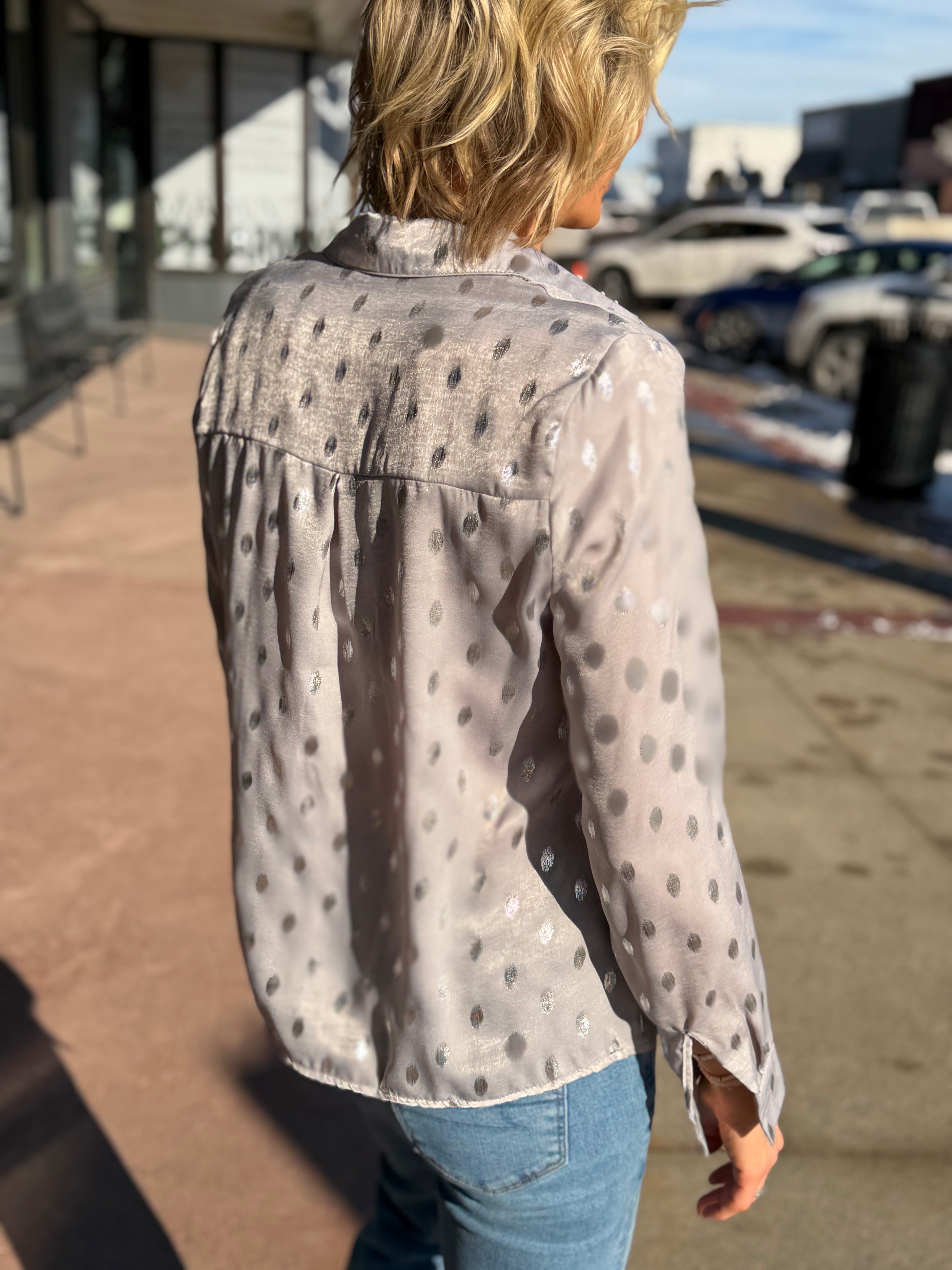 Long Sleeve Metallic Dot Button Down Top